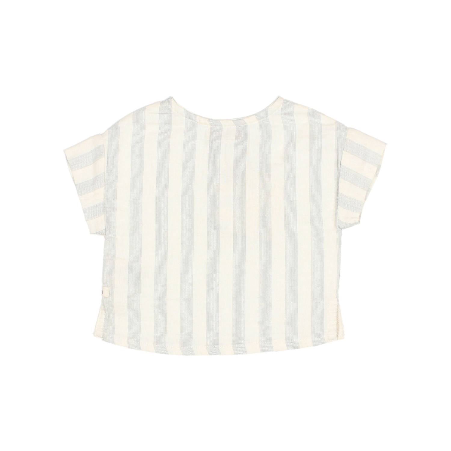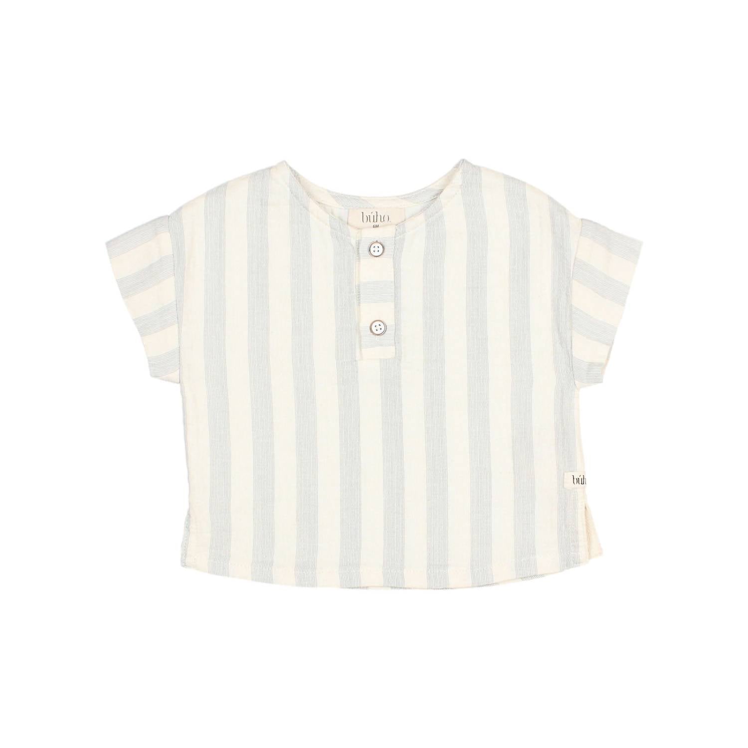 Discover the Boy's Sky Striped Gauze Shirt by Búho, a stylish and comfortable choice for your young one's wardrobe. With short sleeves and crafted from a 56% organic cotton blend, this shirt showcases a classic crewneck and features a central front opening secured by two buttons. Proudly made in Spain, the piece embodies simplicity and a warm touch with its Spanish fabric. It's a perfect pick for summer occasions, exuding quiet luxury with its tasteful design.