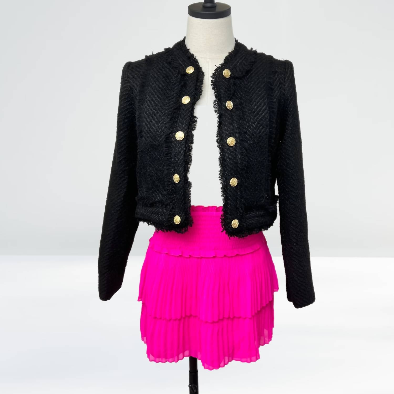 Introducing the Girls' Chelsea Skirt by Katie J NYC, a vibrant addition in Shocking Pink perfect for holiday parties. Designed with a smocked waistband and a tiered style for a playful flair. Composition includes 100% Polyester with a 100% Cotton lining. Care is simple with dry clean only instructions.