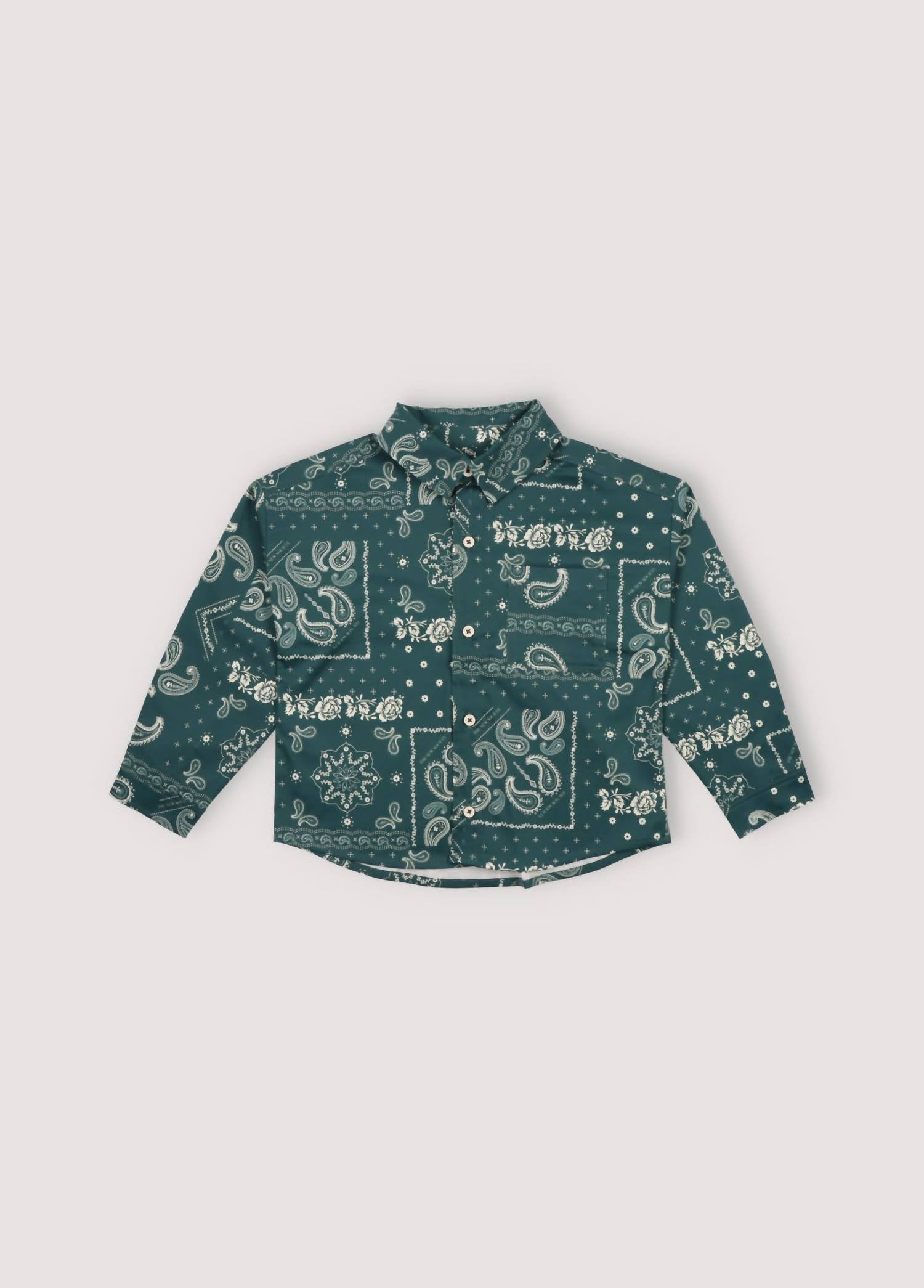 All-over green paisley print. Classic collar button-down . Pocket on the front left side. 100% Cotton. Made in Portugal.