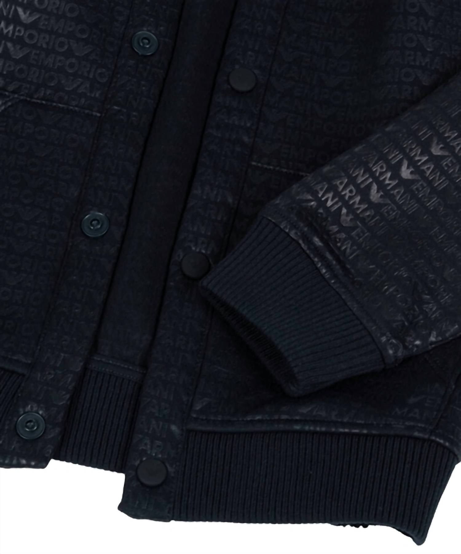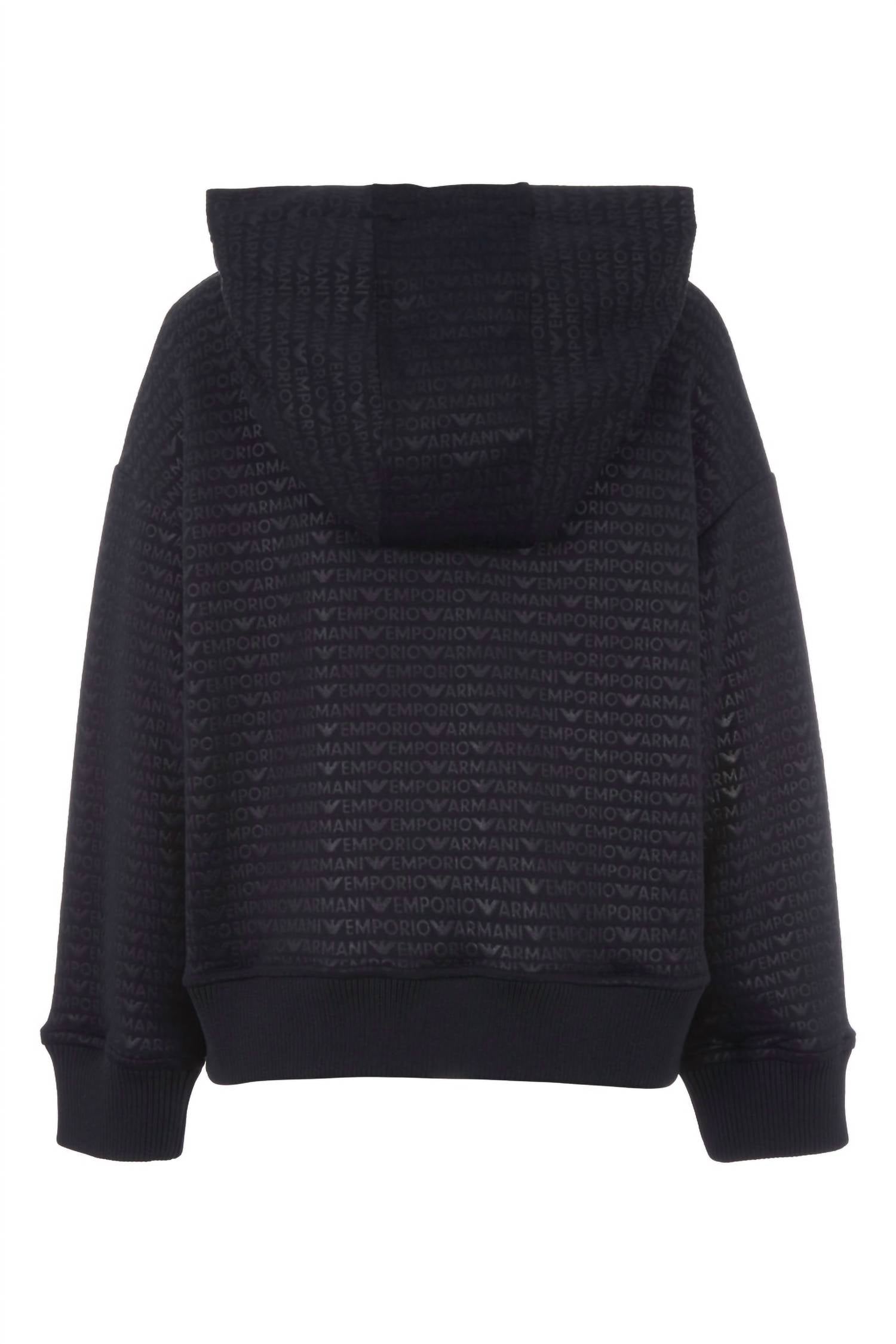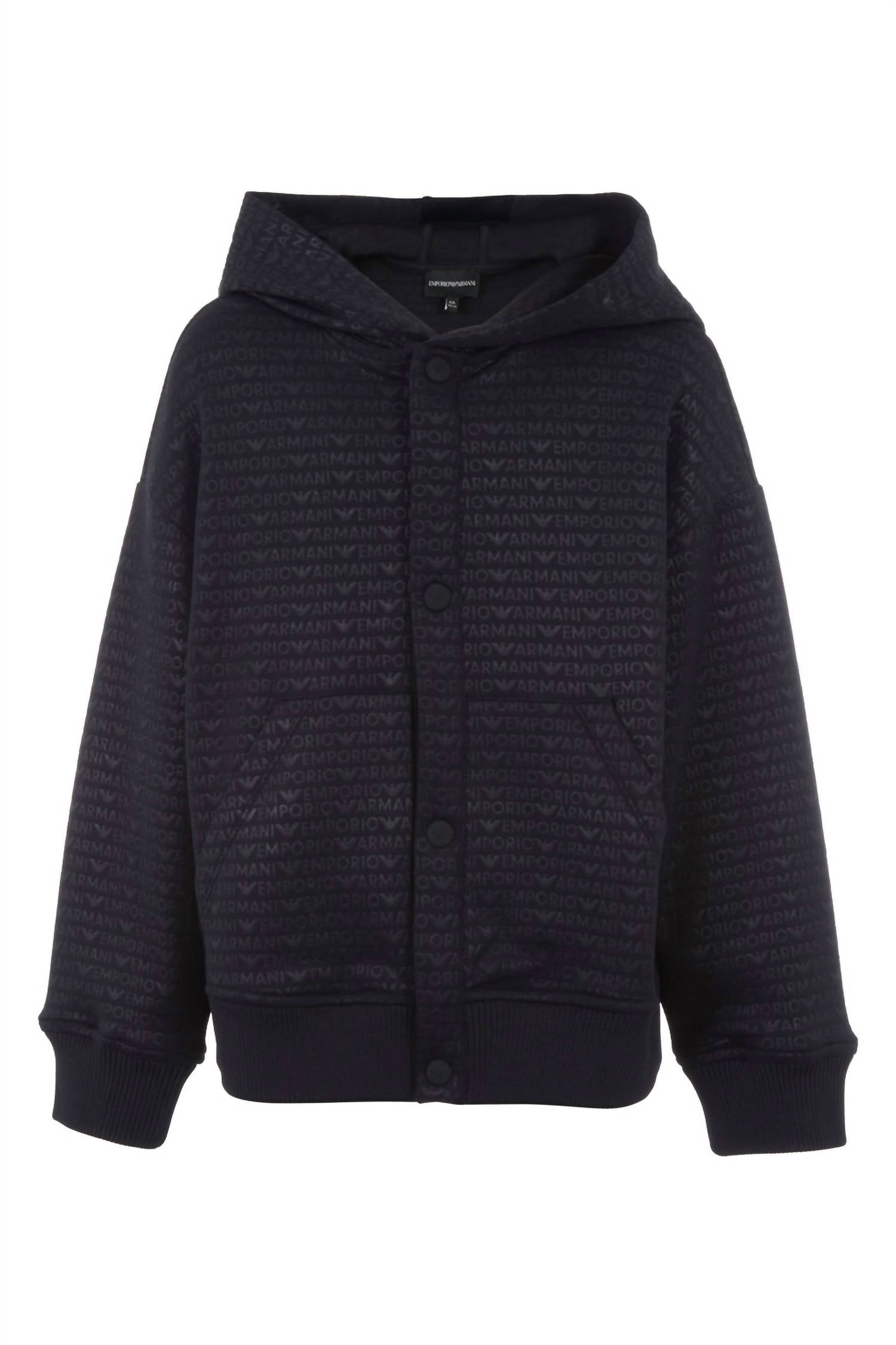 Elevate your child's wardrobe with the Boys Logo Print Button Up Hoodie from ARMANI, offering both style and practicality in classic black. Featuring a blend of 51% Polyester, 43% Cotton, and 6% Elastane, this jacket ensures comfort and a slight stretch for active days. Closure: Button up, accentuated by the iconic Emporio Armani logo for brand authenticity. An ideal choice for everyday wear with a touch of prestige.