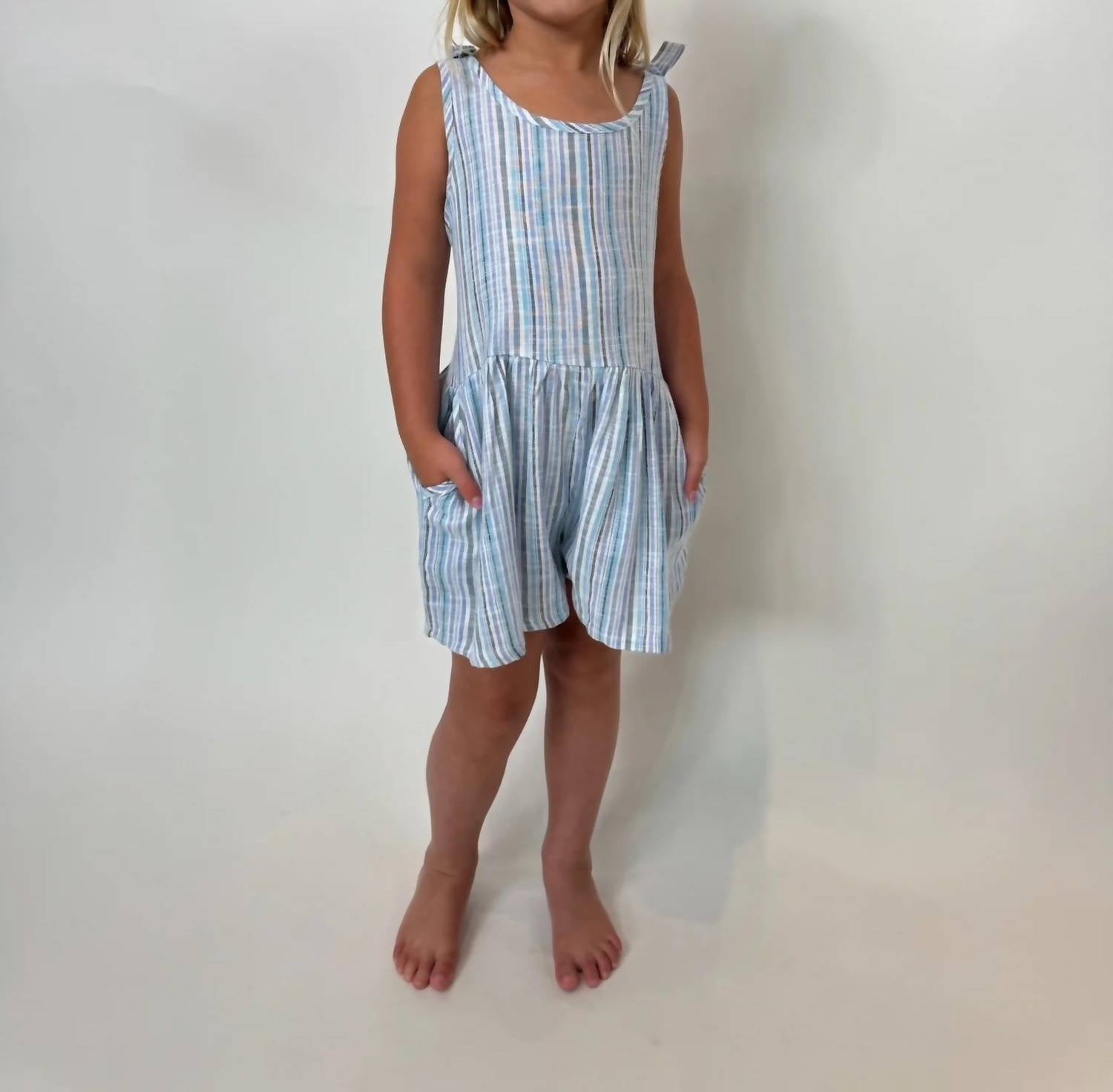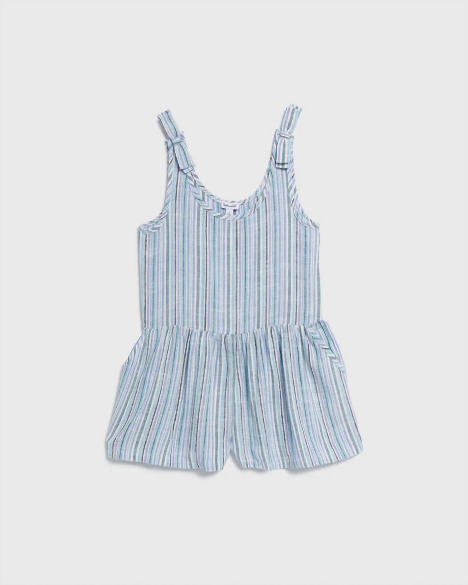 Introducing the Splendid Girls Splash Stripe Romper, an ideal choice for summer outings with its relaxed fit and elastic waist ensuring all-day comfort. This adorable romper in blue stripe is crafted from an 82% Viscose and 18% Linen blend, offering a breathable feel perfect for sun-filled days. Designed with a playful stripe pattern, it's a go-to pick for casual vacations or holiday festivities. Care instructions are simple: Machine wash cold.