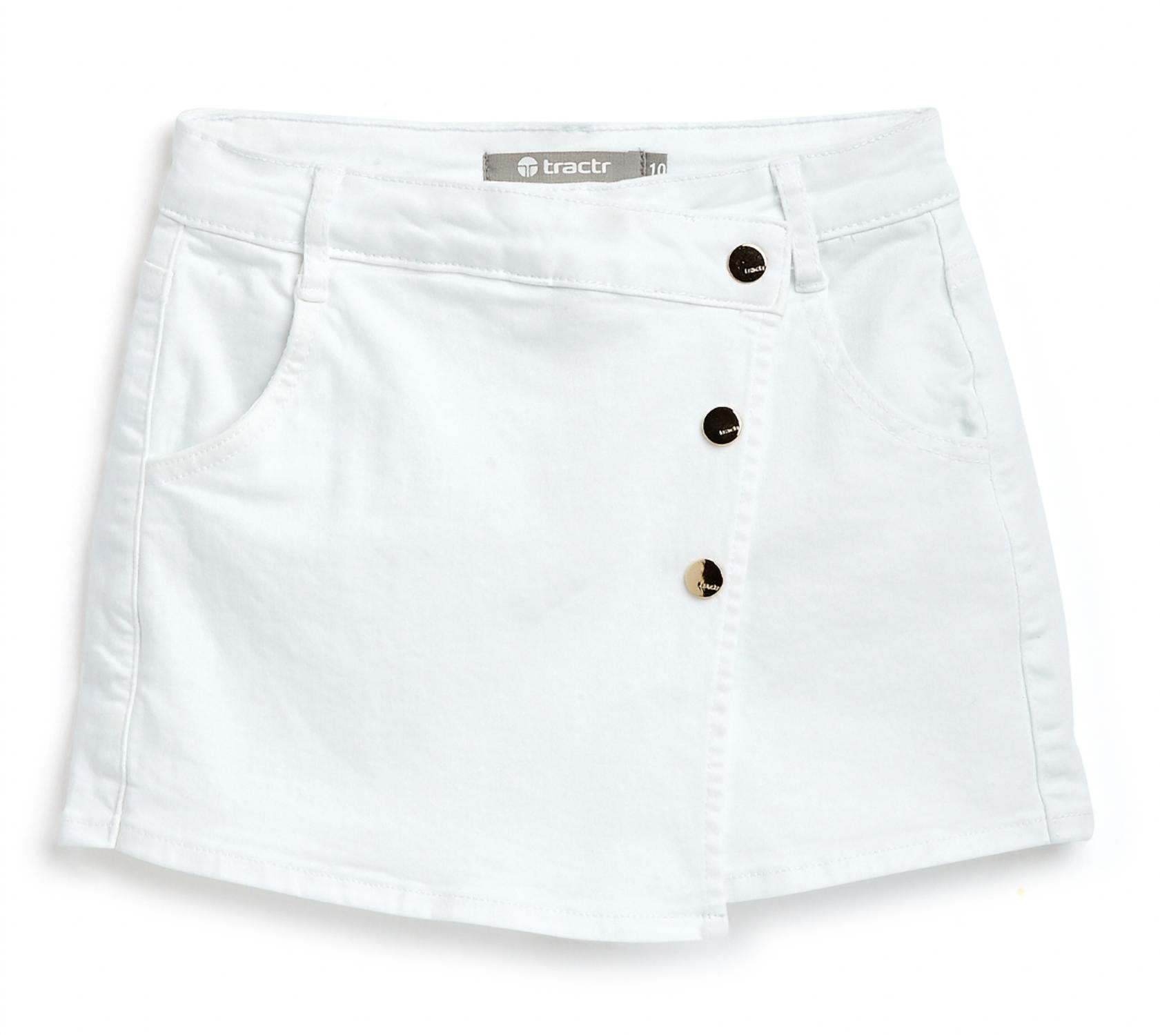 Denim skort with gold buttons. Has pockets. Belt loops. True to size. Comfortable and relaxed fit.