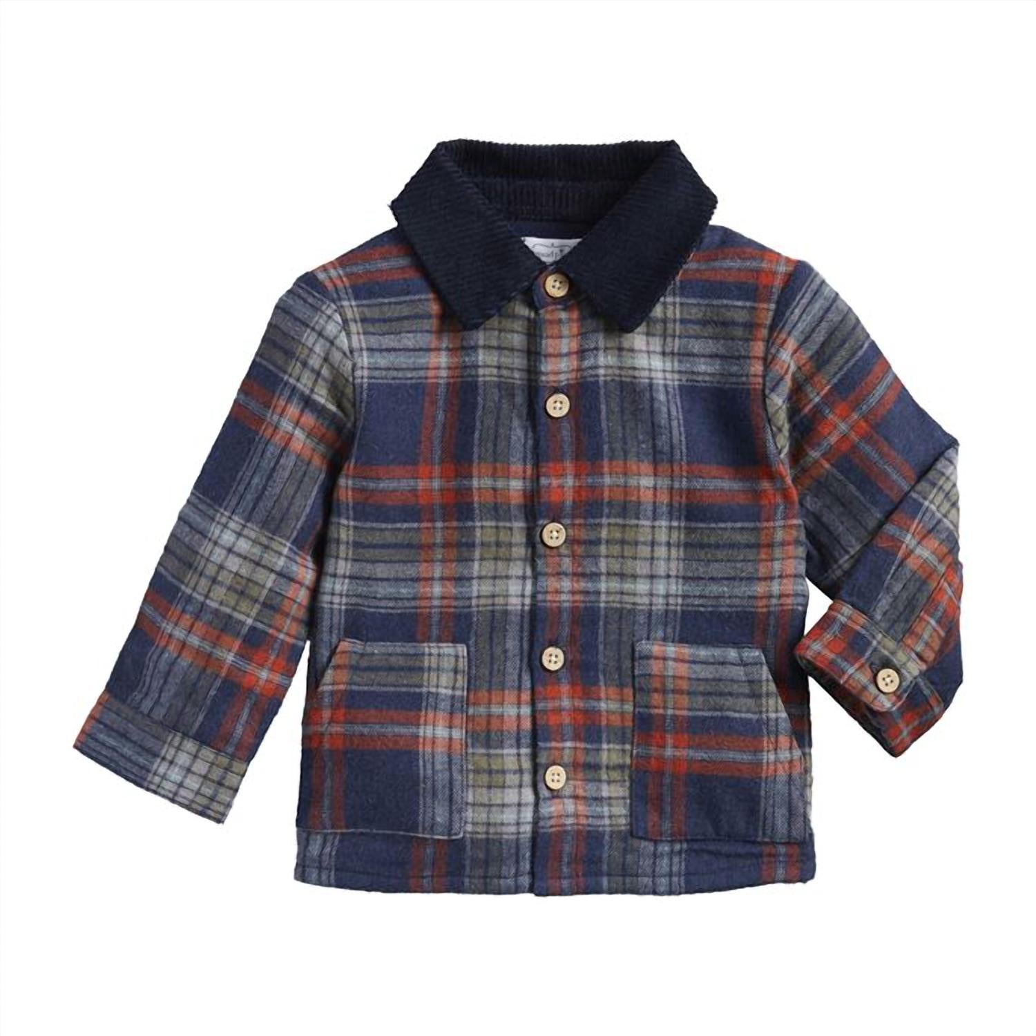 Introducing the Boy’s Plaid Shacket by Mudpie, a stylish blend of rust and olive in a lined flannel design. Made with a composition of 55% rayon and 45% cotton, with a lining of 60% cotton and 40% polyester. This casual jacket features a unique corduroy collar and convenient coconut wood button closure. Ideal for adding a cozy layer with a touch of rustic charm to any outfit.