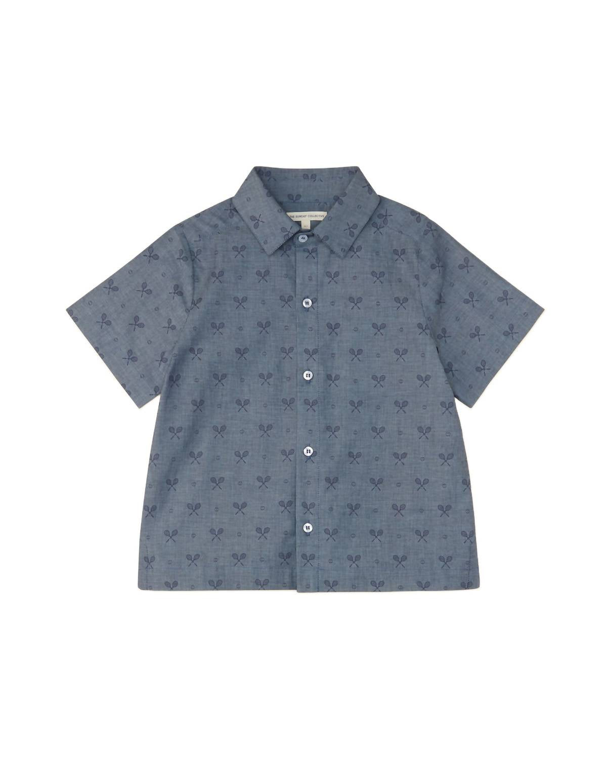 Introducing the Boys Boardwalk Shirt by The Sunday Collective, a charming piece for your child's warm-weather adventures. Crafted from 100% Poplin Cotton, this blue button-down shirt features a playful tennis print ideal for spring activities. Perfect for birthdays and Christmas celebrations, it combines a minimalist trend with effortless style. Hand wash and line dry for lasting comfort and durability.