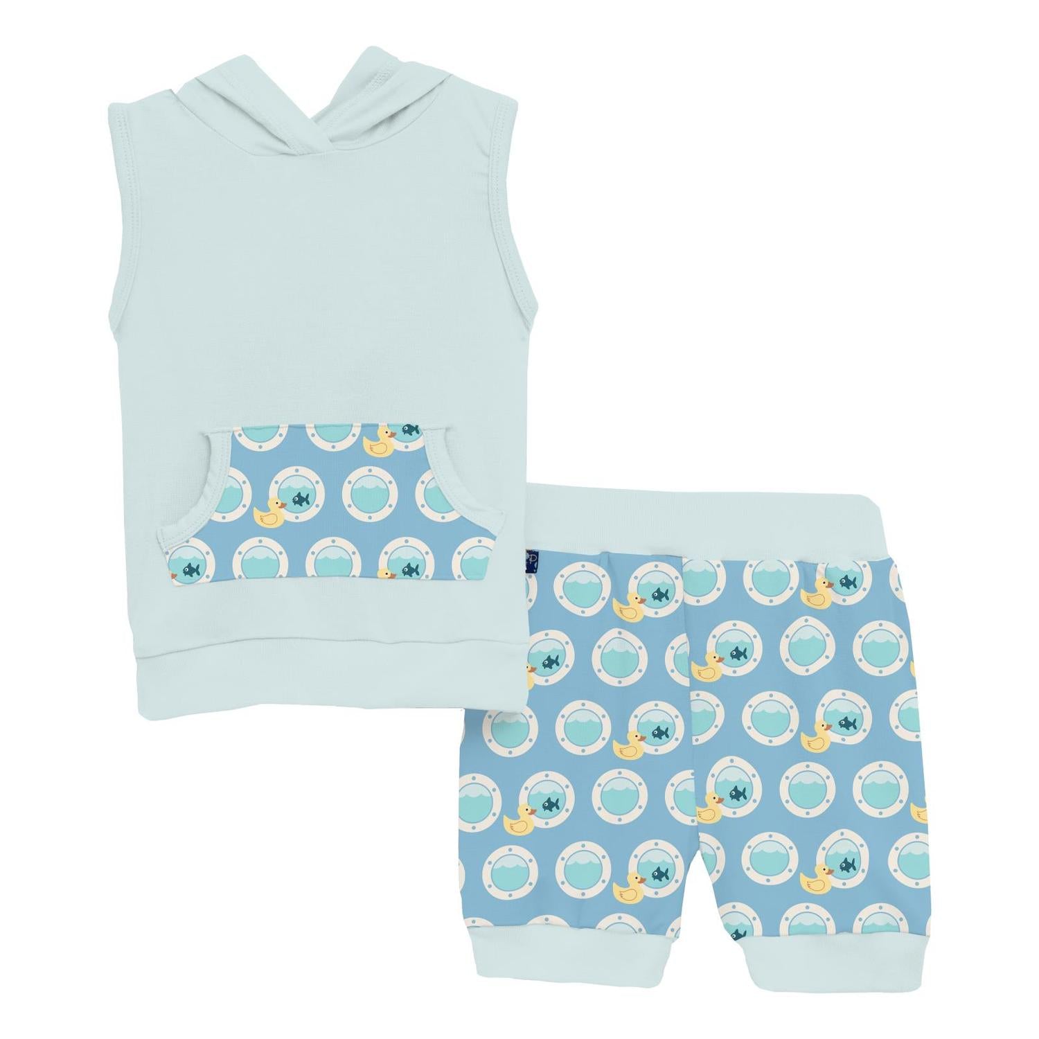 Keep your little one comfortable and stylish with the KICKEE Baby's Short Sleeve Hoodie Tank Outfit Set in Seaside Blue Porthole Rubber Ducky. This matching set features a sleeveless design, crafted from a buttery-soft 95% Viscose from Bamboo and 5% Spandex blend that is lightweight and breathable. With a kangaroo-style pocket and a secure, comfy fit, it's perfect for sunny days with a UPF 50+ rating. Easy to care for, the set is machine washable on a gentle cycle and can be tumble dried on low.