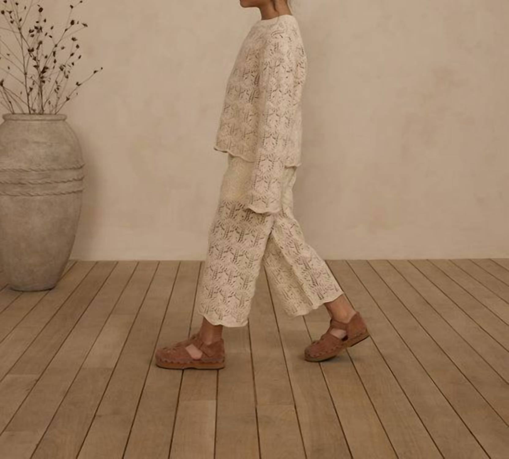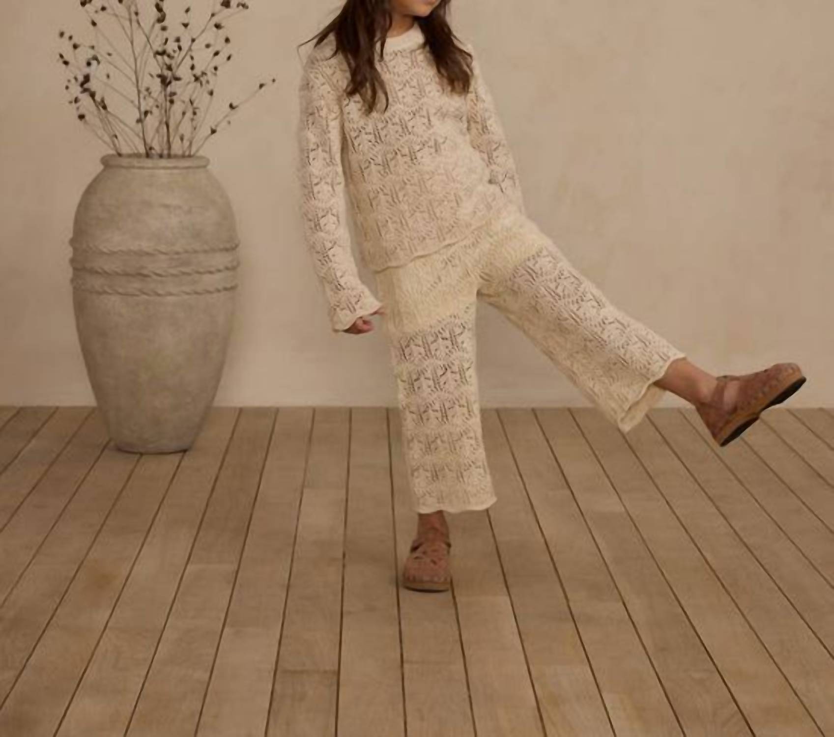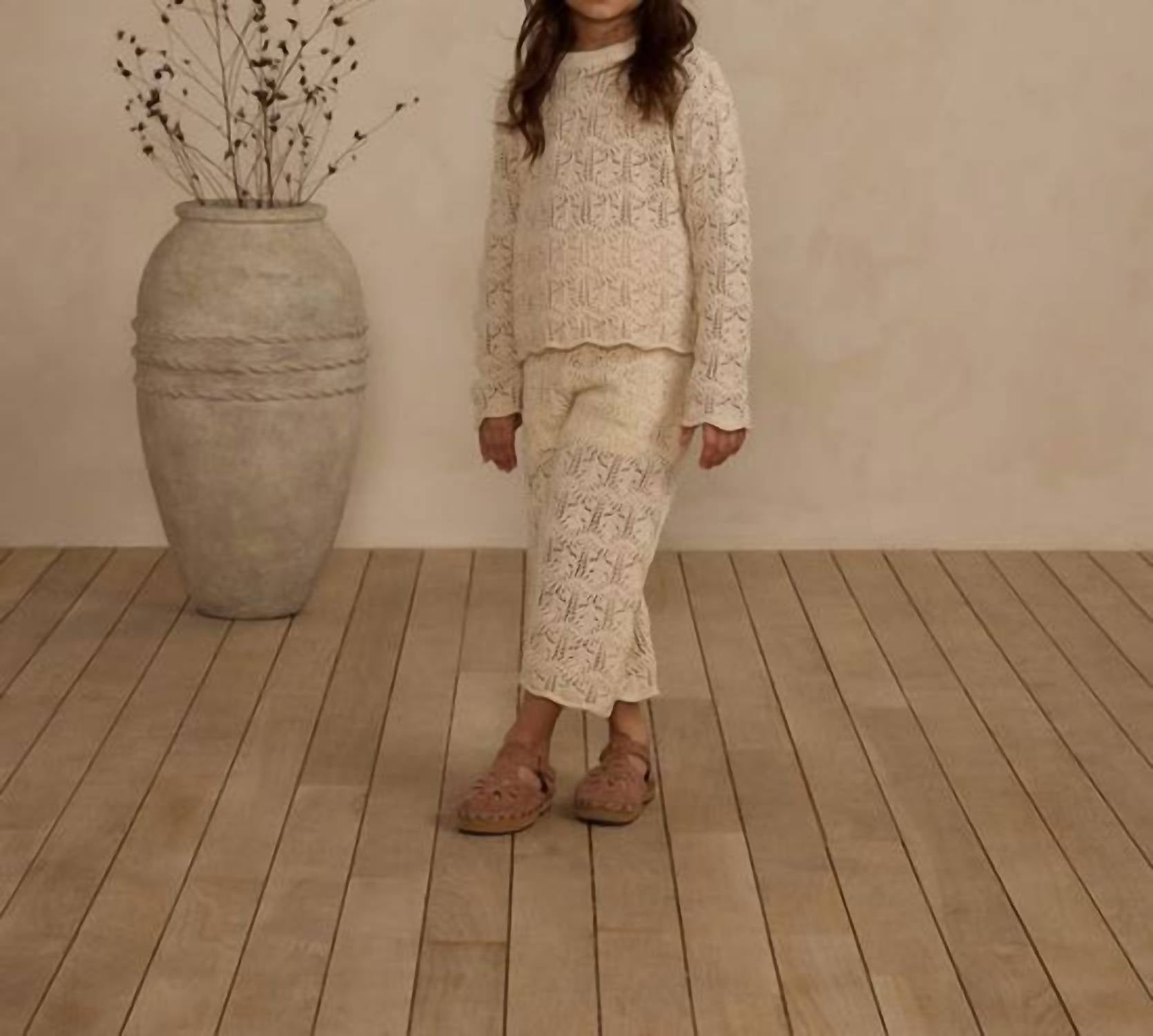 Elevate your child's wardrobe with the Crochet Knit Pant by Rylee + Cru, a textured piece in a natural hue that's perfect for casual outings. With a ribbed waistline, scallop hem, and a comfortable short liner, this pant blends comfort with boho chic style. Crafted from 100% cotton with a lining of 95% cotton and 5% elastane, these pants are a perfect spring staple for any occasion. Care instructions include machine washing cold and laying flat to dry for best results.