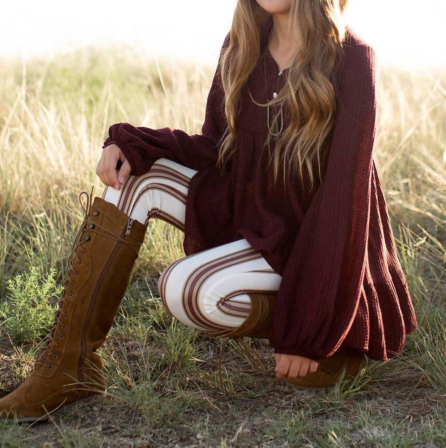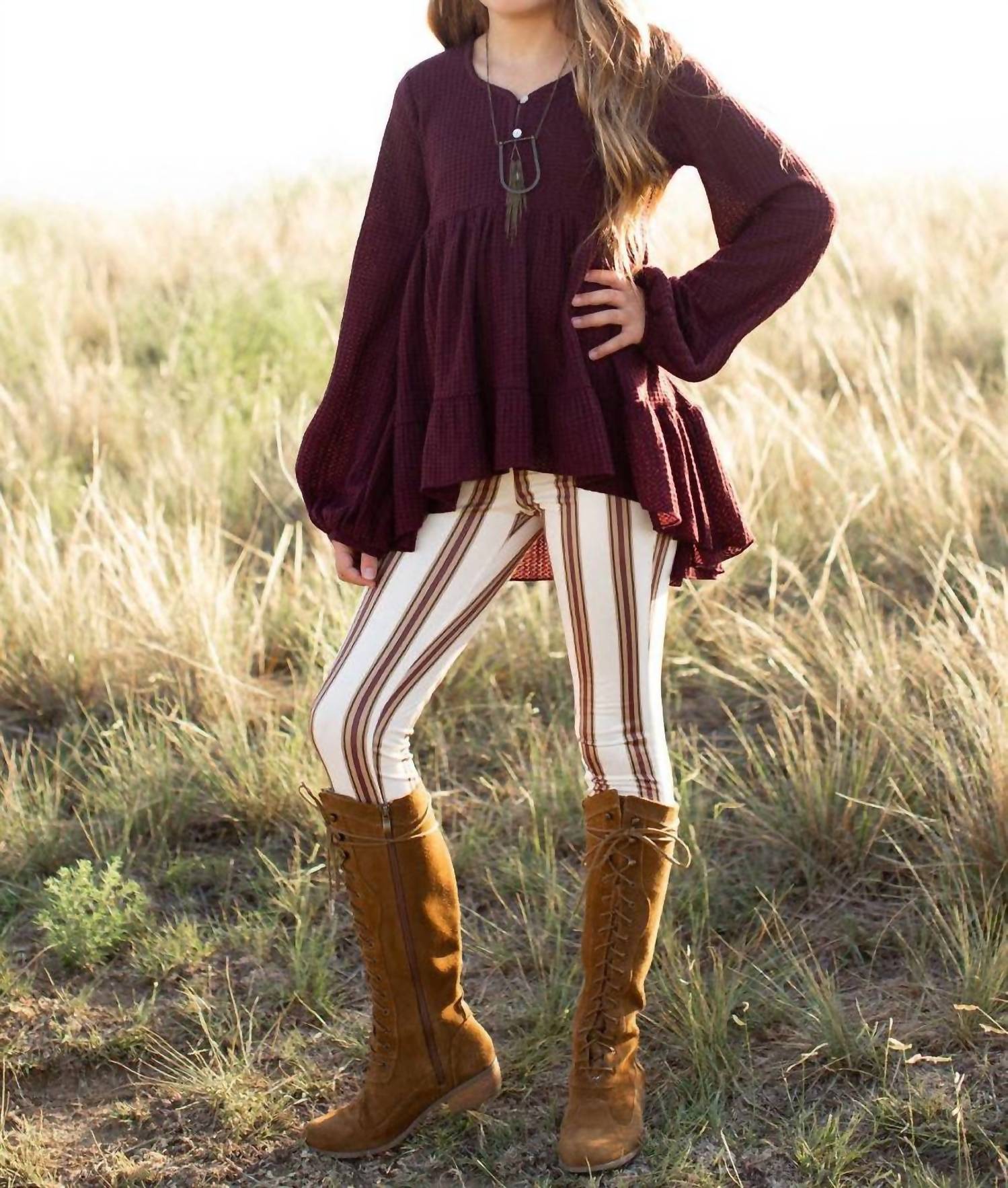 Introducing the Girl's Victoria Stripe Leggings by Joyfolie, a perfect blend of comfort and style in a boho chic design. These brown leggings feature a stripe pattern with a lettuce hem and an elastic waistband for an easy fit. Crafted from 95% polyester and 5% spandex, they offer flexibility and durability. Care: Hand wash only, line dry. Available for shipping in 1-3 business days.