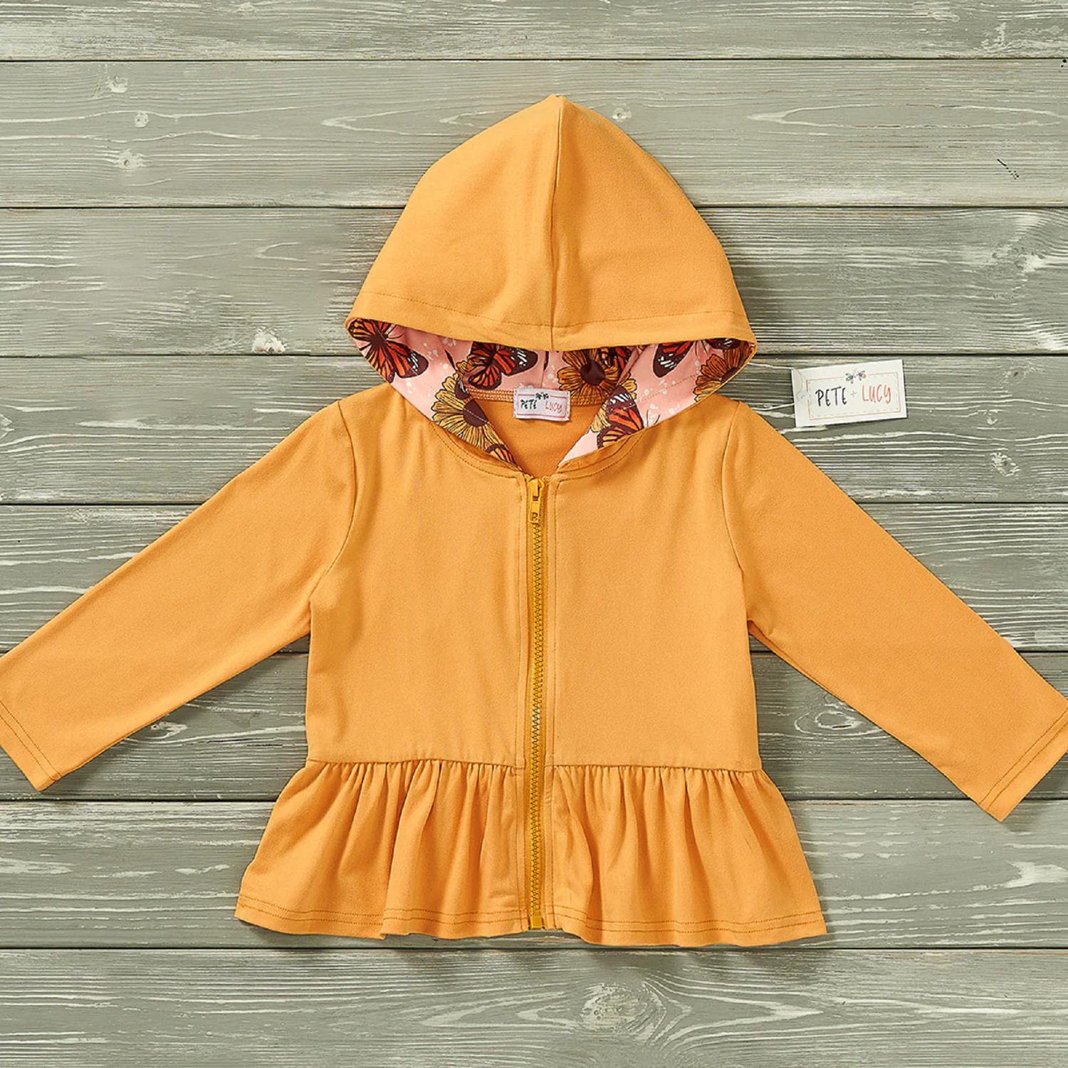 The Jocelyn Hooded Jacket by Pete + Lucy is a charming addition to any girl's wardrobe in a vibrant yellow shade. This solid-pattern sweatshirt offers a classic hooded design, perfect for layering during cooler days. Made for young fashion enthusiasts, this jacket pairs easily with various outfits.