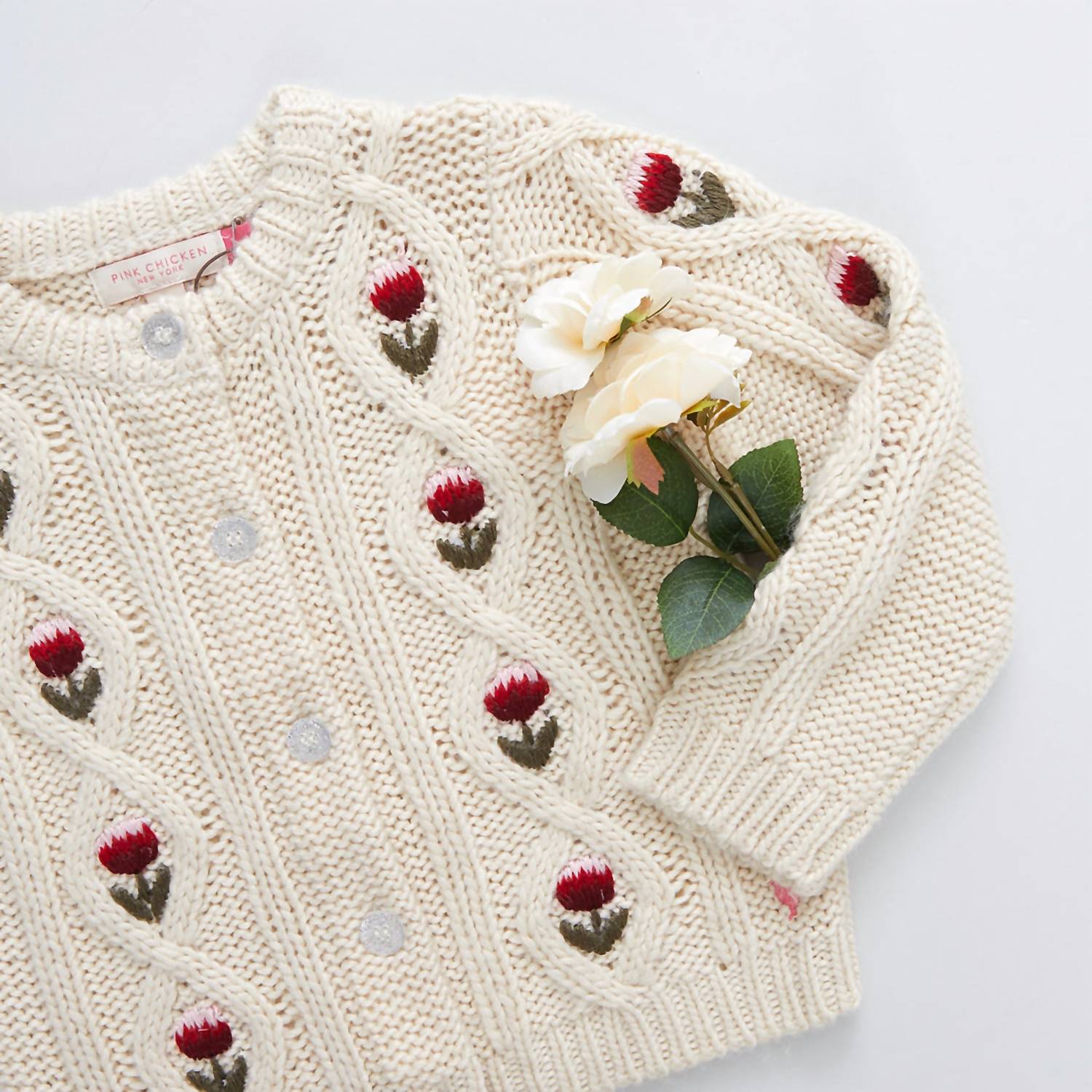 A charming sweater designed with a playful floral motif and delicate embroidered details, bringing both coziness and style to a young wardrobe. Perfect for layering or wearing on its own, it blends comfort with a touch of whimsy, making it a versatile piece for everyday wear or special occasions.