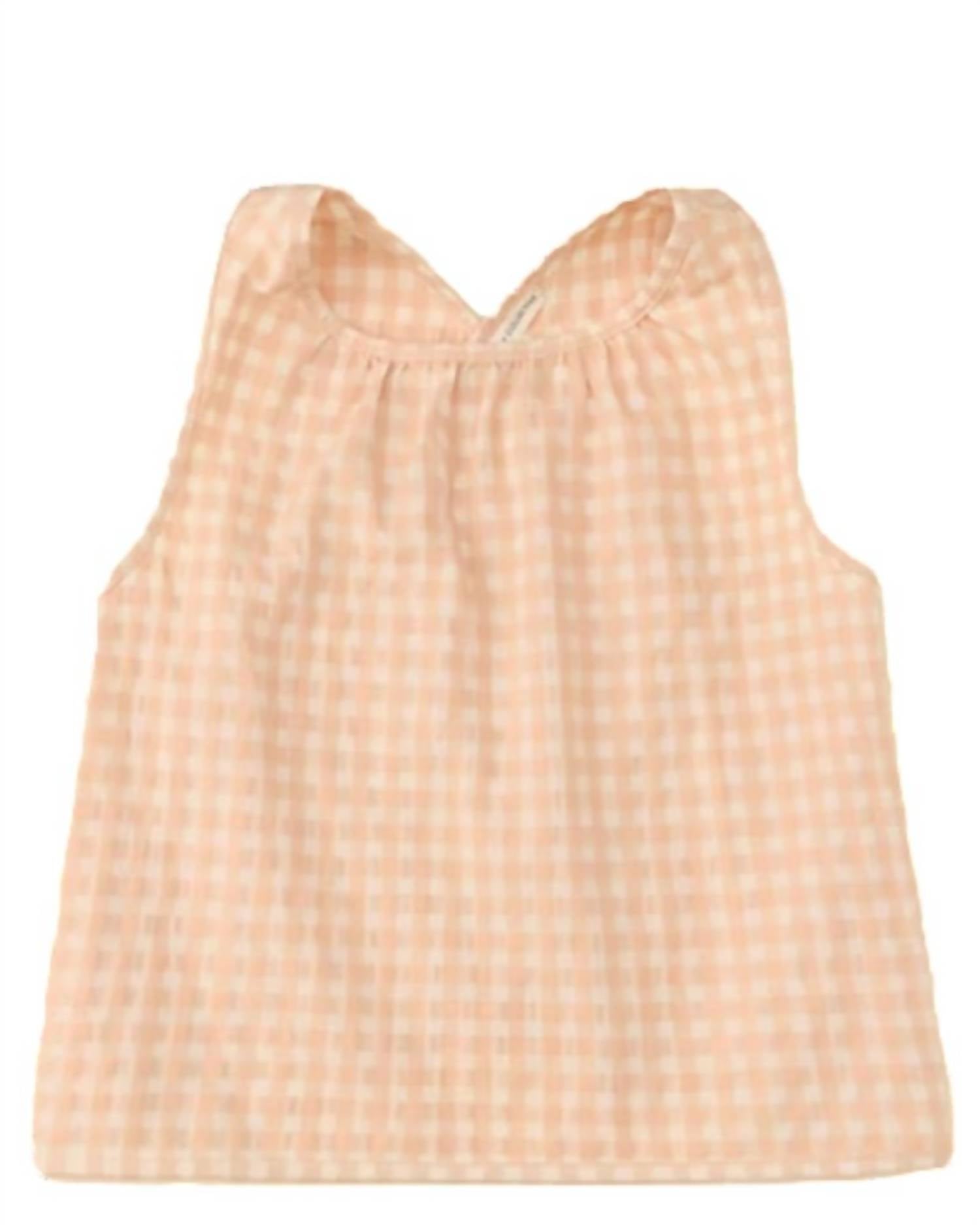 Introducing the Girls Gingham Tank Top by The Sunday Collective, a charming addition with an apron back in a delightful shade. Crafted from a breezy seersucker blend of 60% Cotton and 40% Polyester, perfect for summer festivities. Made in Portugal, it's designed to keep her cool and stylish on special occasions. Care instructions include machine wash cold, do not bleach, tumble dry low, and cool iron if needed. Model is pictured wearing a size 6-7 (49.5" tall).
