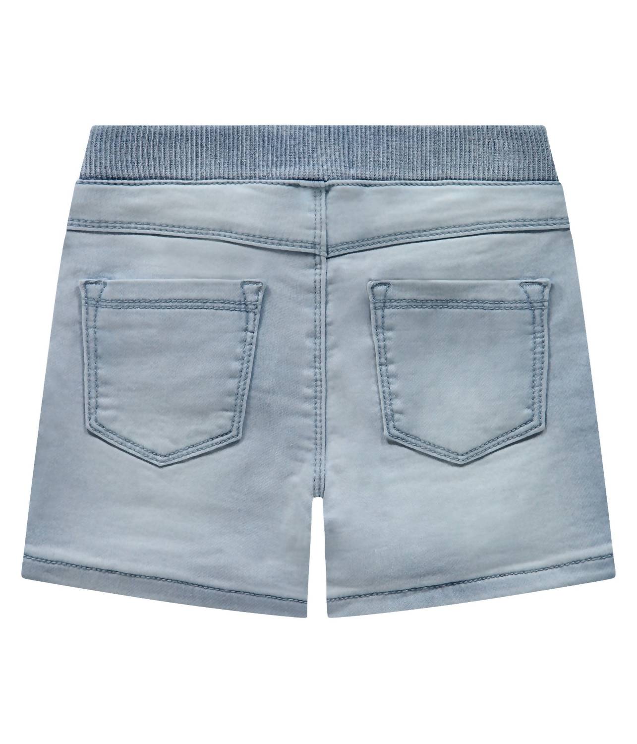 Introducing the Baby Boy's Jogg Denim Short by Babyface in a chic light blue perfect for summer holidays. These shorts offer a soft, stretchy, and lightweight feel with an elastic waistband for comfort, paired with a single snap button closure and a faux front fly. The composition is a cotton blend with 85% Cotton, 14% Polyester, and 1% Elastane. Care instructions include machine wash cold separately, inside out, and line dry for lasting quality.
