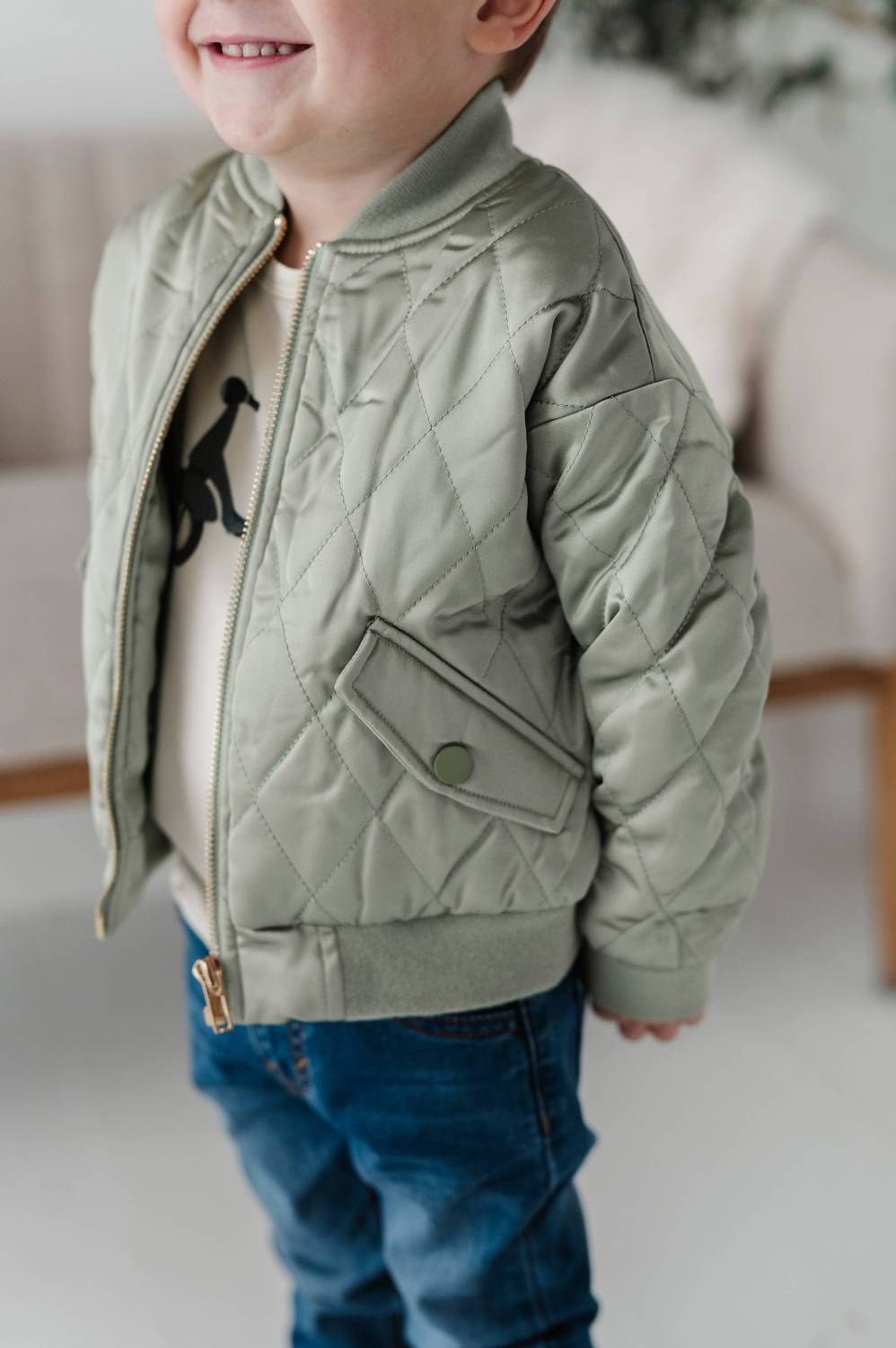Experience the stylish flair of Babysprouts' Classic Bomber Jacket in a chic Light Sage shade. Expertly crafted with detailed stitching, this jacket is made from high-quality polyester, ensuring both comfort and durability. Proudly designed in the US, it has an exclusive design that fits true to size for a sleek and polished look. Perfect for casual outings, this jacket adds a touch of elegance to any outfit.