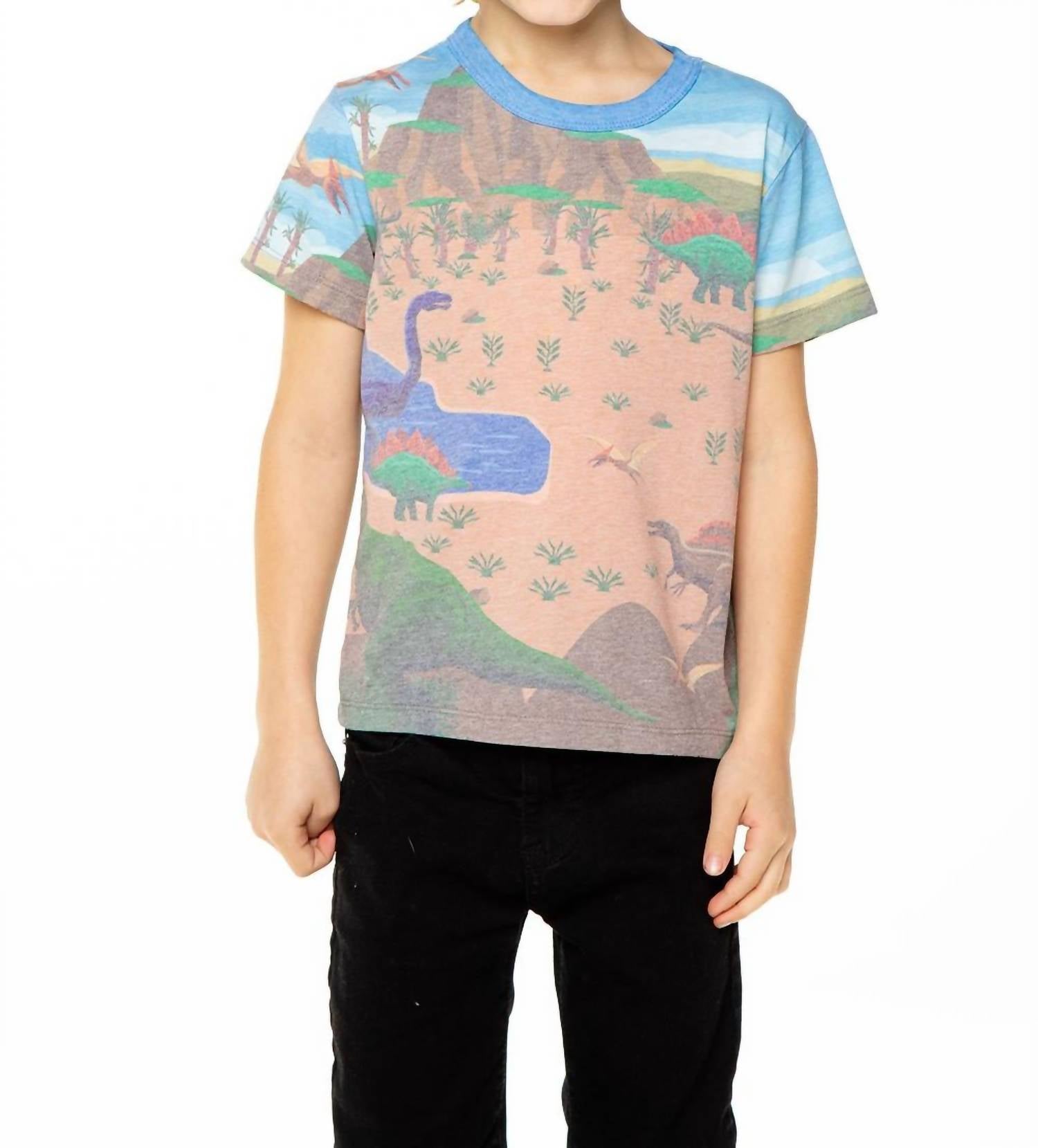 The Boy's Dino Habitat Tee by Chaser is a vibrant piece that effortlessly blends fun and comfort. Crafted from soft, breathable fabric, this short sleeve tee ensures your little one stays cool and comfortable all day long. The captivating backdrop is adorned with an imaginative dinosaur habitat print that’s perfect for sparking adventures and playful scenarios. This tee not only adds a pop of color to your boy’s wardrobe but also inspires curiosity and imagination. Whether it's a day at the park or a casual outing, this versatile piece is designed to fit seamlessly into any activity while reflecting a love for prehistoric wonders.