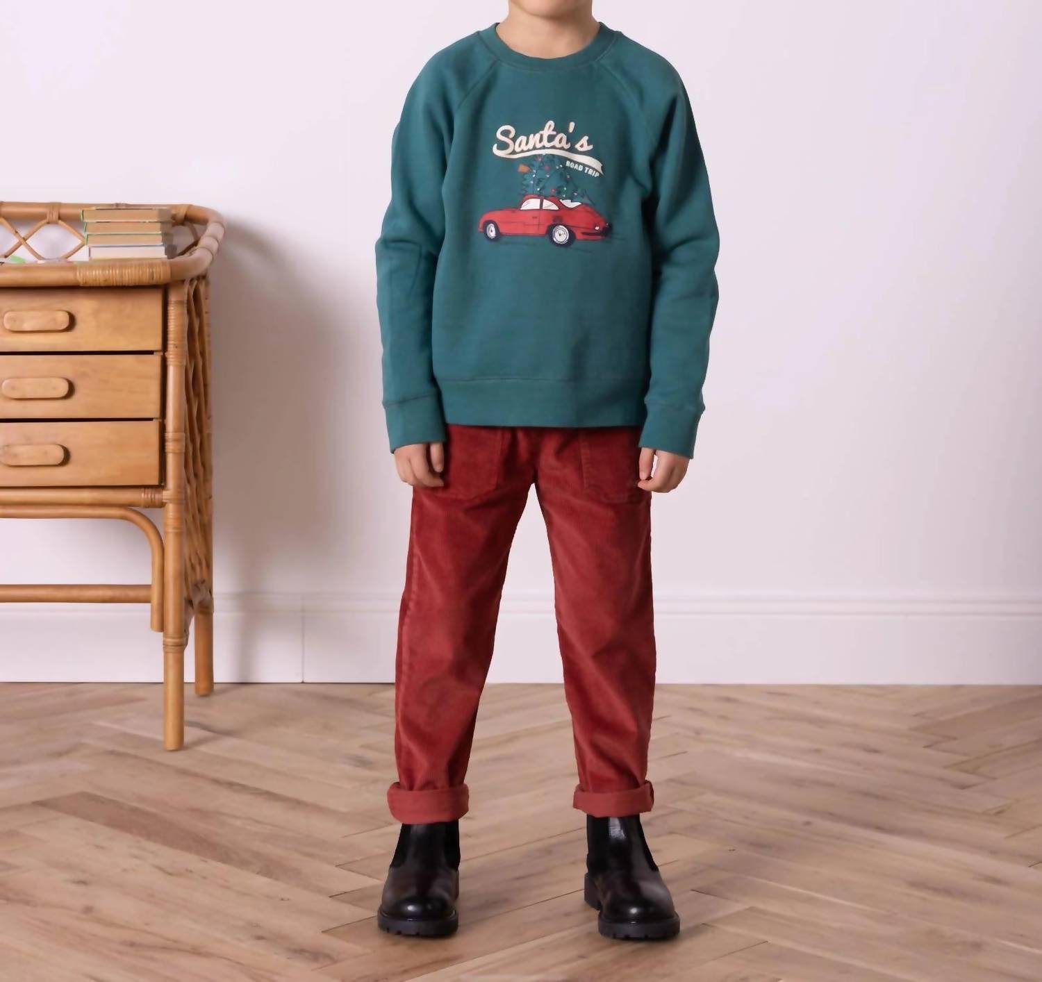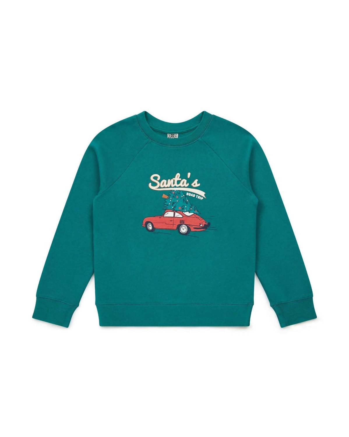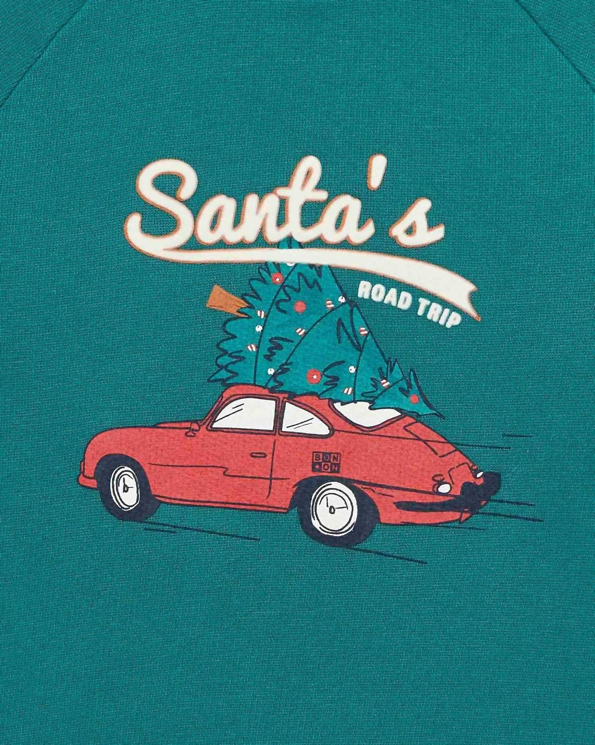 Embrace cozy style with the Santa's Road Trip Fleece Sweatshirt by BONTON, crafted from 100% cotton fleece. This River Green sweatshirt offers gentle warmth with a playful graphic print, designed exclusively in the BONTON design studio.