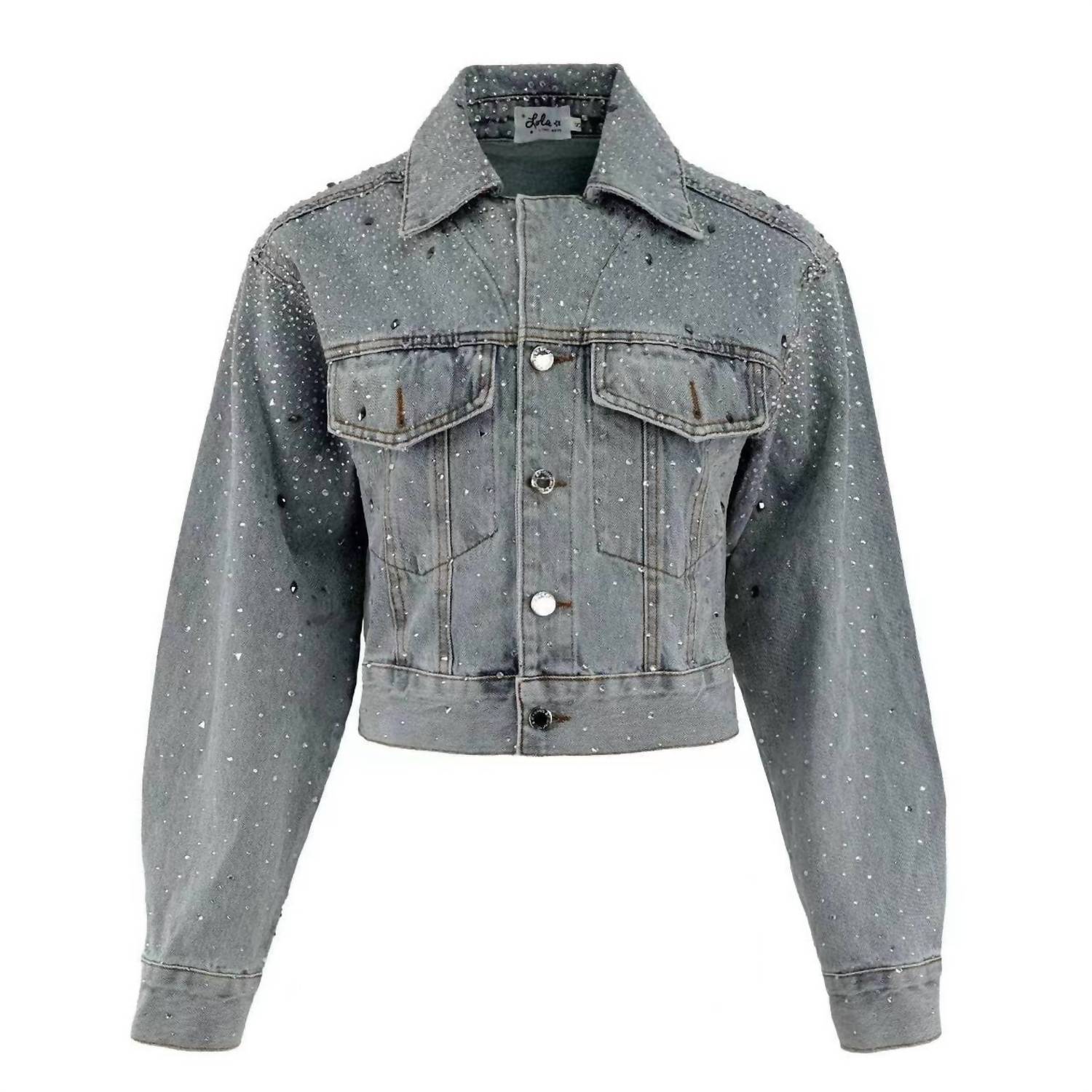 Enhance your wardrobe with the Crystal Bow Denim Jacket by Lola + The Boys, designed for a striking look. This blue jean jacket features a stunning crystal bow on the back, adding a touch of glam to any outfit. It's crafted from a high-quality cotton blend with crystal embellishments, ensuring durability and style. Care for this unique piece by spot cleaning with a damp cloth and storing in a cool, dry place.