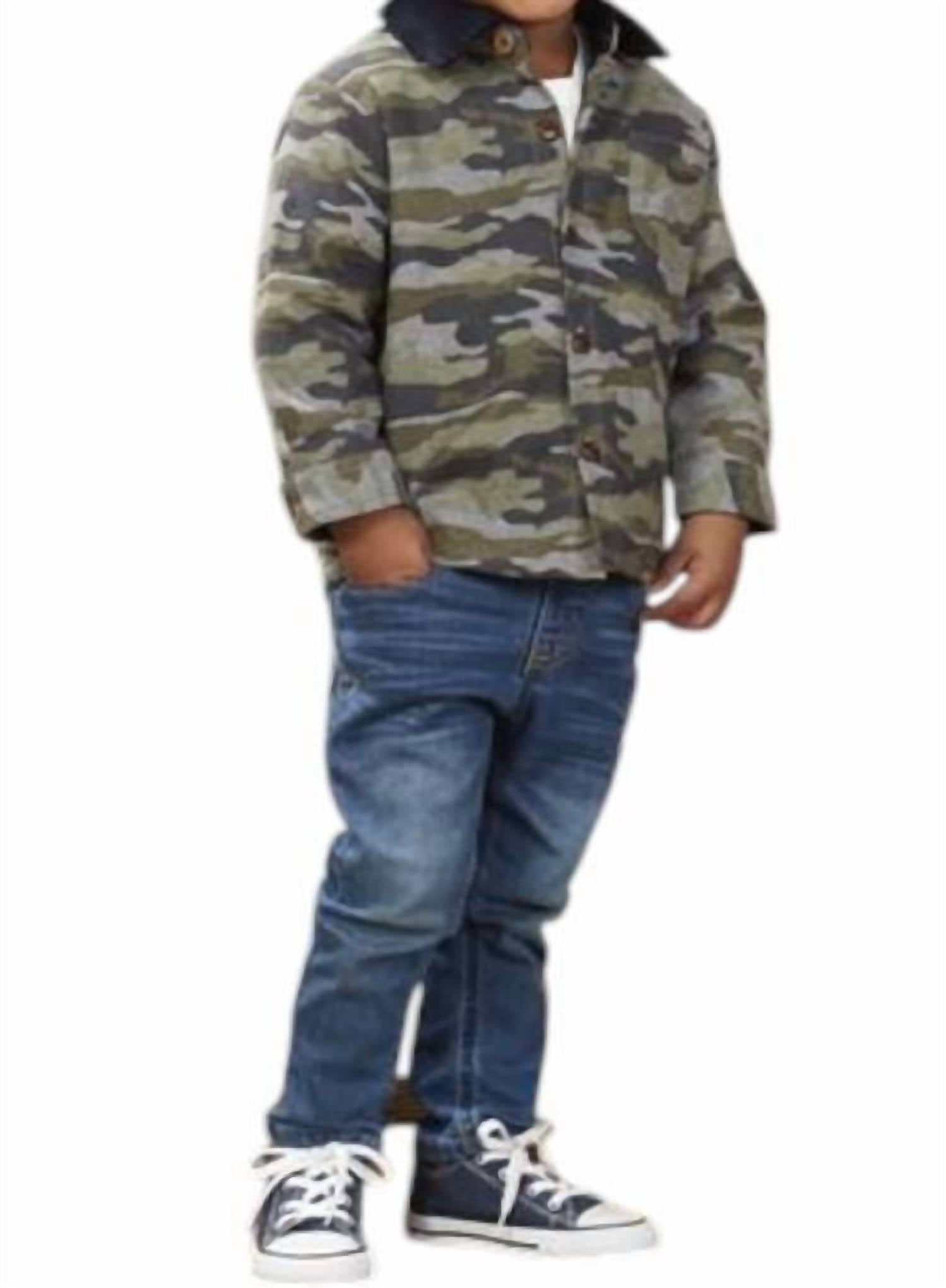 Introducing the Boy’s Camo Shacket by Mudpie, a versatile casual jacket perfect for layering. This lined flannel shacket features a stylish corduroy collar and is fastened with unique coconut wood button closures. Composed of 65% cotton, 35% polyester, with a lining made from 60% cotton, it offers both durability and comfort. Ideal for adding a touch of rugged charm to any outfit.
