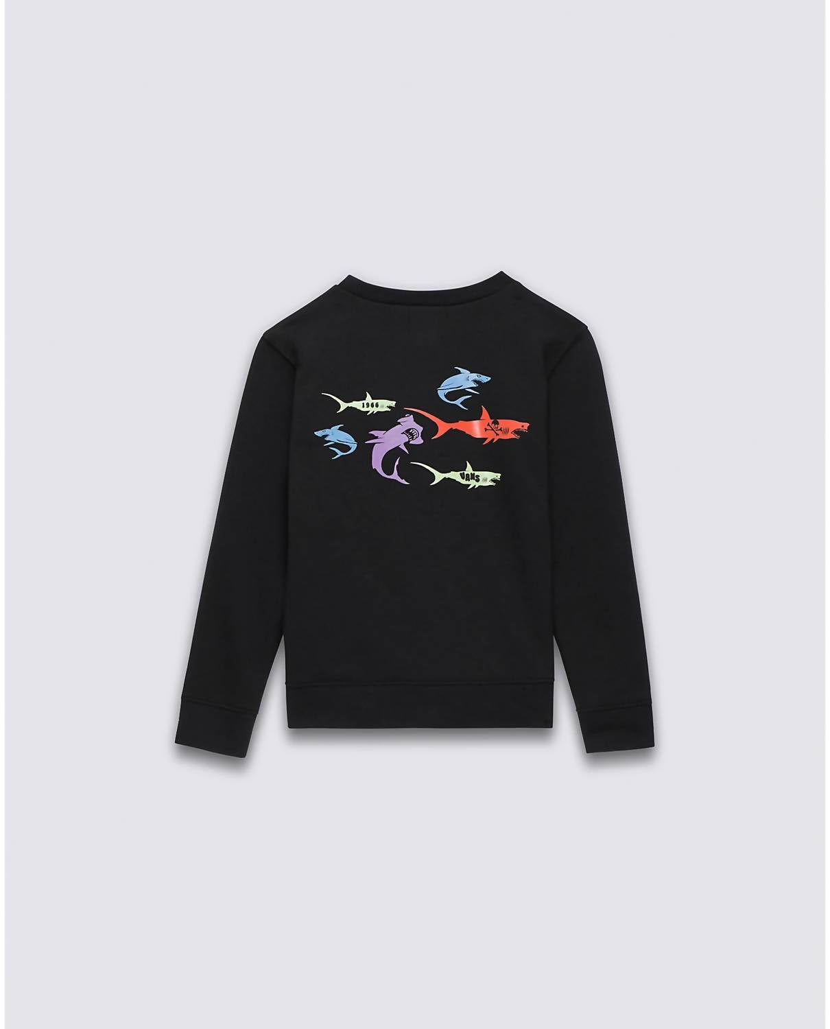Introducing the Vans Little Kids Pack Crew Sweatshirt, a perfect choice for game day in the fall. This cozy long-sleeve sweatshirt features a glow-in-the-dark graphic design of a screen-printed shark with the Vans logo on the front and a pack of sharks on the back. It's a stylish piece for boys, offered in a classic black hue. Care: Machine wash.