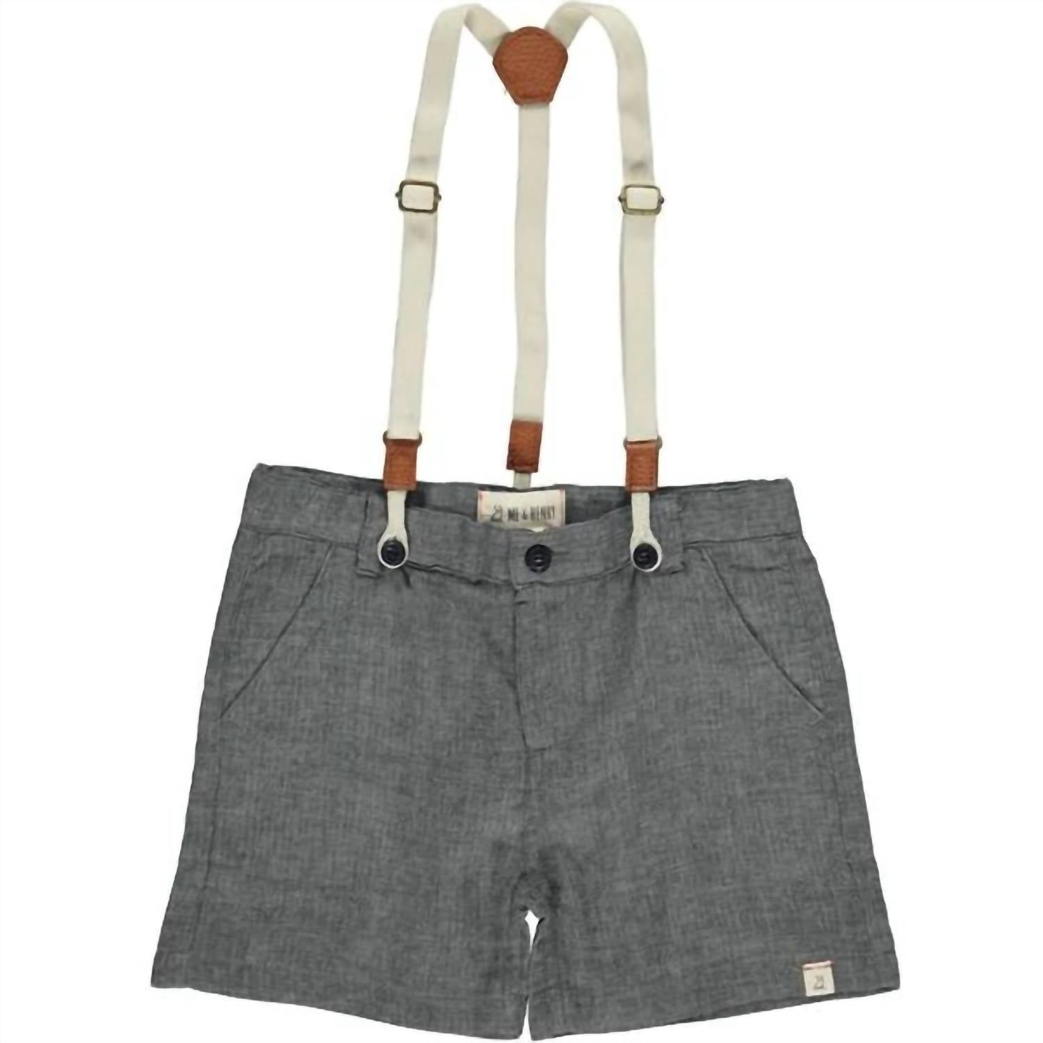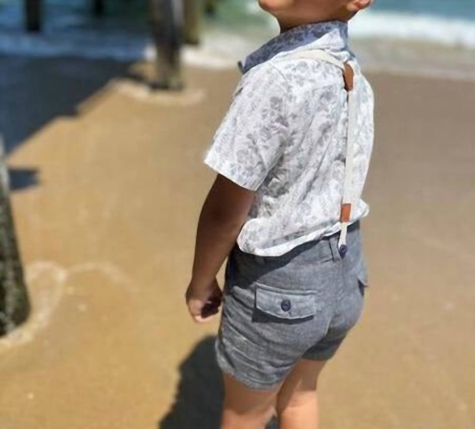 Elevate your little one's summer wardrobe with the Boys' Captain Short With Suspenders by ME & HENRY, crafted in buttery soft gauzy grey cotton. Tailored with fine contrasting black button details, it features angled front pockets, belt loops, and a buttoned patch pocket. Designed for versatility, these shorts come with an adjustable waist and detachable suspenders with faux leather accents. Care for them with machine wash cold and lay flat to dry instructions.