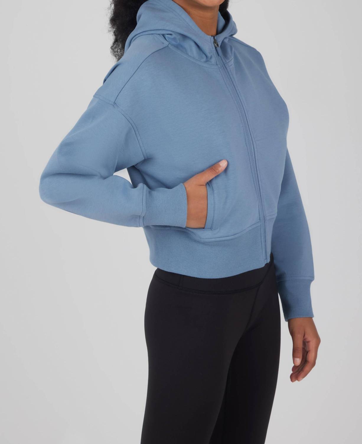 Introducing the Girls Scuba Full Zip Hooded Jacket by 90 Degree by Reflex, designed for year-round use in a striking Coronet Blue. With long sleeves crafted from a cotton-blend of 68% Cotton, 26% Polyester, and 6% Spandex, this hoodie offers optimal comfort and resilience. The full zip closure and built-in pockets add practicality, making it perfect for school and outdoor activities like camping. Care for this jacket with a simple machine wash cold, and lay flat to dry with no heat.