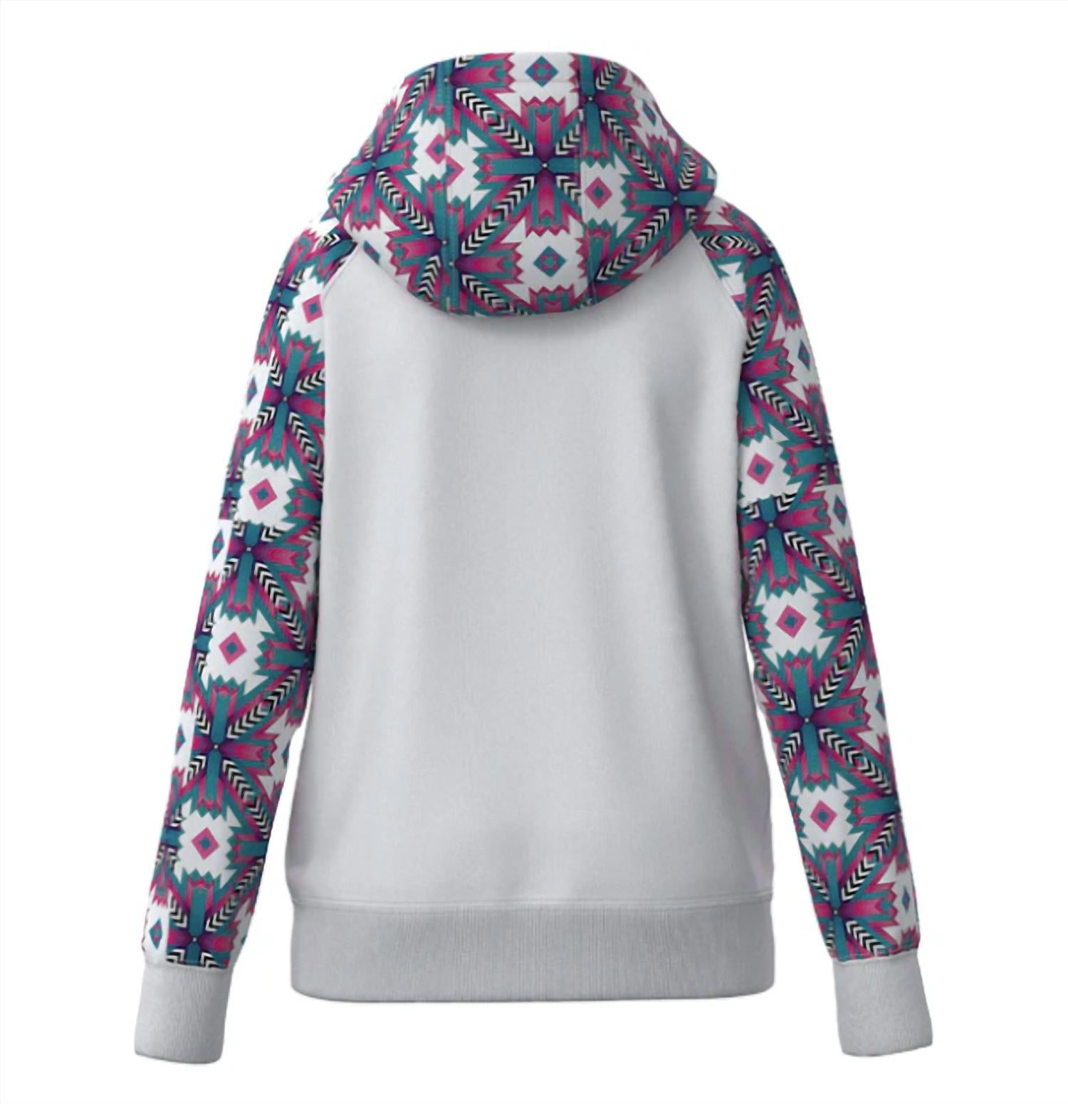 The Kid's Rope Like A Girl Hoodie by HOOEY is a vibrant addition to any girl's fall wardrobe, blending the bold colors of purple, pink, and turquoise with a patterned design. This hoodie offers comfort and durability with its 60% cotton, 40% polyester cotton blend construction and features a standard fit, double lined hood, reinforced cuffs and waistband, and custom braided draw cords. Practical details like the back yoke detailing and strengthened kangaroo pocket ensure a perfect piece for travel and everyday adventures. Care instructions are not specified. Style#: HH1228WHAZ-Y.