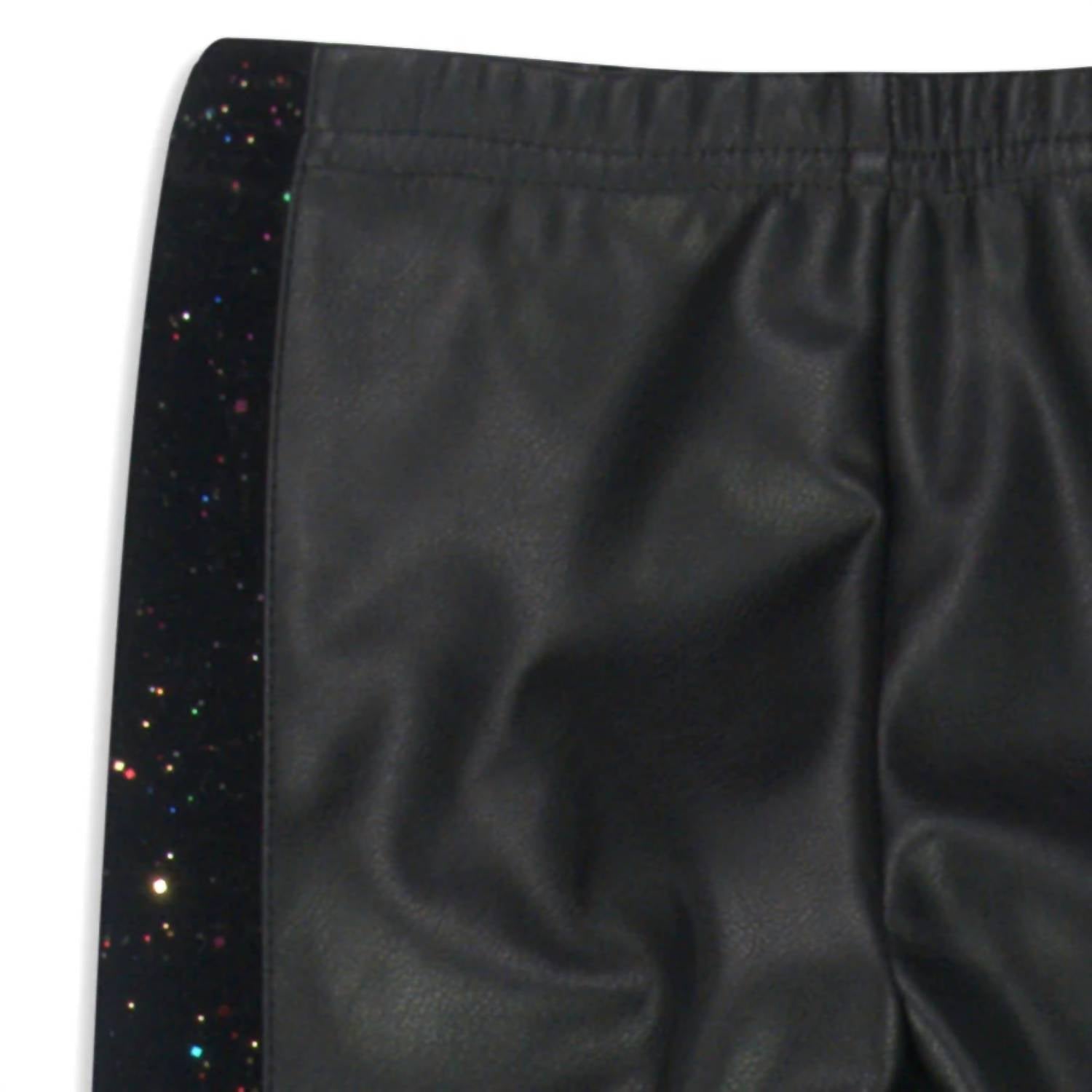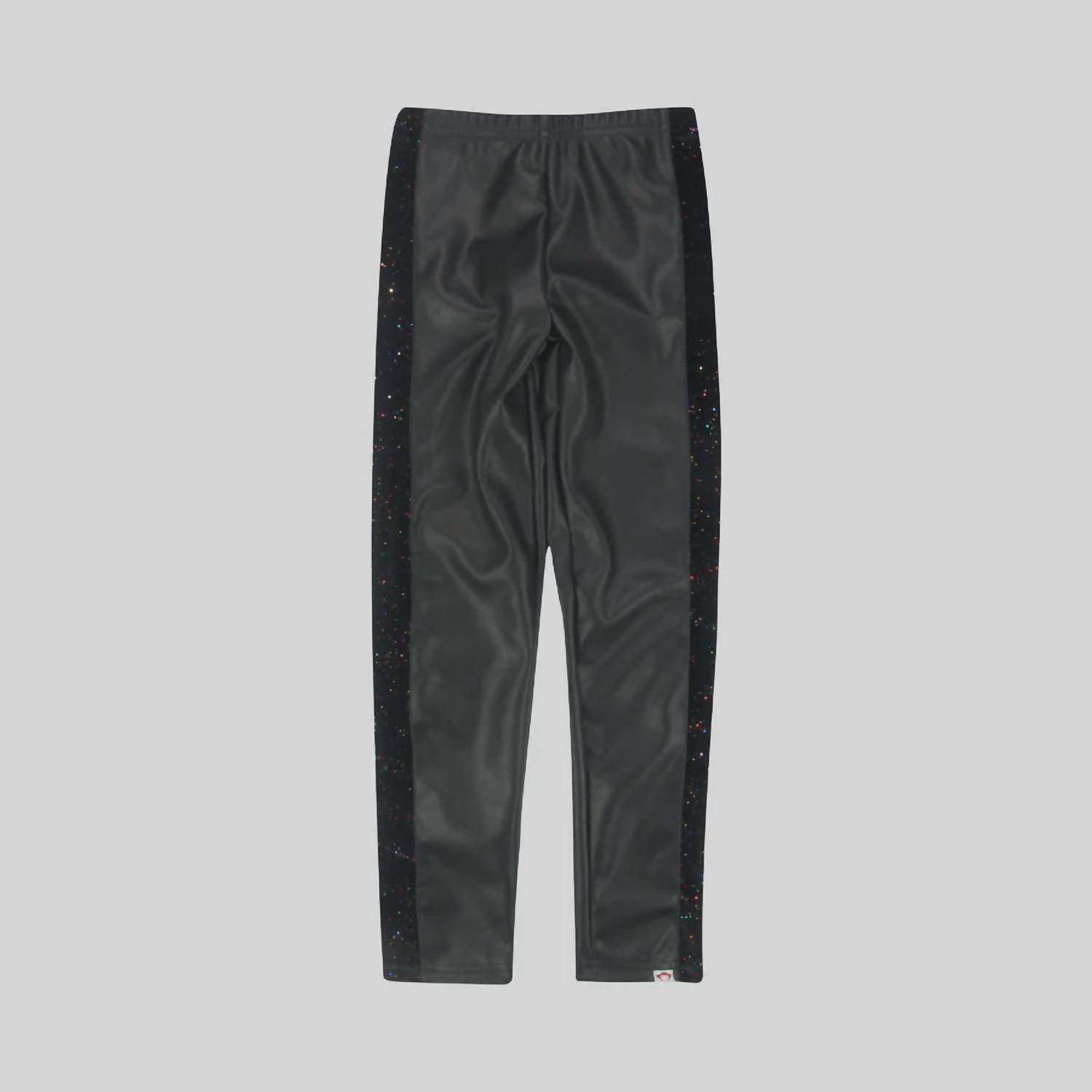 Introduce your little fashionista to the Riley Sparkly Leggings by Appaman, perfect for a dazzling dinner party this spring. These leggings in Midnight Shine feature a glossy black finish with a soft and sparkly side insert, adding a touch of mystery and flair. Designed for girls, they boast a patterned style that adds confidence and charm to any outfit.