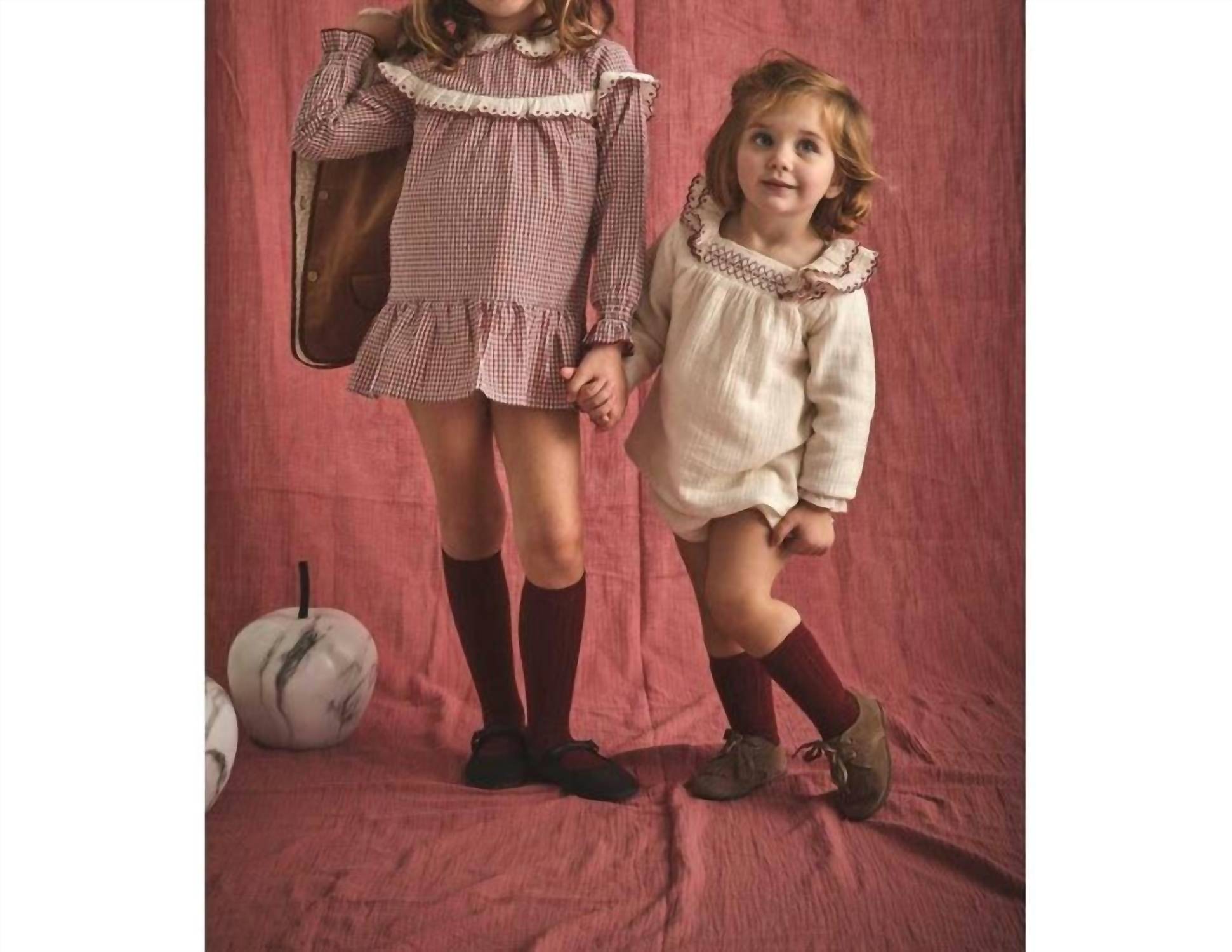 Introducing the Girl's Almendro Set by Babidu, a beige long sleeve bloomer set crafted for ultimate comfort. Made from soft bamboo fabric, this versatile piece can also serve as a dress when sized up. The set features red stitching along the collar and neckline, complemented by red ruffling at the back. Explore the Almendro collection for coordinated sibling outfits. Style Number: 90769.