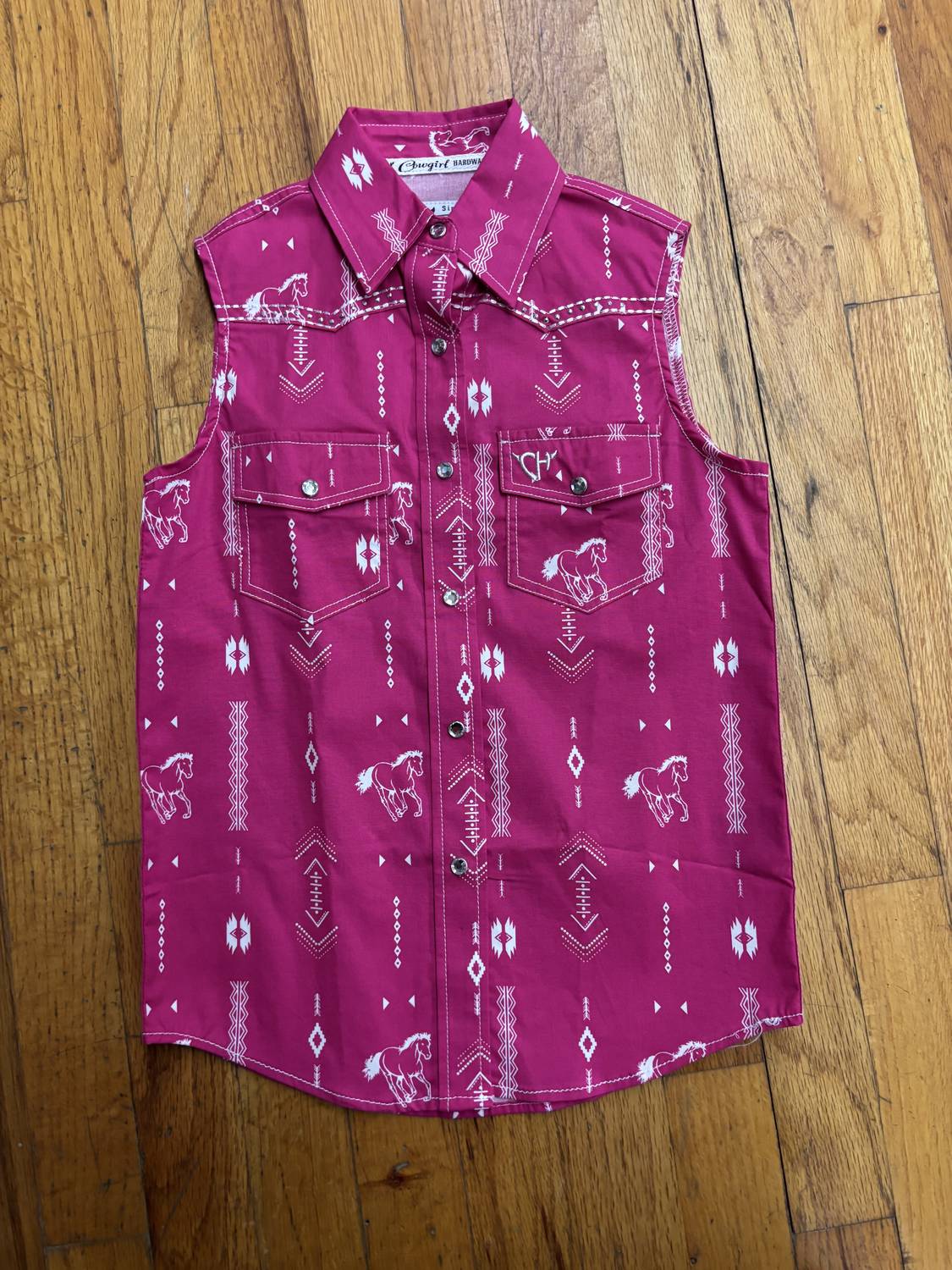 Introducing the Girls Aztec Horse Print Top by Cowgirl Hardware, a delightful fusion of playful design and vibrant colors. Perfect for a spring vacation, this patterned shirt brings a touch of Western flair with its charming Aztec horse motifs. In a lovely pink and white palette, it offers a stylish twist on the classic button-down shirt.