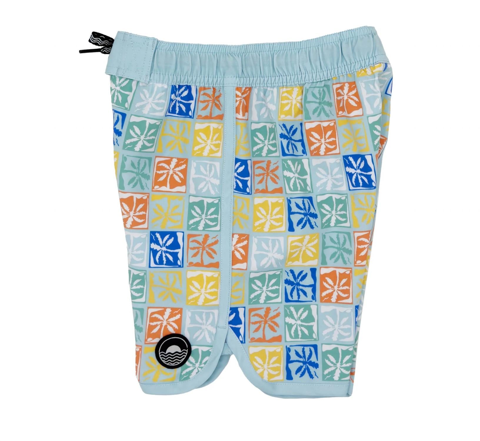 Introducing the Boy's Scallop Edge Boardshort by Feather 4 Arrow, featuring a stylish scallop edge with contrast taping detail for a striking look. Designed for a comfortable, easy fit with an elastic waistband and drawcord, these boardshorts are crafted from a premium fabric blend: 36% Upcycled Coco Polyester, 34% Recycled Polyester, 20% Cotton, and 10% Elastane. With UPF 50+ UV protection, this patterned Palm Check piece is perfect for summer beach days. Care: Machine wash.
