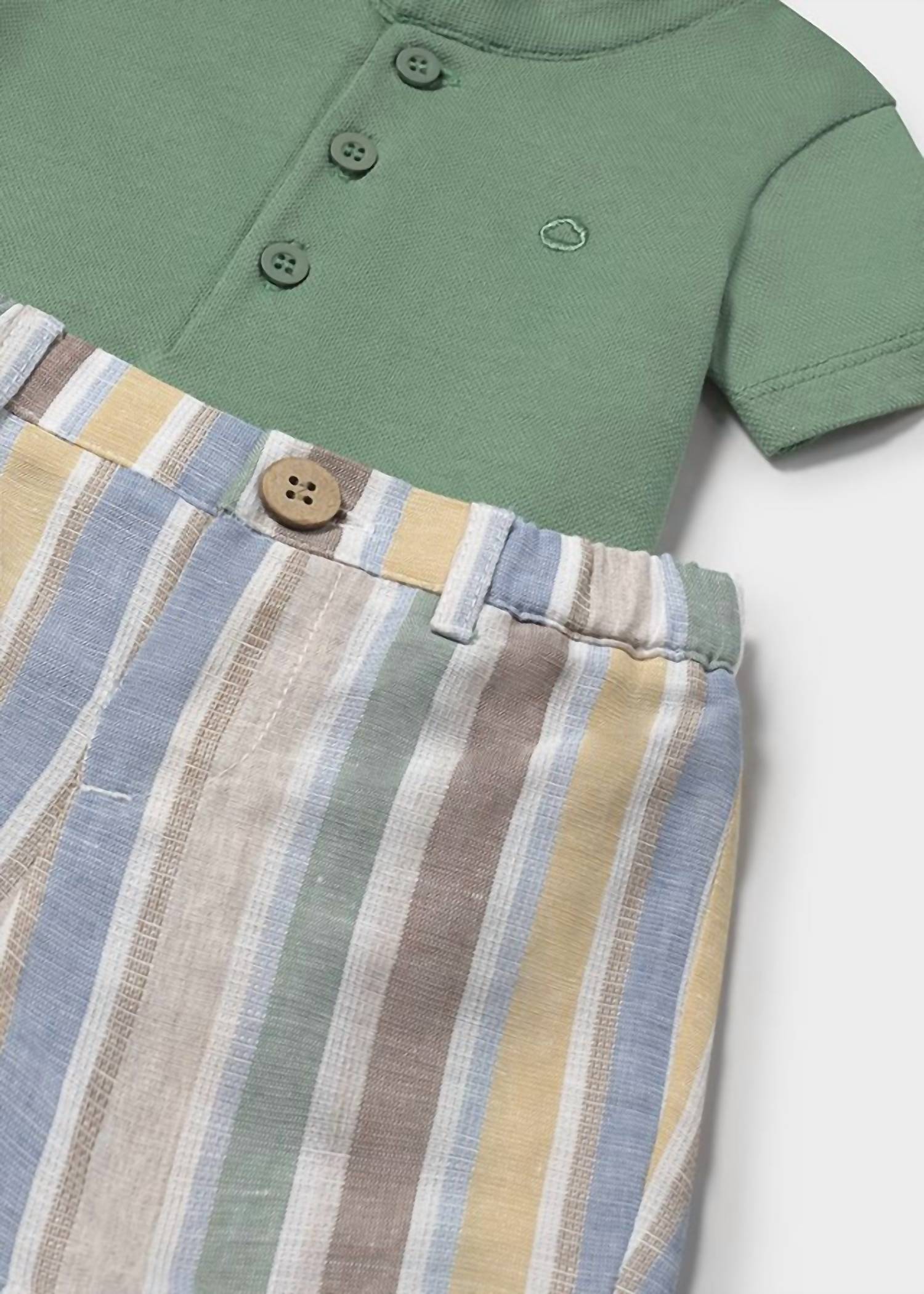 Elevate your child's wardrobe with the Boys' Stripe Shorts & Polo Set by Mayoral, tailored for comfort and style. This ensemble features a green short-sleeve polo shirt made of 95% cotton and 5% elastane, providing a soft, breathable fit. Paired with striped cotton-linen shorts, they offer a composition of 68% cotton and 32% linen for added comfort. The shorts feature a practical button front closure and an elastic waistband, perfect for warm-weather outings or special occasions. Machine wash, tumble dry,or dry clean for optimal care.
