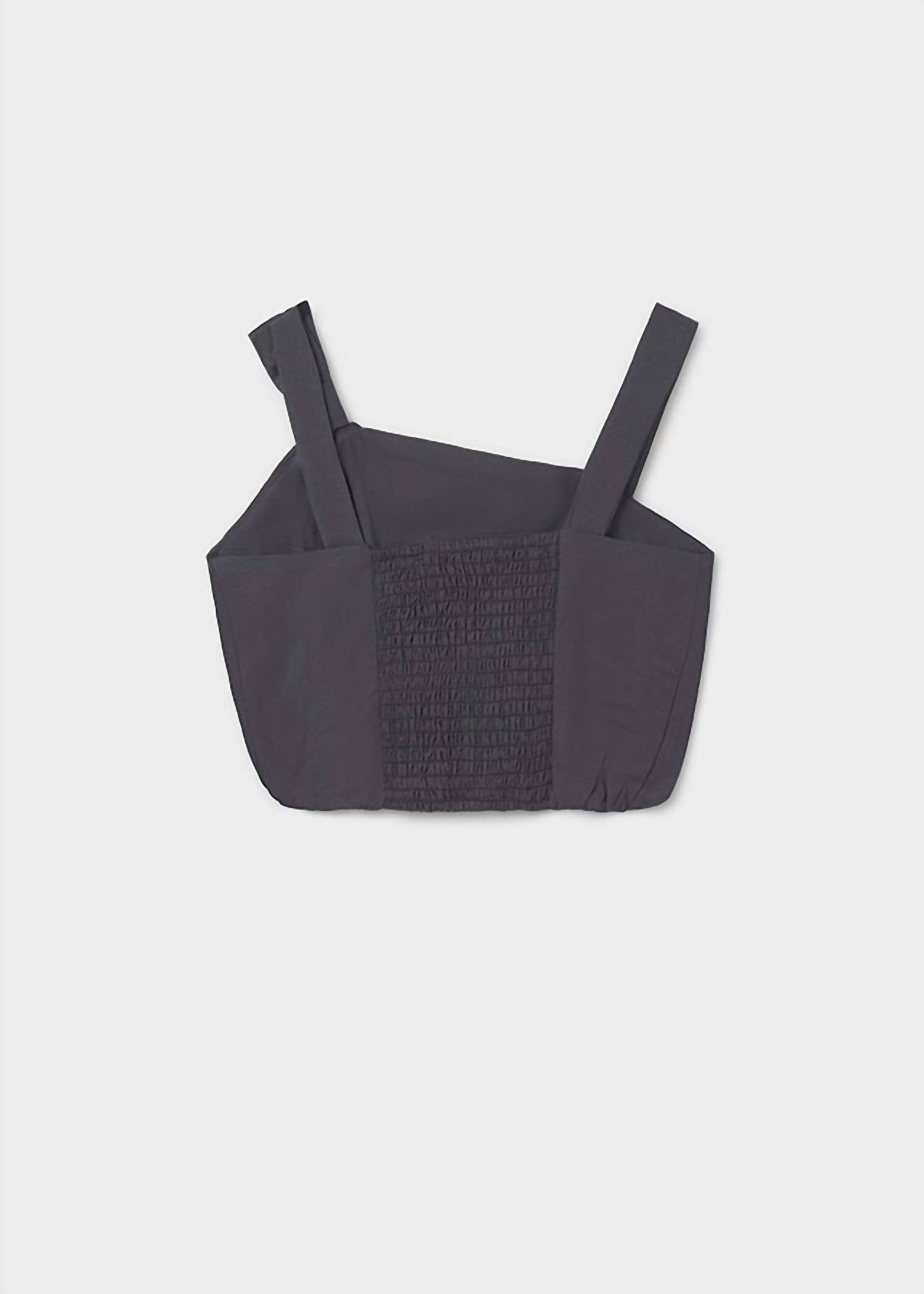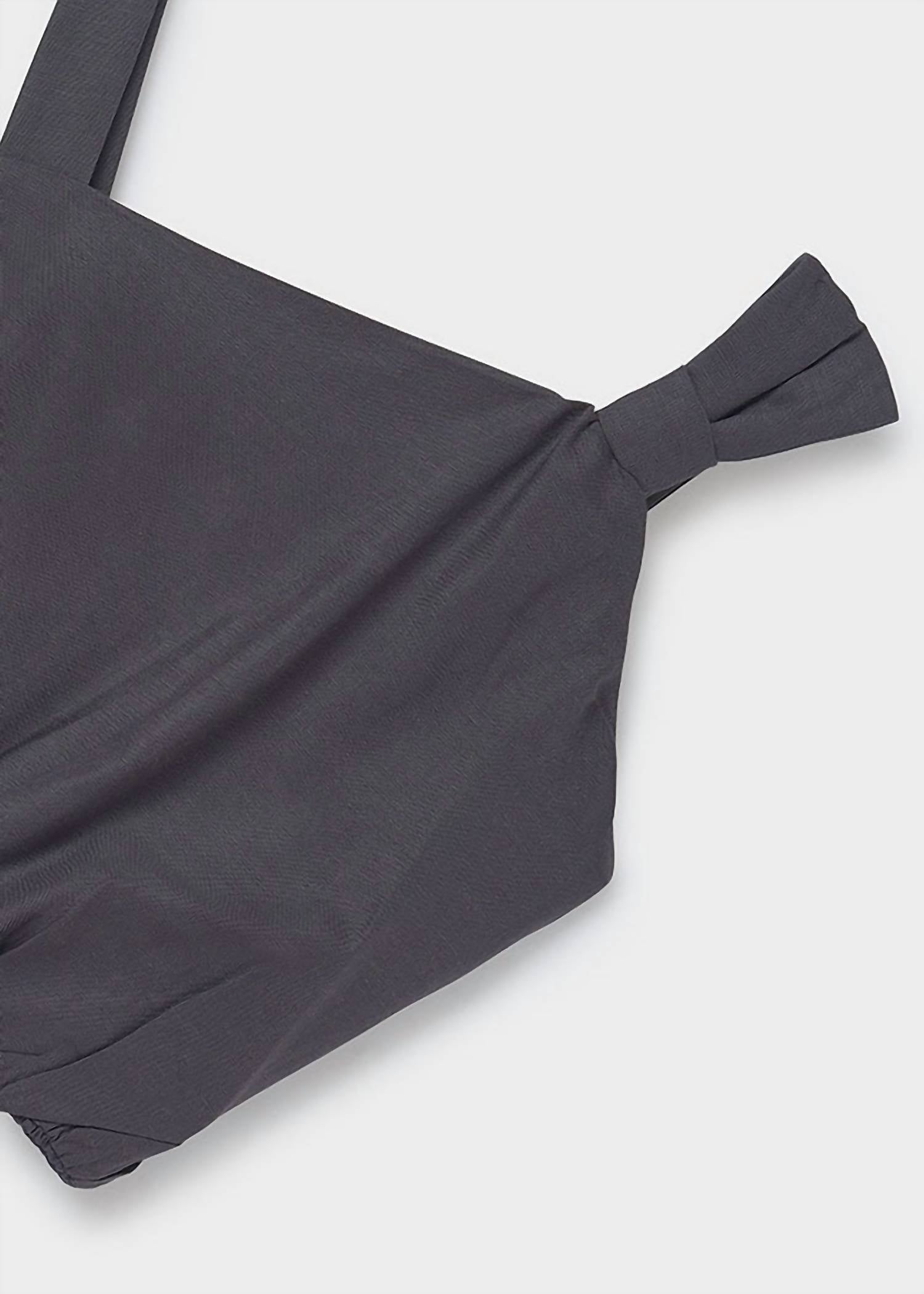 Elevate your summer wardrobe with the Girl's Bow Strap Tank Top by Mayoral, a stylish piece in a chic carbon hue. Featuring an asymmetric strap and neckline detail, this cropped top boasts a lightweight feel with a textured, smocked back for added flair. Crafted with a blend of 78% Viscose and 22% Linen, and lined with 100% Cotton, it offers breathable comfort and easy layering. Conveniently designed with a pullover style, it requires simple care with machine wash cold, line dry, and a cool iron.