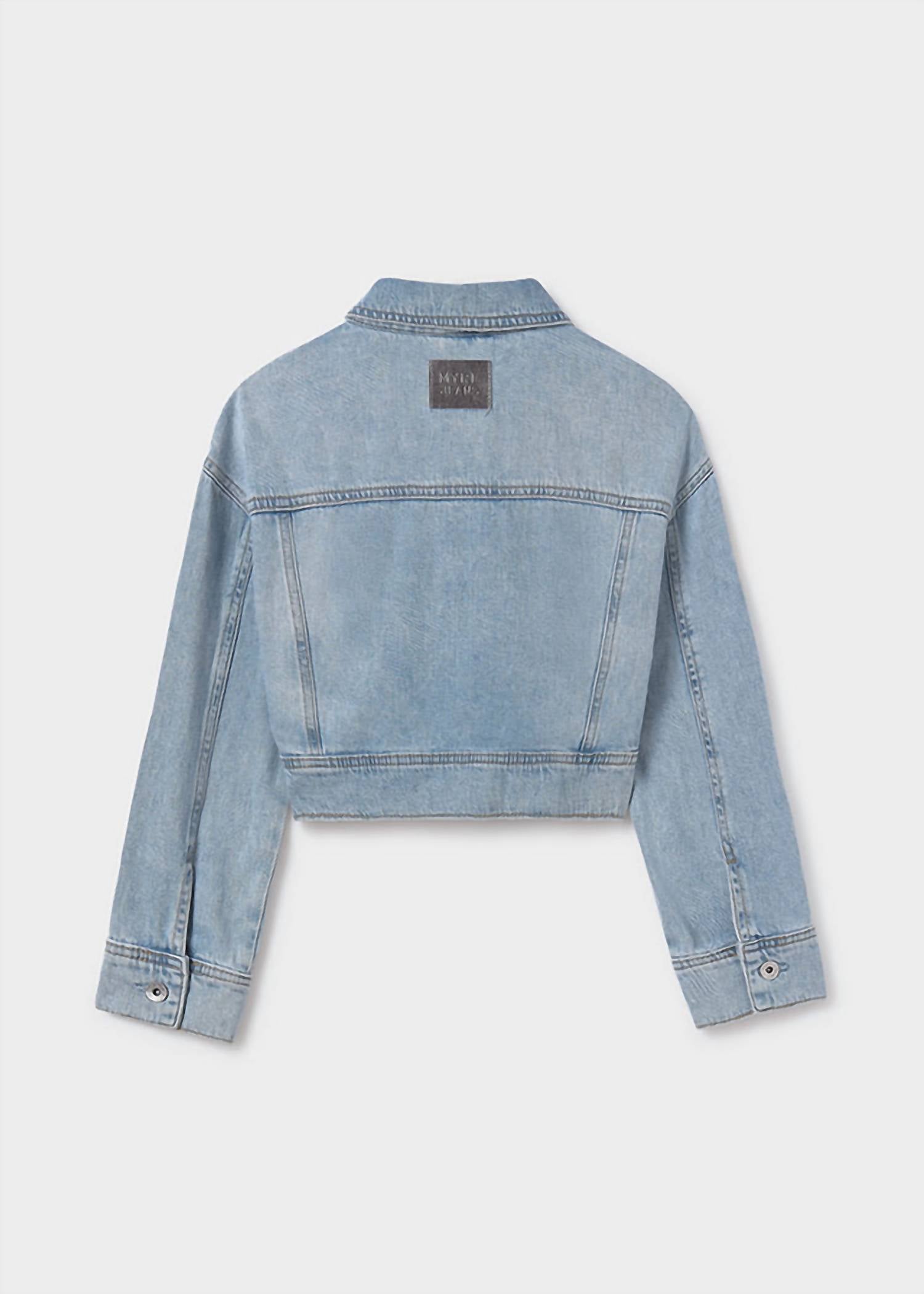 Introducing the Girls' Cropped Jean Jacket by Mayoral, a timeless addition to any young fashionista's wardrobe. This light wash denim jacket is crafted from 100% BCI Cotton, featuring a chic cropped cut and a collared neckline with a front button closure adorned with silver hardware accents. Perfect for layering over anything, whether for a cool summer evening or a brisk fall day. Care is hassle-free with machine wash cold and tumble dry low, ensuring it's ready for any adventure.