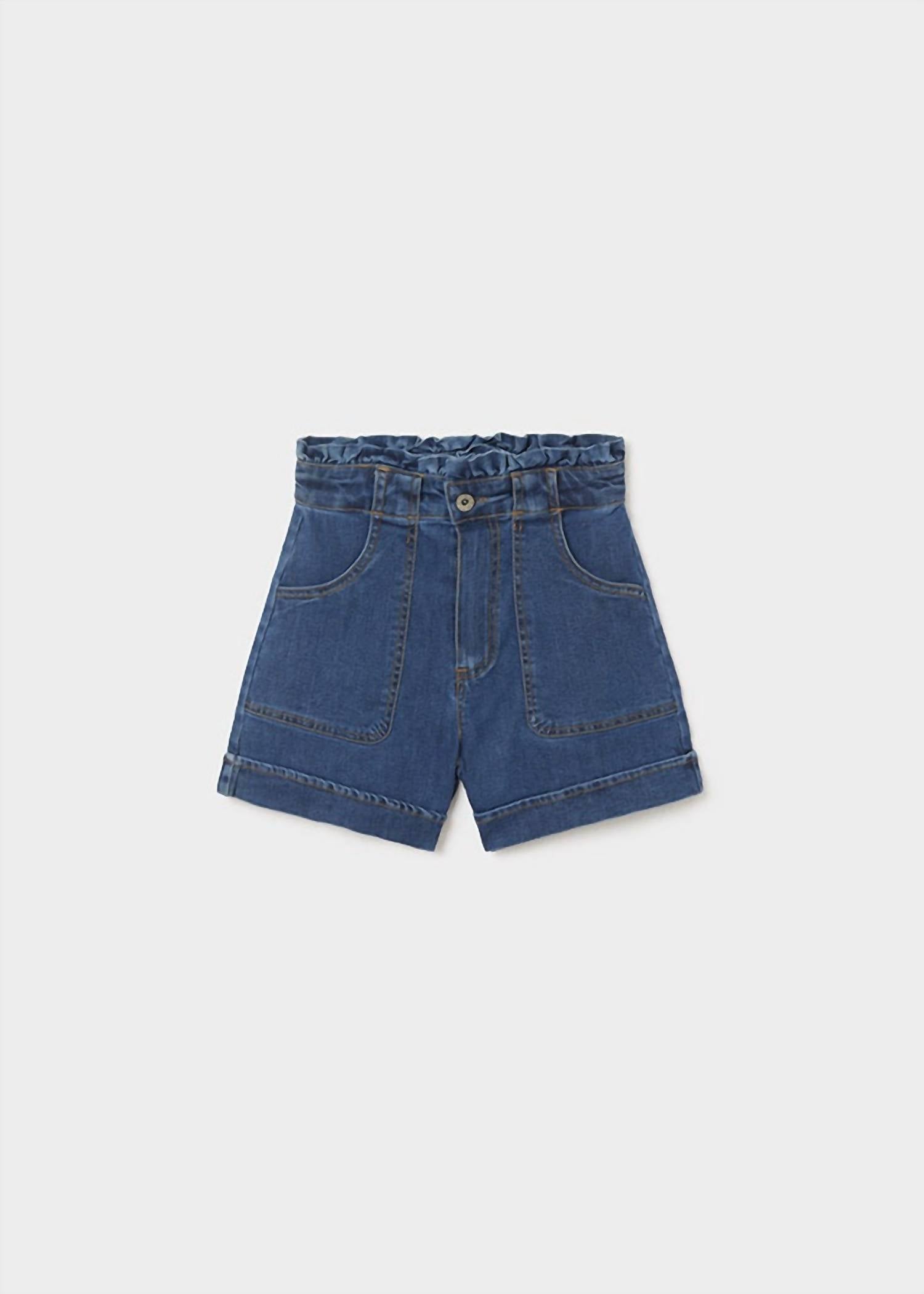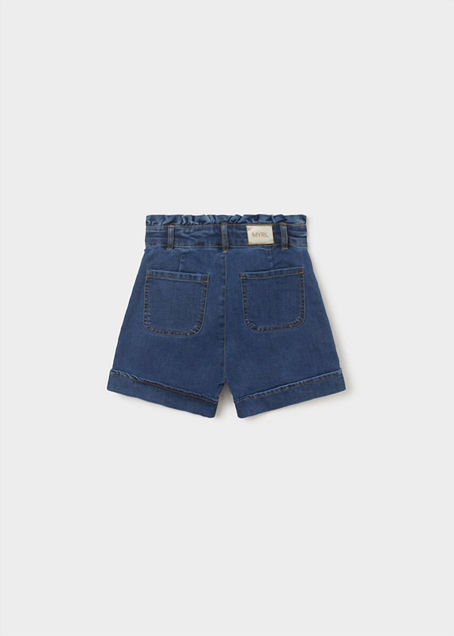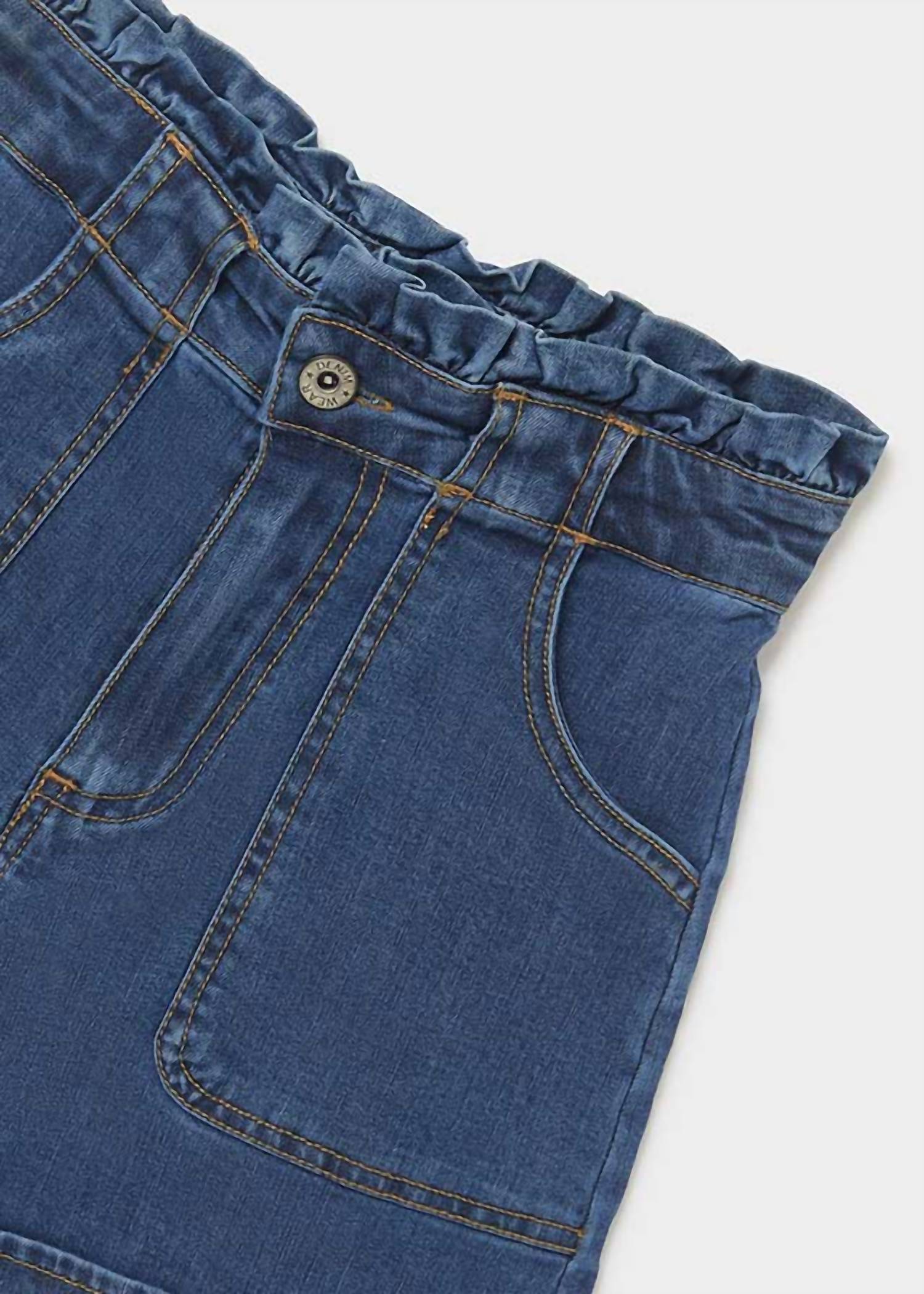 Introducing the High Waist Jean Short by Mayoral, a chic and modern addition to any summer outfit. With oversized carpenter style pockets on the front and a ruffled waistband, these medium wash denim shorts ensure style while offering practicality. Composition: 98% Cotton, 2% Elastane. Closure: Single button with zip fly. Care: Machine wash cold, do not bleach, hang dry, medium iron.