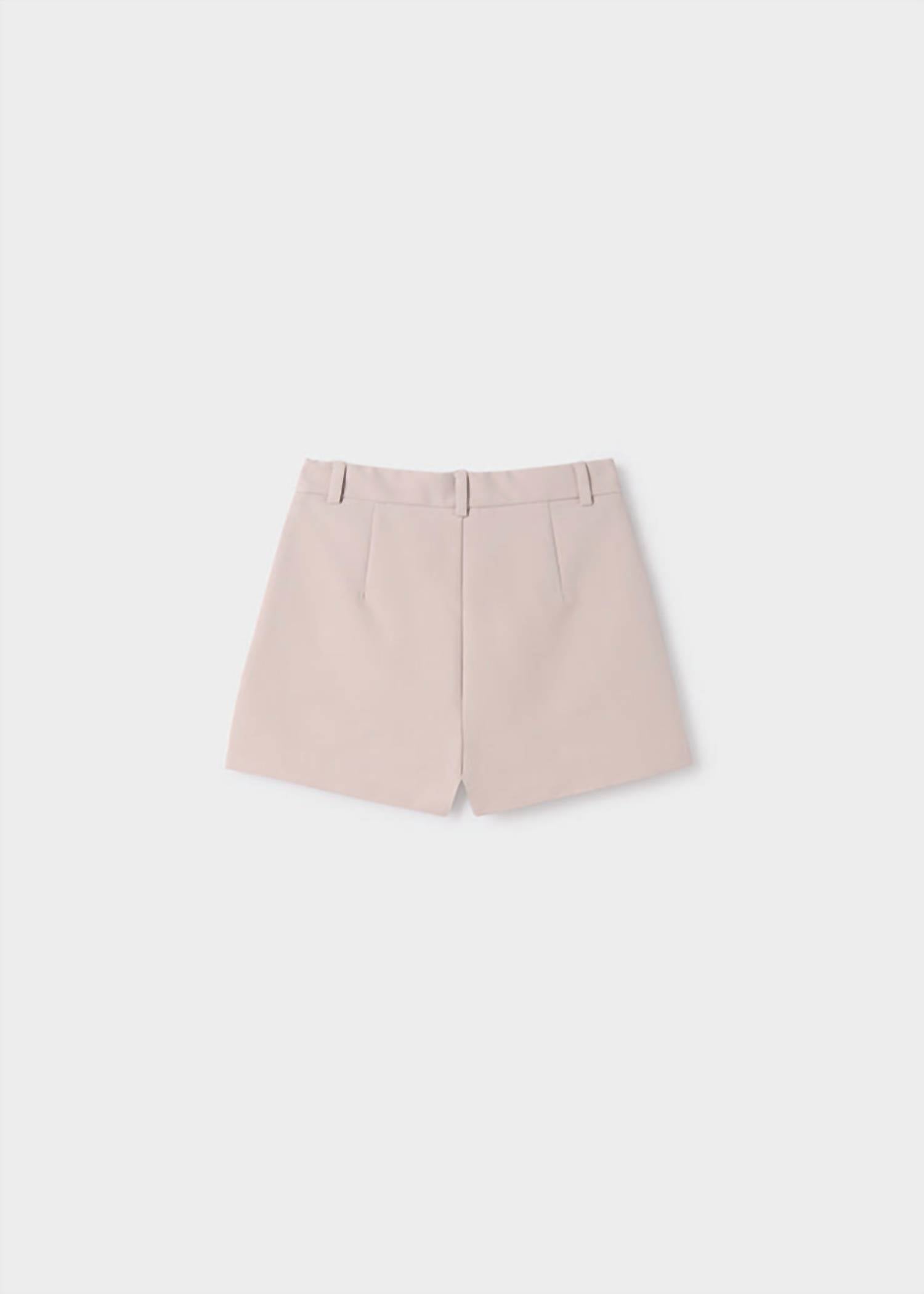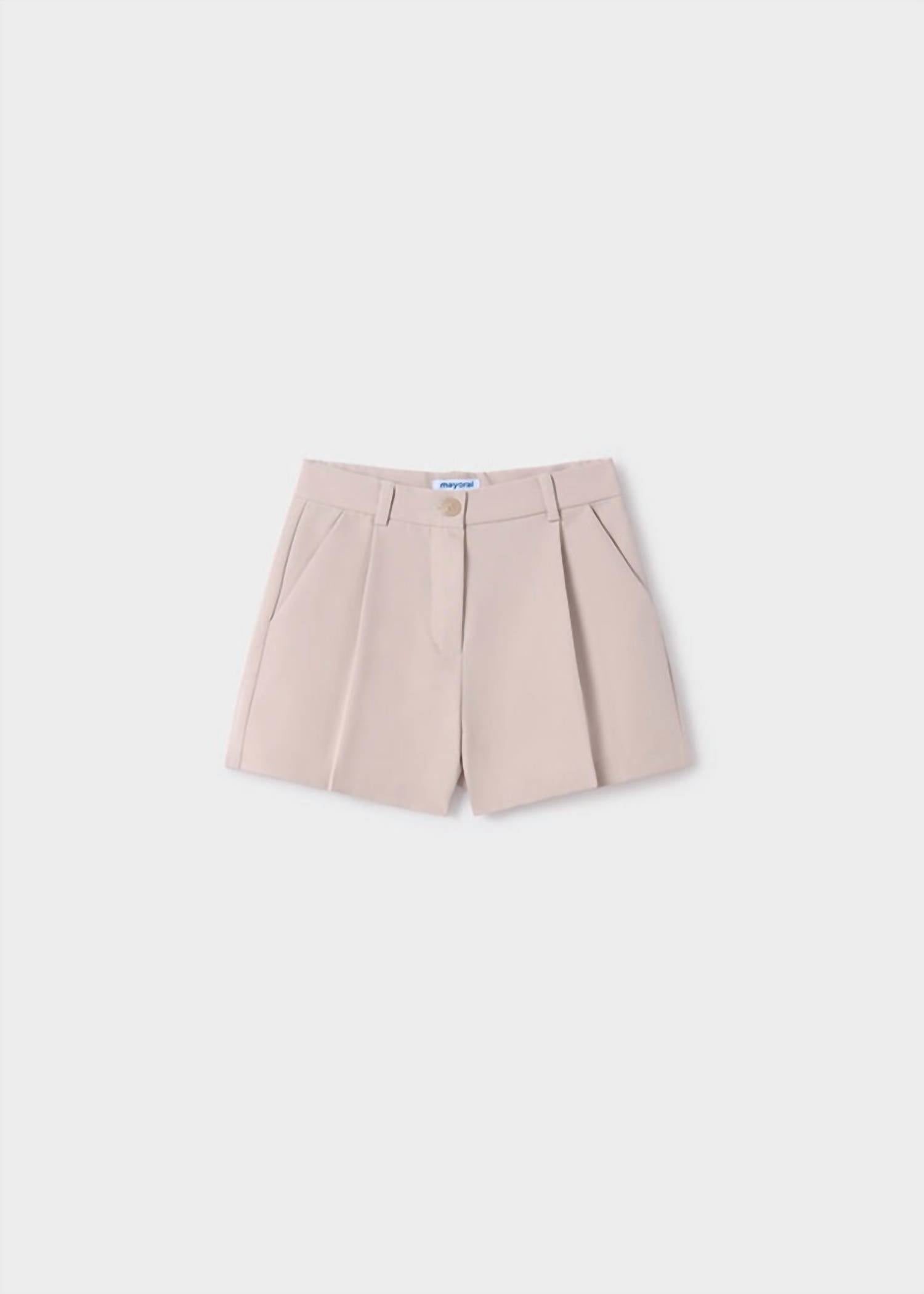 Introducing the Soft Pleat Crepe Short by Mayoral, perfect for stylish girls this spring. These smart stone-colored shorts are crafted from a comfortable blend of 90% polyester and 10% elastane, featuring tailored pleats, slanted front pockets, and an adjustable waist for a perfect fit. They fasten with a button and zip, complete with belt loops on the waistband for added versatility. Fully embracing a minimalist trend, these shorts are designed using 51% recycled materials and should be hand washed and line dried.