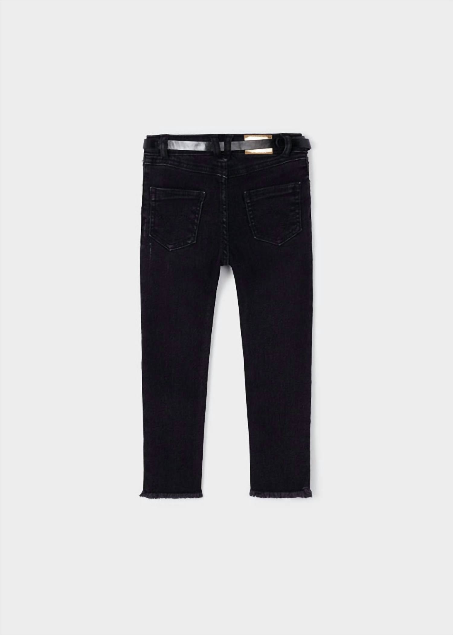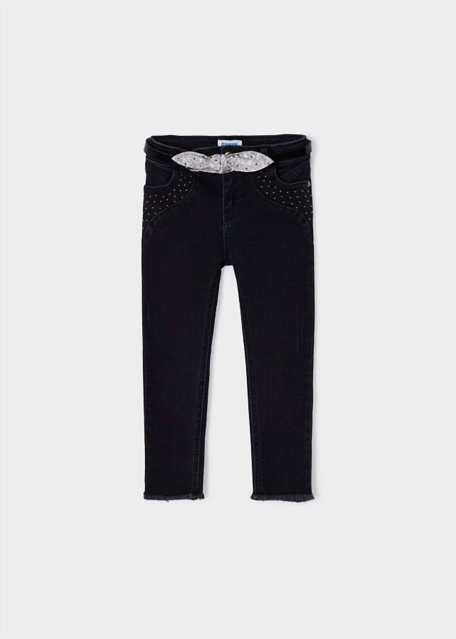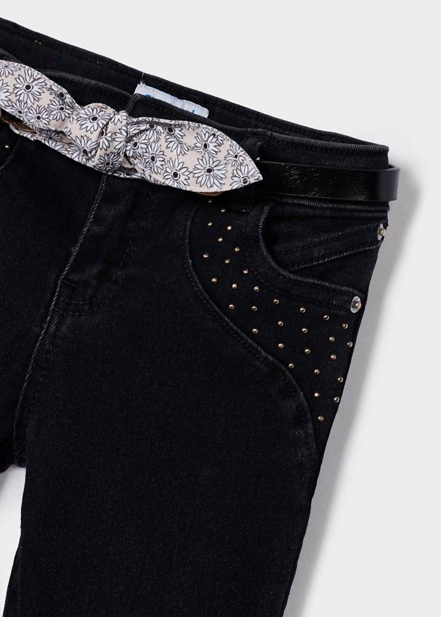 Meet the Studded Raw Hem Skinny Jean by Mayoral, a chic pair for the fashion-forward young trendsetter. These girls' jeans in black are crafted from a cotton blend featuring 83% Cotton, 15% Polyester, and 2% Elastane for a comfortable stretch fit. The stylish jeans come with a coordinating stitch detail, curved front pockets accented with silver pindot studs, and a frayed bottom hem, all completed with a faux leather belt with a monochromatic knotted floral bow. Closure is via a single button and zip fly, and they are machine washable in cold water, with a hang dry and cool iron for easy maintenance.