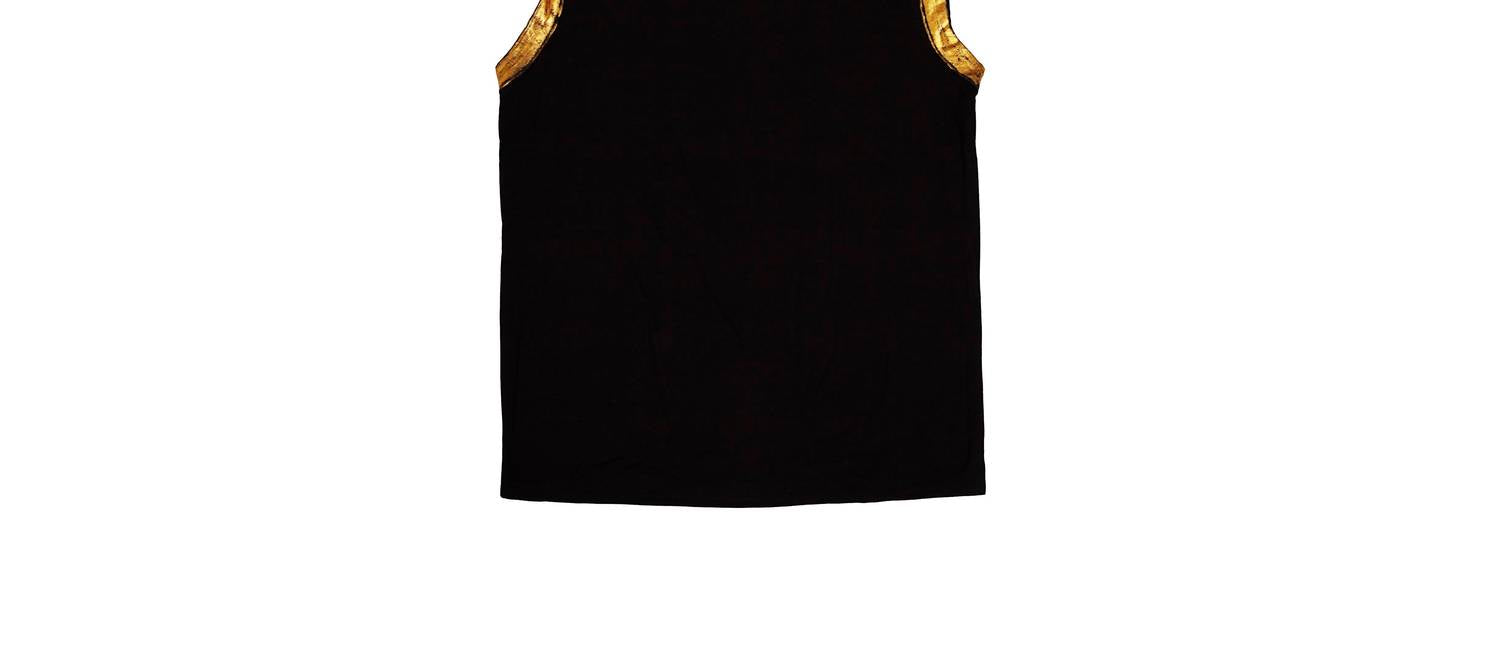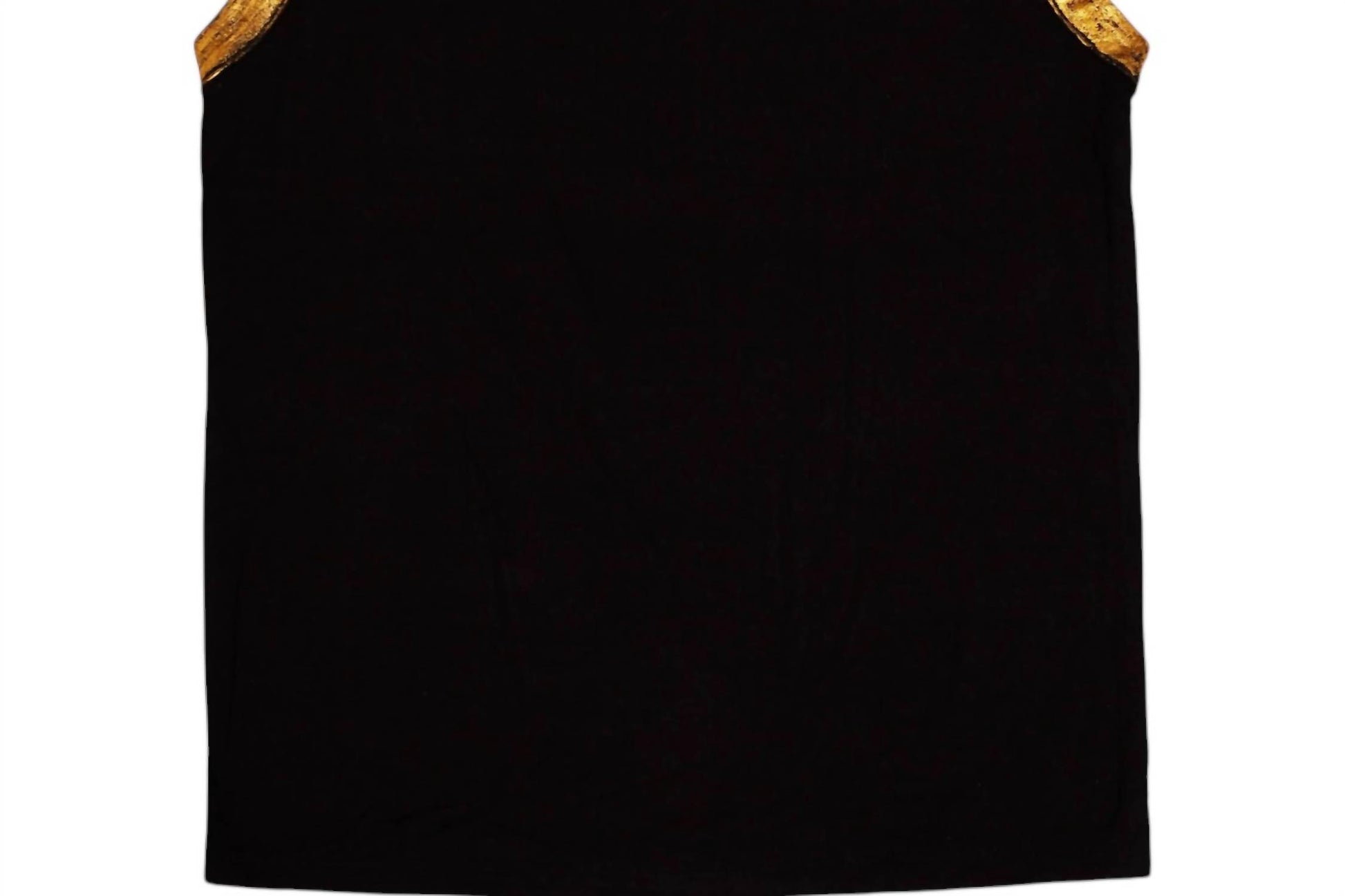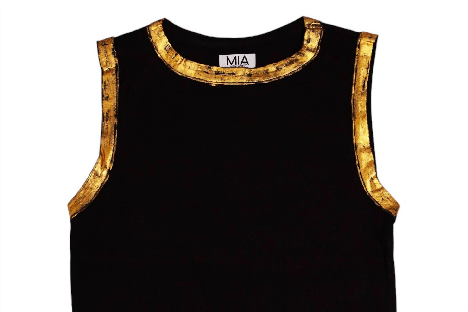 Introducing the Girls' Foil Tank Top by MIA, a chic addition to your summer wardrobe. This stylish tank top in classic black features foil-like silver and gold accents along the neckline and sleeves, adding a touch of glamour to any vacation outfit. With a composition of 95% Rayon and 5% Spandex, this luxurious piece offers both comfort and style. Care instructions are simple: hand wash and line dry. Available in size XXS/14 for girls.