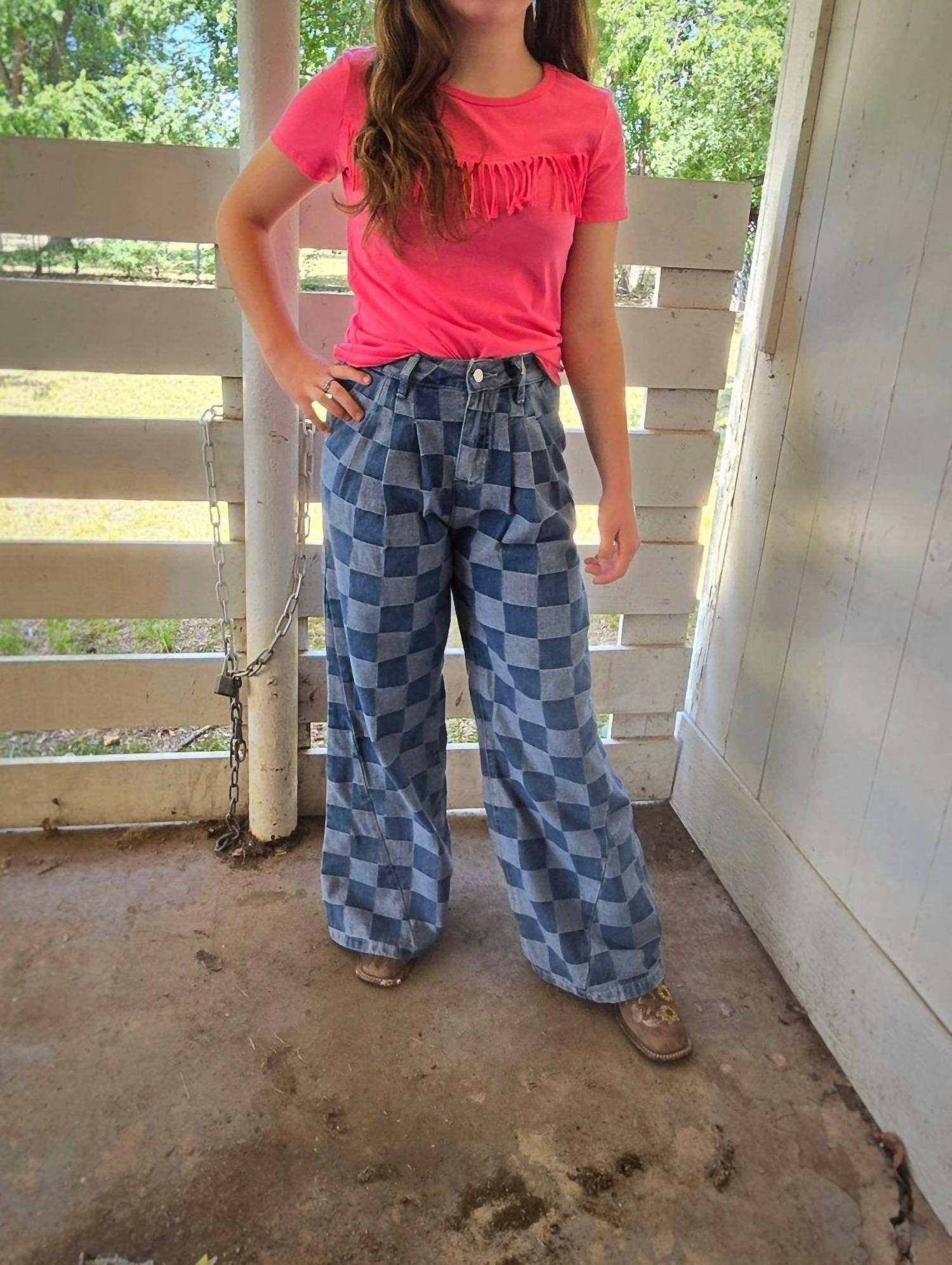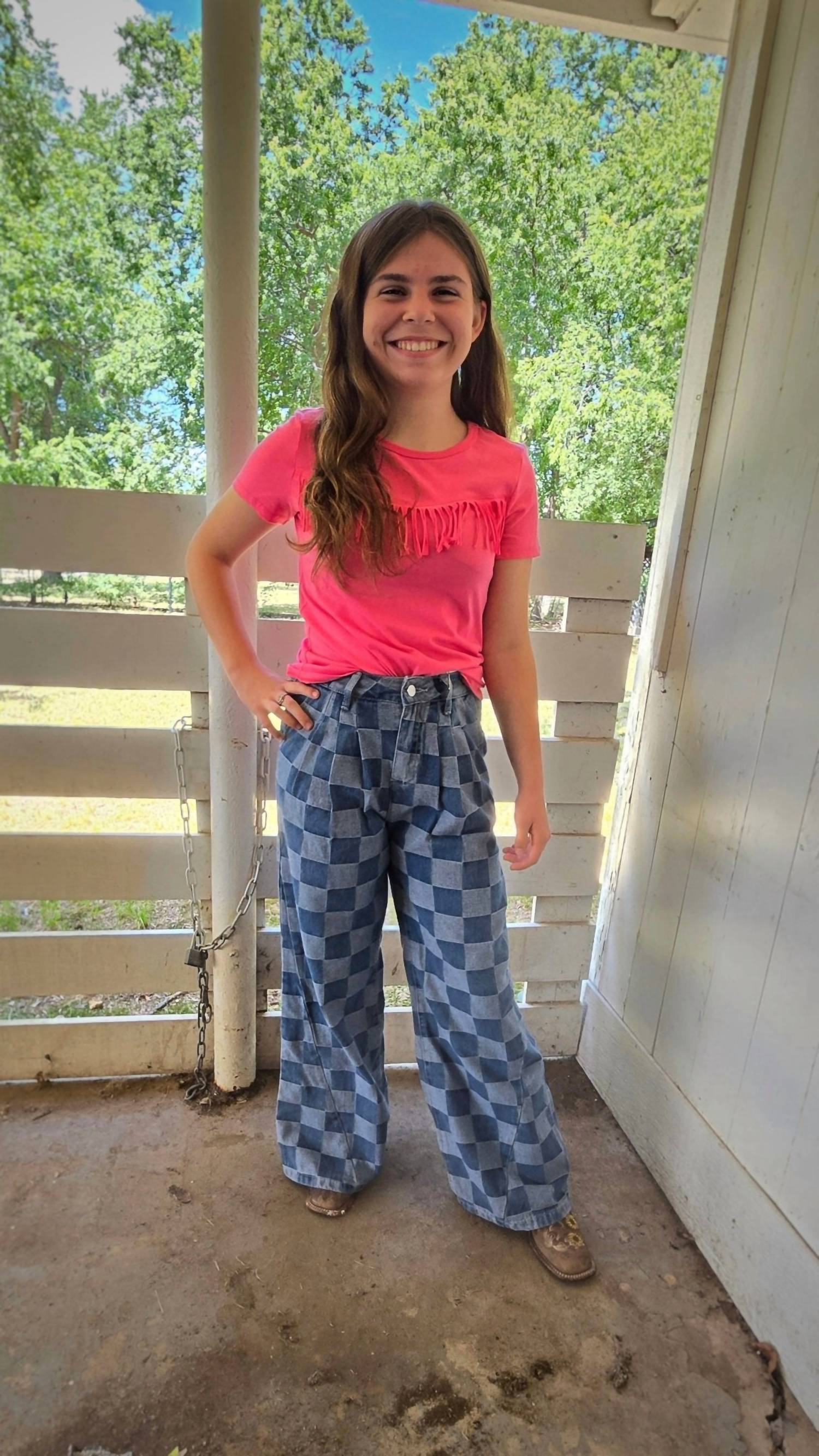The Girls Fringe Tee by Rock & Roll Denim is a vibrant pink short sleeve top perfect for summer vacations and Easter celebrations. Its solid monochrome design adds a trendy touch to any outfit, making it an essential warm-weather piece. This tee is an ideal choice for girls who love playful yet stylish fashion.