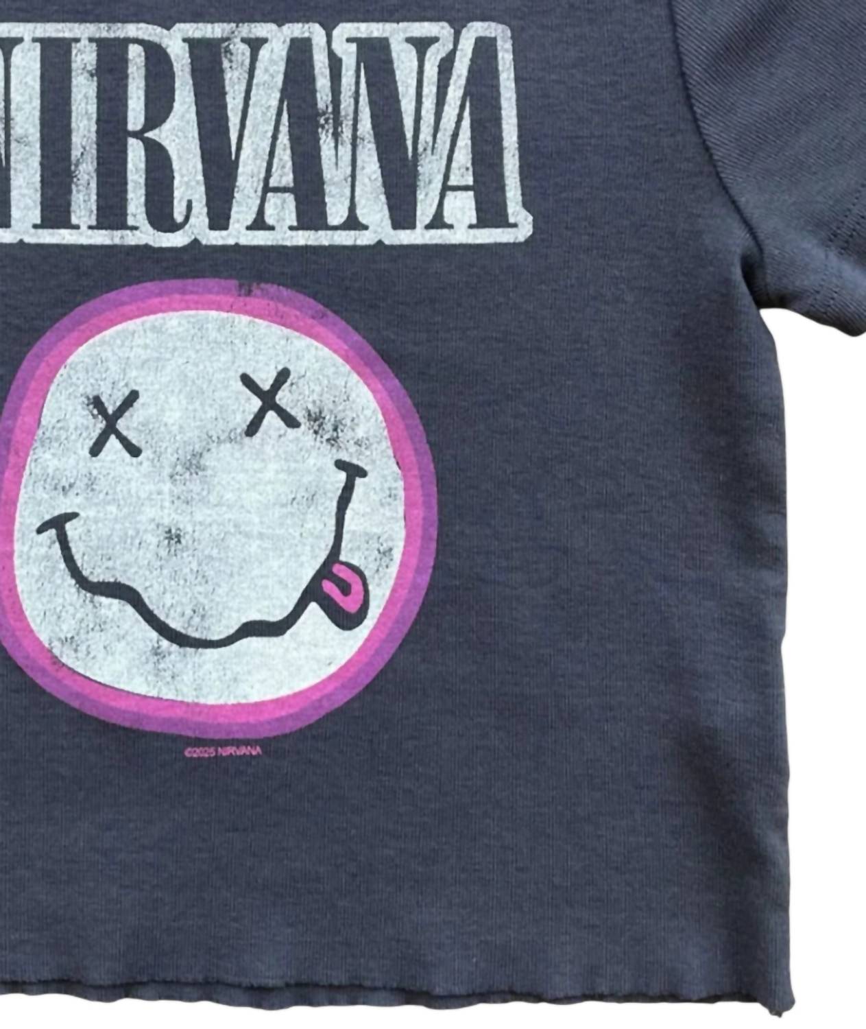 Embrace your playful grunge side with the Girls Nirvana Smiley Fitted Tee by Rowdy Sprout. This short sleeve tee in classic black features the iconic smiley logo on a soft, vintage-inspired fabric, perfect for girls with rock 'n' roll hearts. Pattern: Graphic. Originating from an unspecified location, it's ideal for back-to-school and spring streetwear occasions.