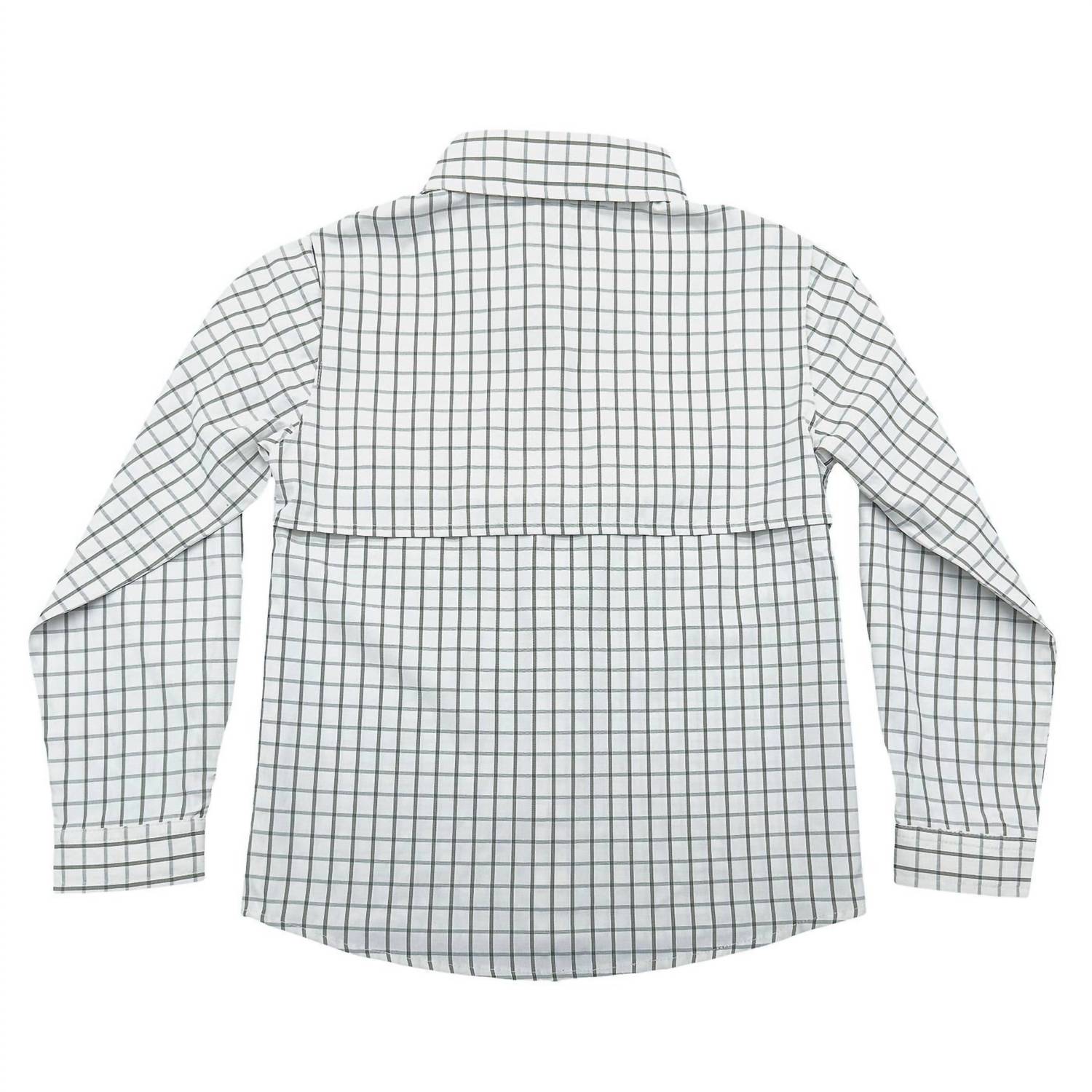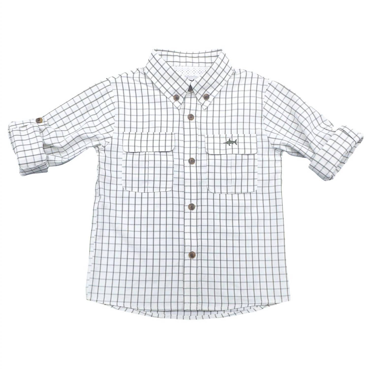 Meet the Boys' Flagler Fishing Shirt by Saltwater Boys Co., crafted for adventure with roll-up sleeves and button tabs providing optimal sun and bug protection. This olive and white plaid shirt features a vented mesh back for maximum breathability and comfort throughout the day. Made from a lightweight, durable cotton blend, it is perfect for outdoor activities, beach outings, or casual backyard gatherings. Care: Machine wash and tumble dry for easy maintenance, making it an ideal choice for year-round expeditions.