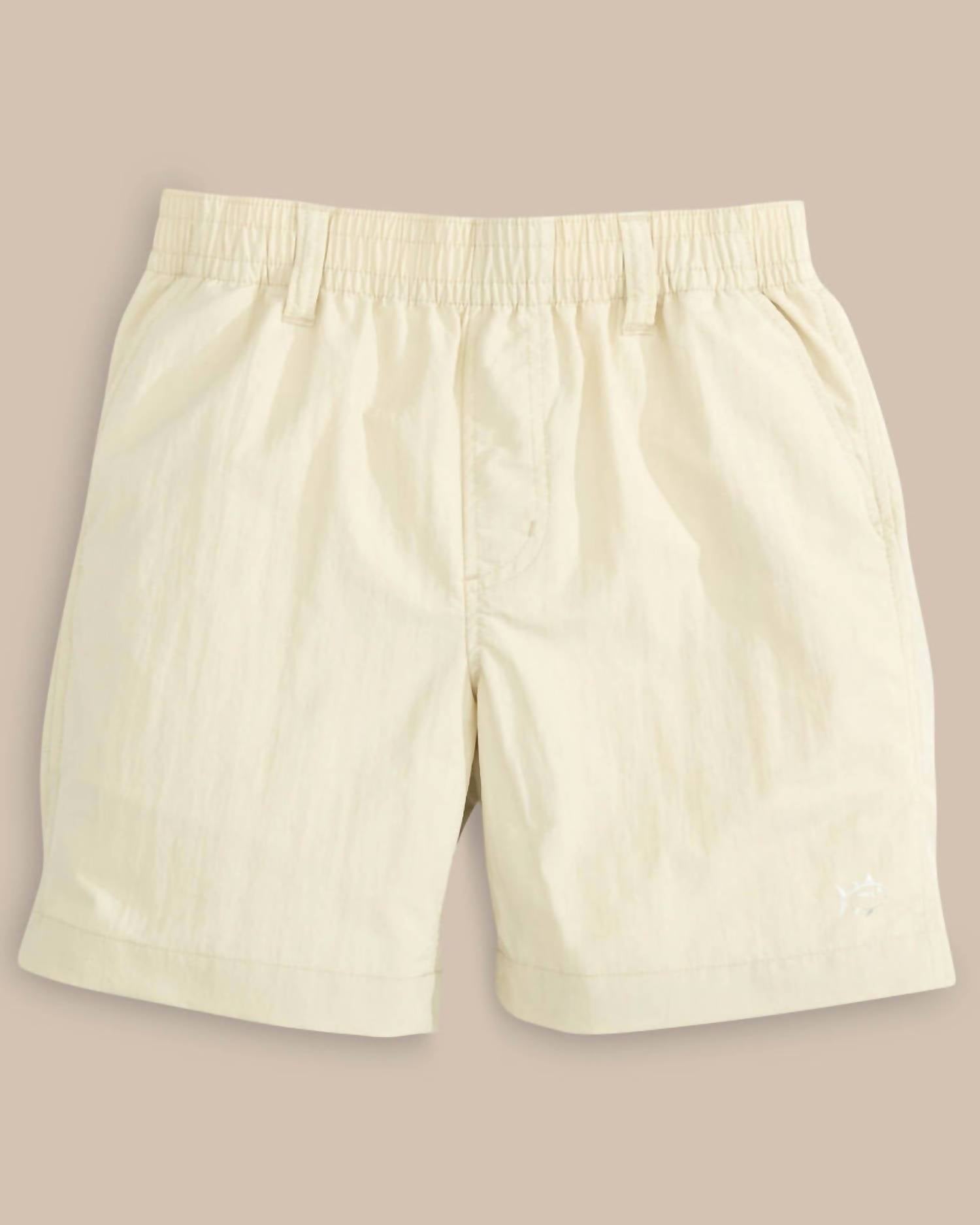 Meet the Boy's Shoreline Active Short by Southern Tide, a summer essential crafted for outdoor adventures. These shorts feature a comfortable elastic waistband with belt loops, providing easy wearability and complete freedom of movement. Made from 100% recycled nylon, they're thoughtfully designed with performance attributes resistant to chlorine and sea water, ensuring durability and long-lasting comfort. Practical features include front hand pockets with mesh pocket bags, a drainage-friendly patch pocket, and a reflective Skipjack heat seal logo for added style. Care is a breeze with machine wash cold and tumble dry low guidelines.