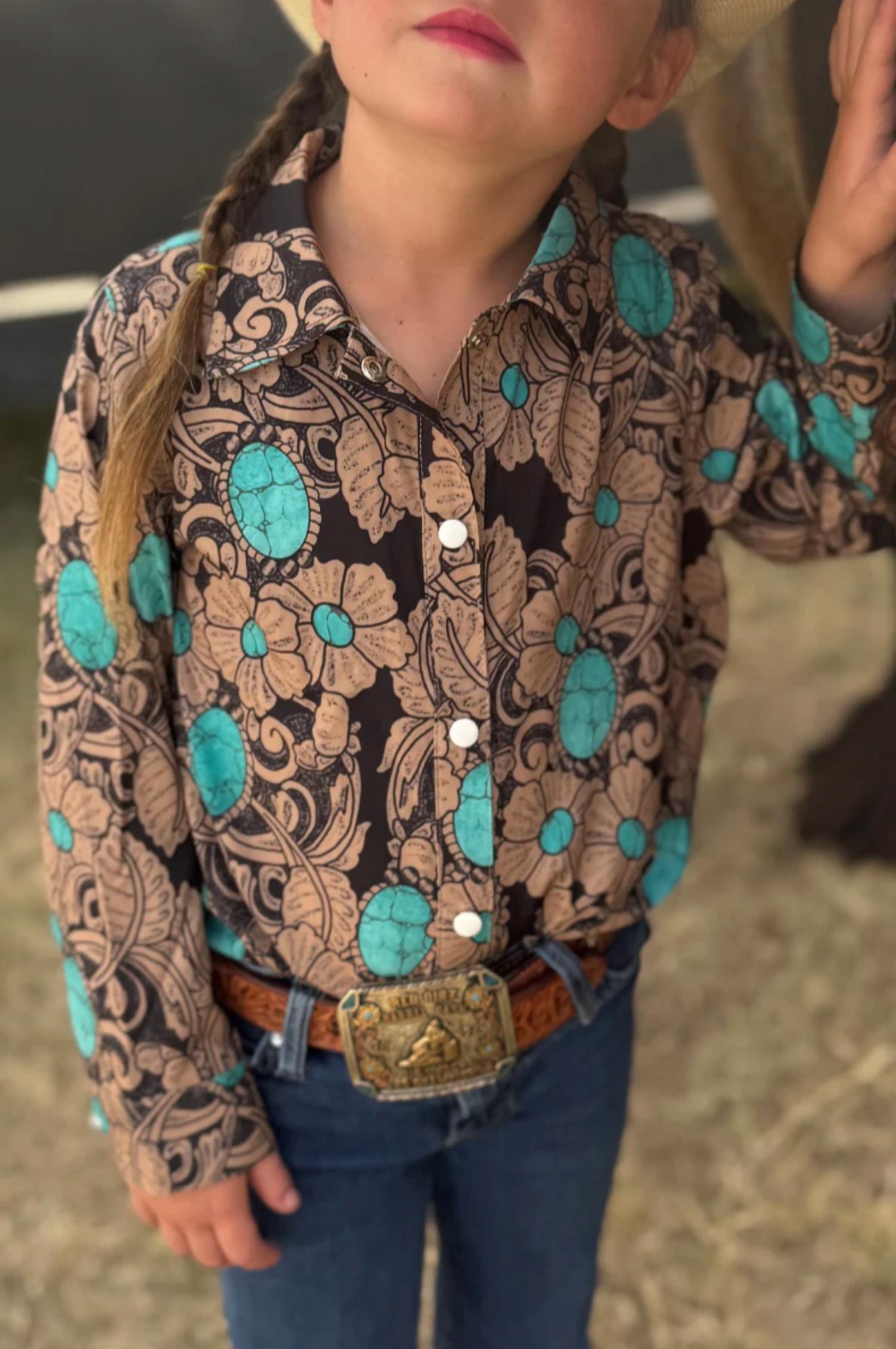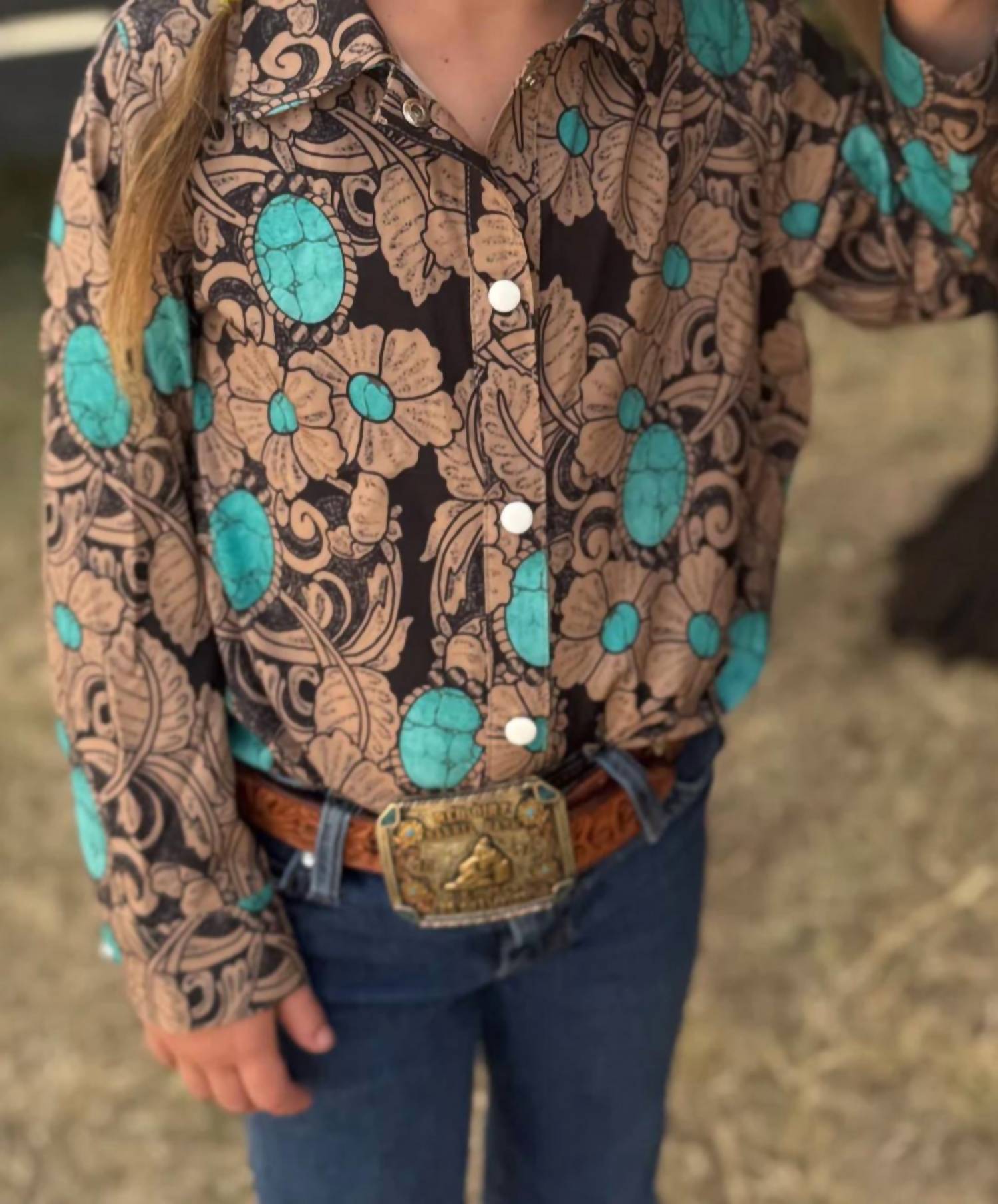Get your little one ready to shine at the rodeo with the Tattoos On This Town Button Up Kids shirt. Featuring classic pearl snap buttons, this playful shirt adds a touch of fun and style that matches perfectly with mom’s rodeo look. Durable and comfortable, it’s designed to keep up with all their adventures while making a bold, charming statement.
