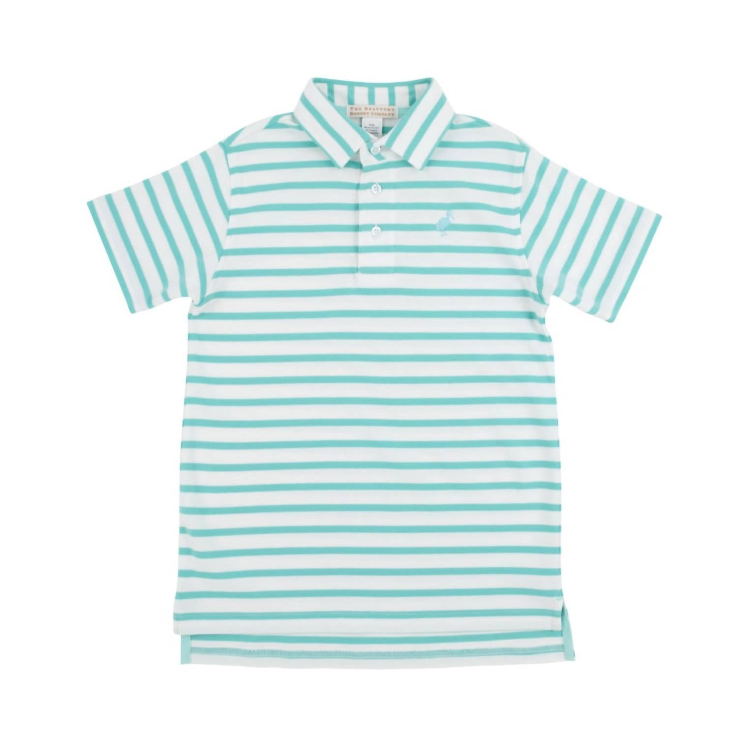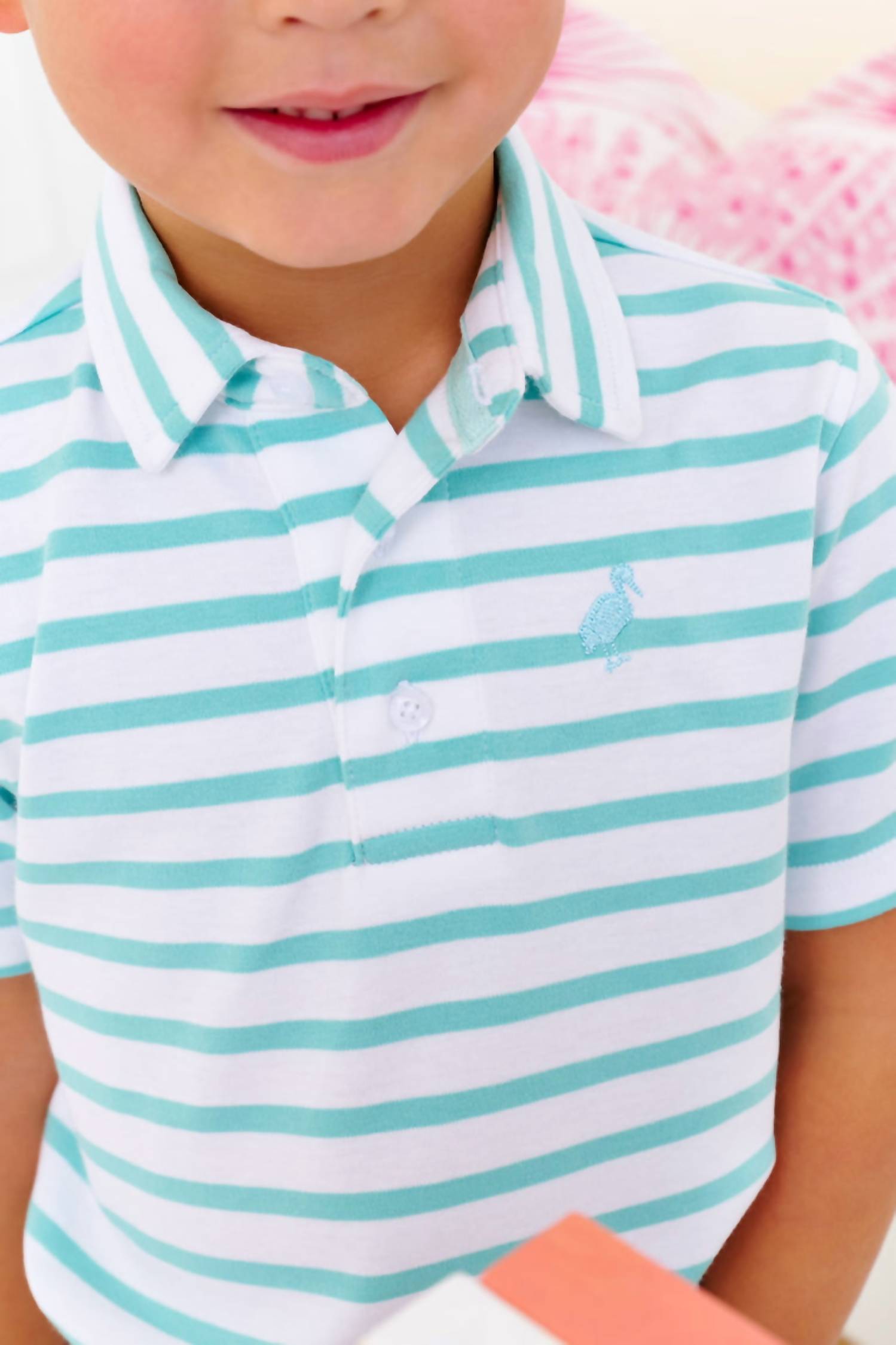 The Beaufort Bonnet Company offers the Kids Prim And Proper Polo Shirt in green stripes, perfect for a boy’s summer wardrobe. Crafted from cotton, this polo is ideal for vacation adventures with its stylish stripe pattern. Originating from an unspecified country, it combines casual polos with a fashionable streetwear trend. Care: Machine wash and tumble dry for easy maintenance. 100% Pima Cotton