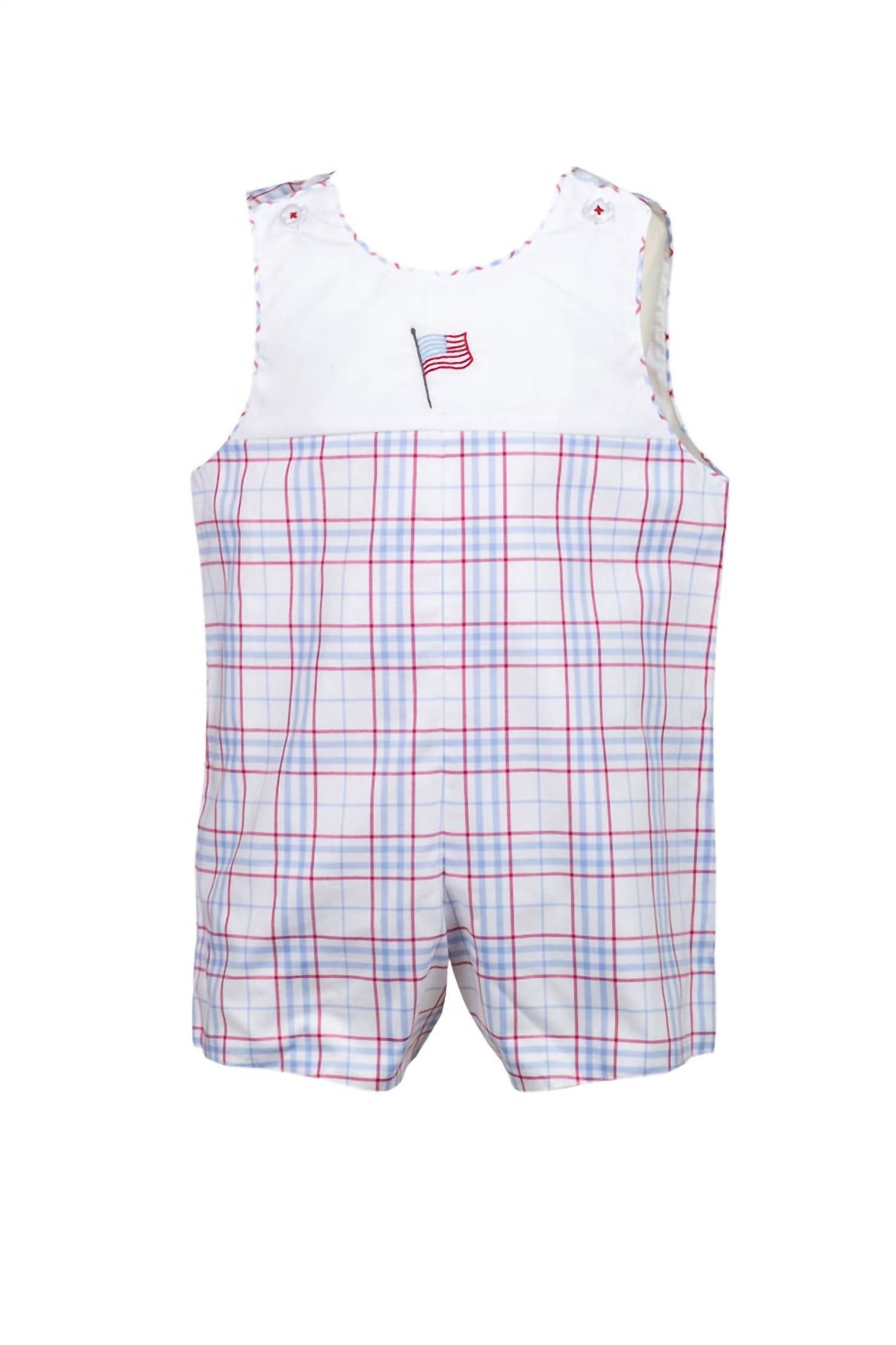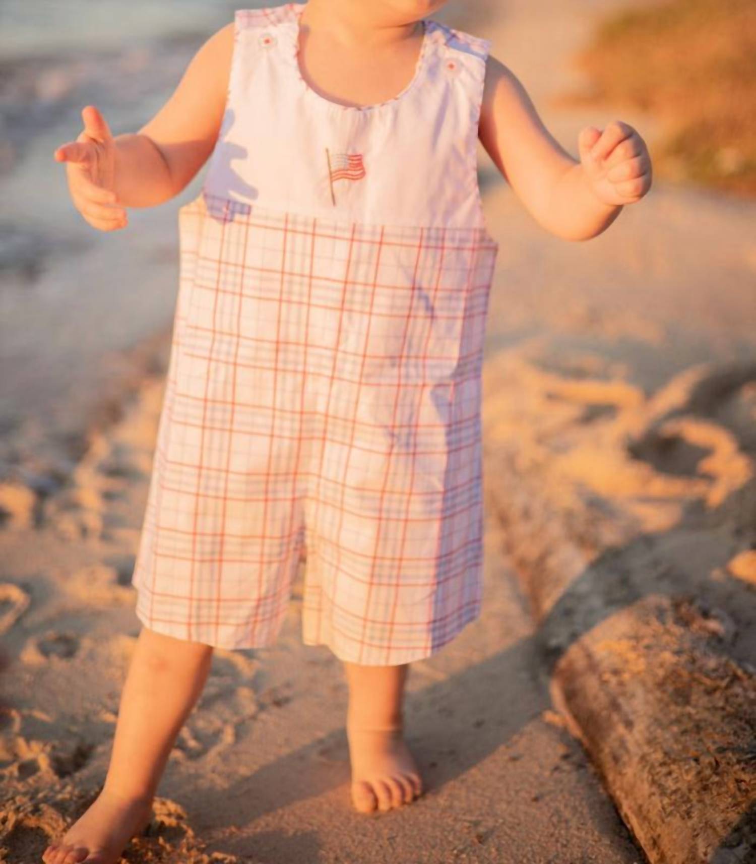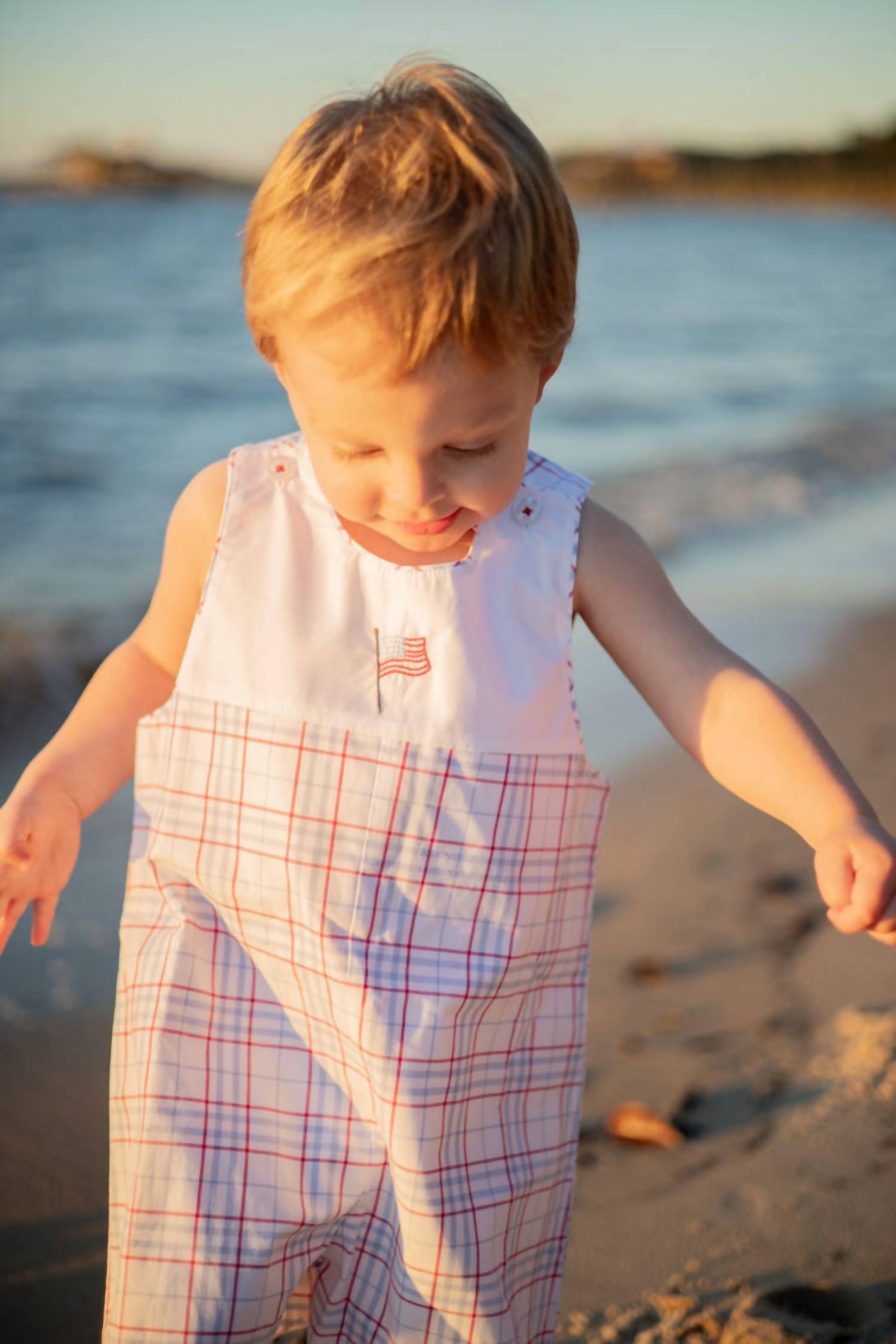 Introducing the Americana Jon Jon from THE PROPER PEONY, a delightful addition to every young boy's summer collection in a stylish red, white, and blue plaid check. This vacation-ready romper is crafted from a comfortable cotton blend and embraces a vintage trend, perfect for any patriotic occasion. Easy to maintain, it supports hand washing for convenient care. Sized to run true to size, enhancing its perfect fit for any little one.