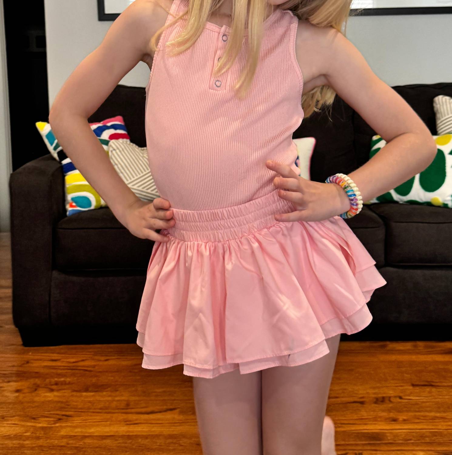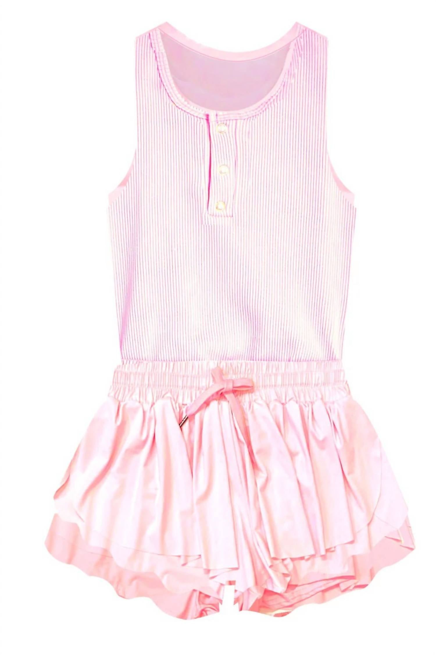 The Tractr Girls' Dance Romper in pink is a delightful one-piece designed for stylish movement and comfort. Featuring a racerback tank top made from a 95% nylon and 5% spandex blend, paired with flowy satin butterfly-style shorts, this romper is perfect for energetic adventures. The shorts include an elastic waistband with a drawstring for added comfort, allowing for carefree play. Care instructions include machine washing cold inside out and line drying, ensuring easy maintenance. Perfect for vacations, athleisure looks, or even Valentine's Day events, this romper combines flair and functionality seamlessly.