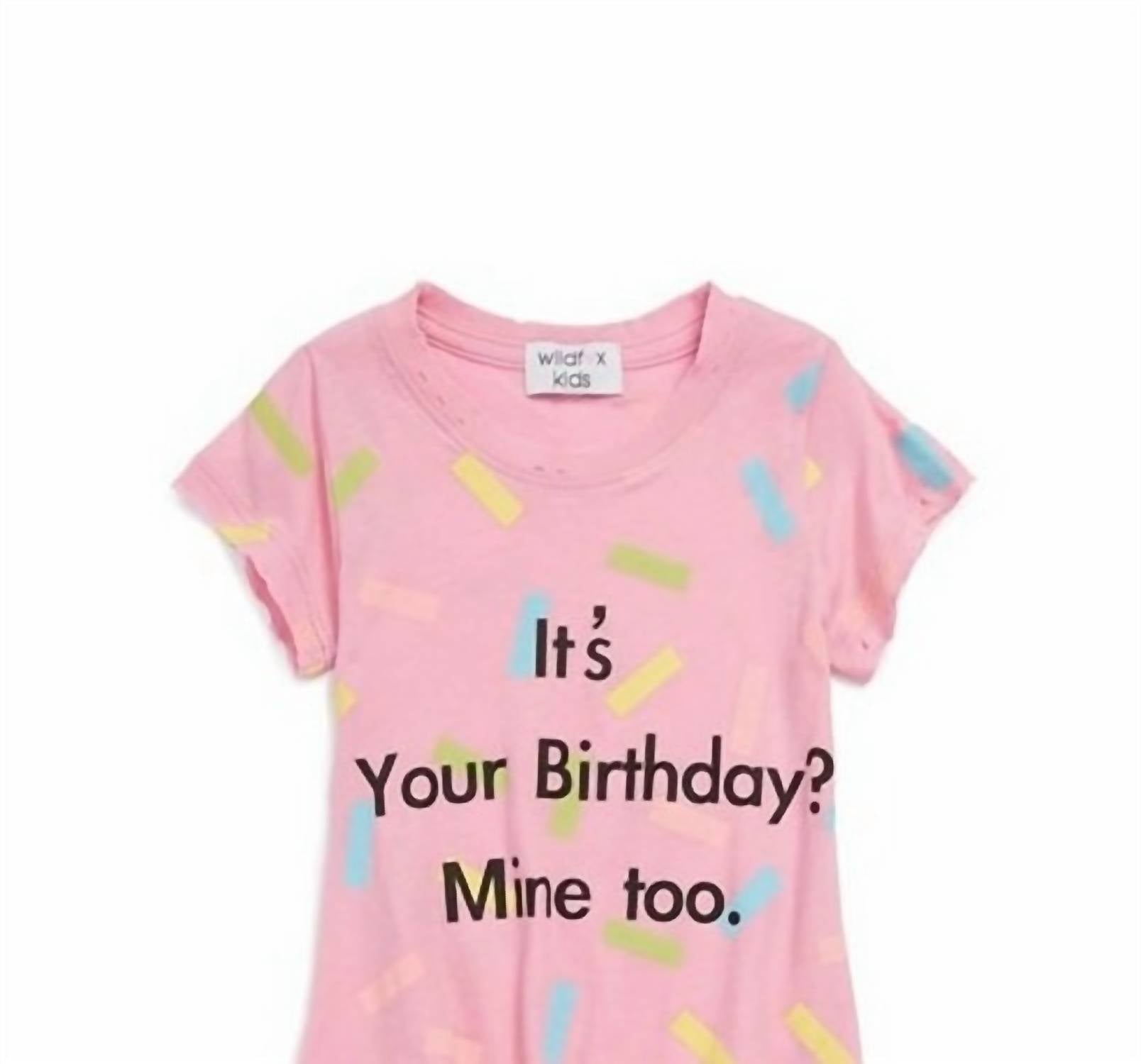 Celebrate with the Girls It's Your Birthday? Mine Too T-shirt by WILDFOX, featuring a playful multi-colored sprinkles and statement print. Crafted with short sleeves and a crewneck for a comfortable fit, this tee is perfect for a festive summer occasion. Made in a fun pink hue, it captures a minimalist trend that's sure to make a statement. Care: Machine wash.