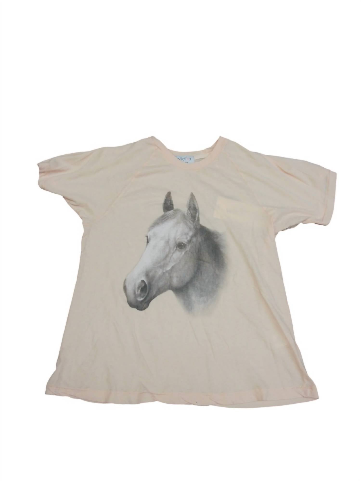 The WILDFOX Kids' Horse T-shirt in Peach is a charming addition to any young girl's wardrobe, perfect for casual outings or Thanksgiving gatherings. This short sleeve tee showcases a captivating graphic of a large, detailed horse head illustration on the front, adding a playful touch. Easy to maintain, it is machine washable, ensuring convenience for busy families.