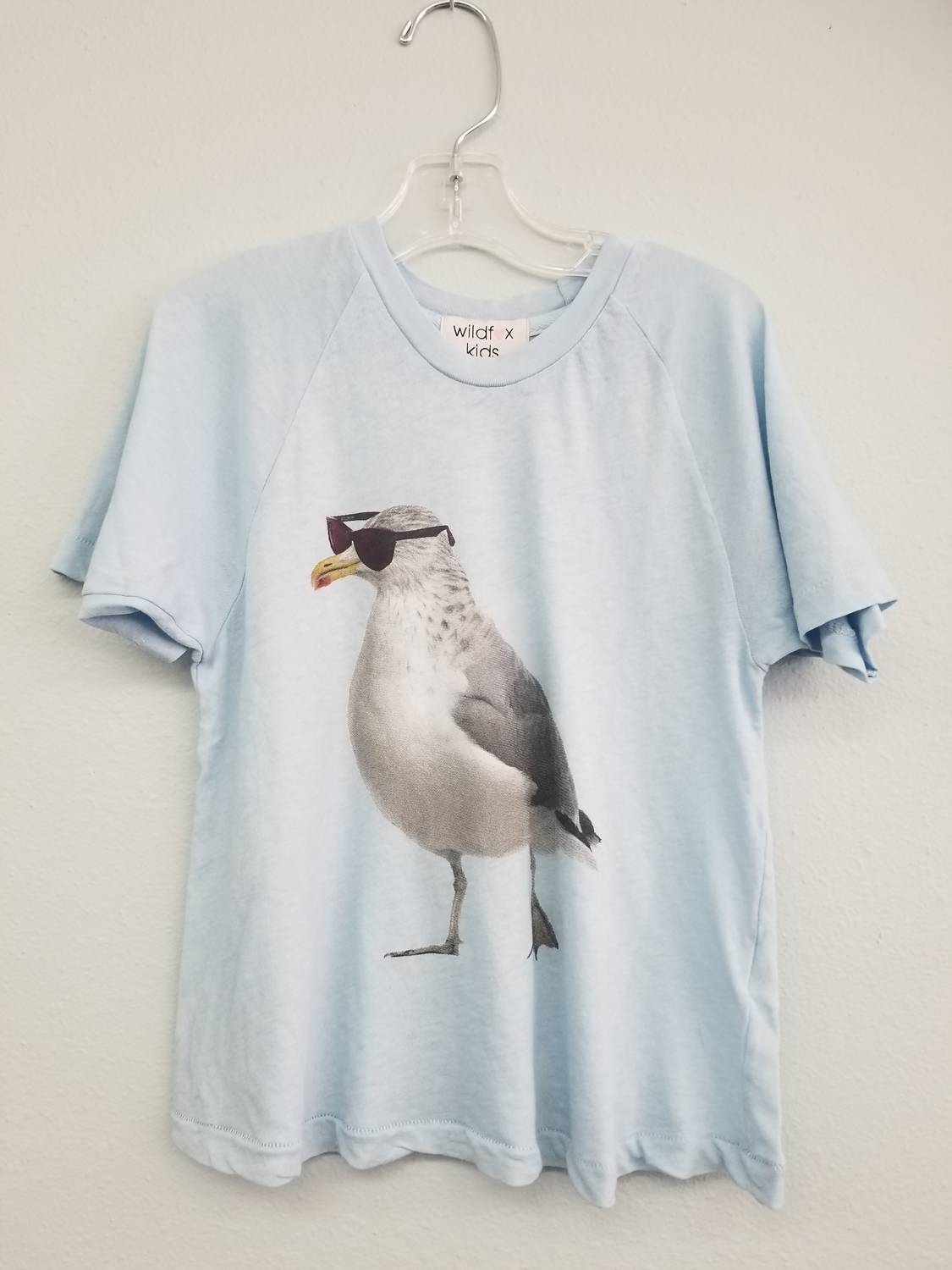 The Kids T-shirt With Seagull Print by WILDFOX is a charming addition to any girl's back-to-school wardrobe. Designed with short sleeves, this blue tee features a playful seagull graphic on the front. Perfect for summer, it embraces a minimalist trend with its simple yet stylish crewneck. Care is easy with machine wash instructions, ensuring it stays fresh for every wear.
