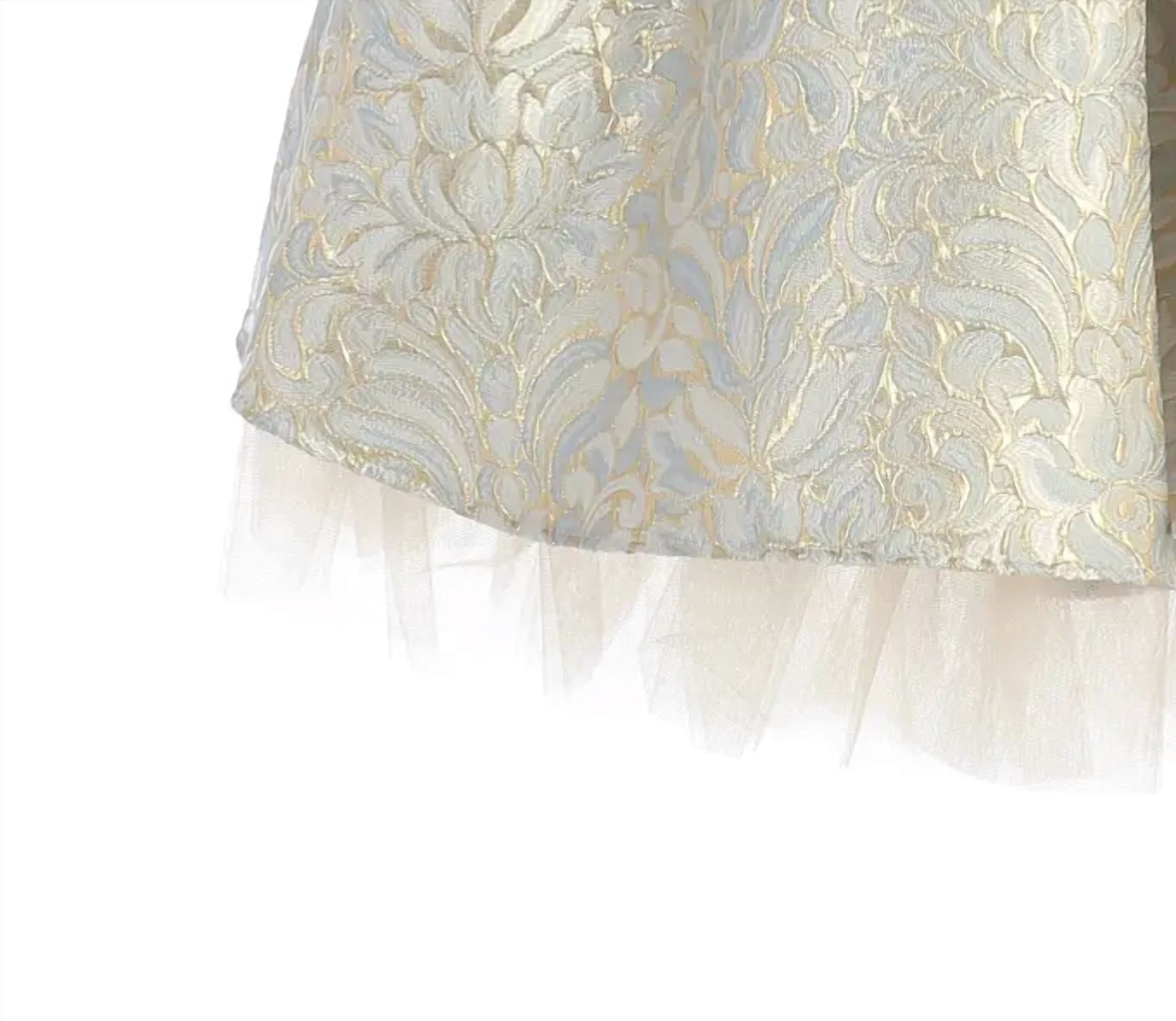 Presenting the Girl's Child Pleated Special Occasion Dress by Sweet Kids, designed to make your little one feel regal. This formal dress, adorned with a vintage-inspired gold leaf print jacquard, is crafted from high-quality polyester in baby blue and gold. It features playful peek-a-boo tulle details, perfect for church gatherings or Thanksgiving celebrations. Ideal for springtime events, this patterned dress turns any occasion into a memorable affair.