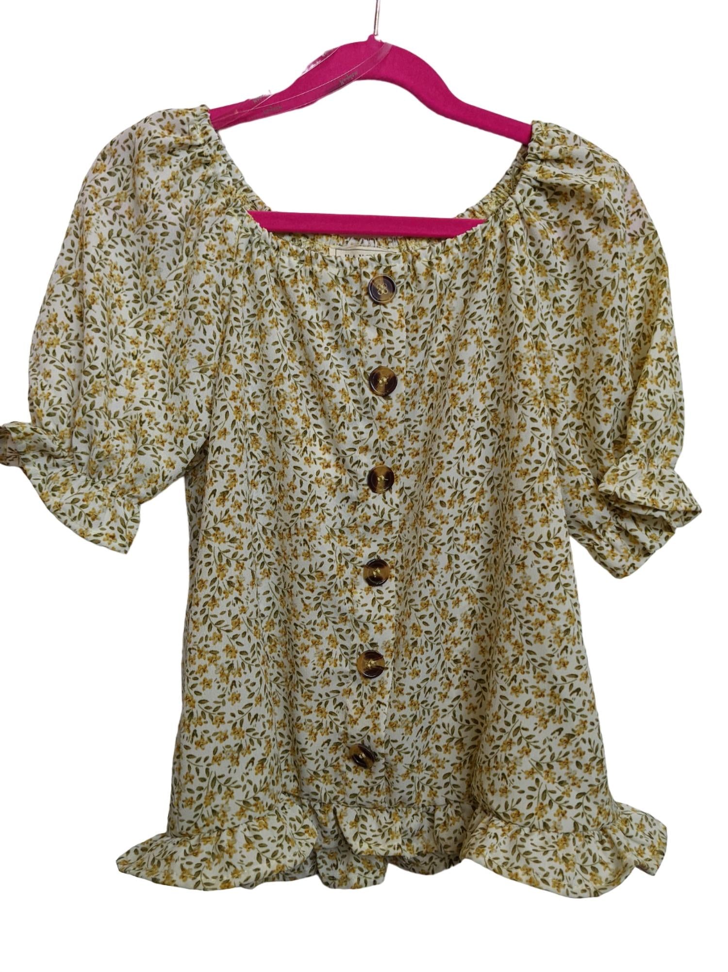 Floral printed fabric. Front button closure. 100% polyester. Hand wash cold and hang dry.