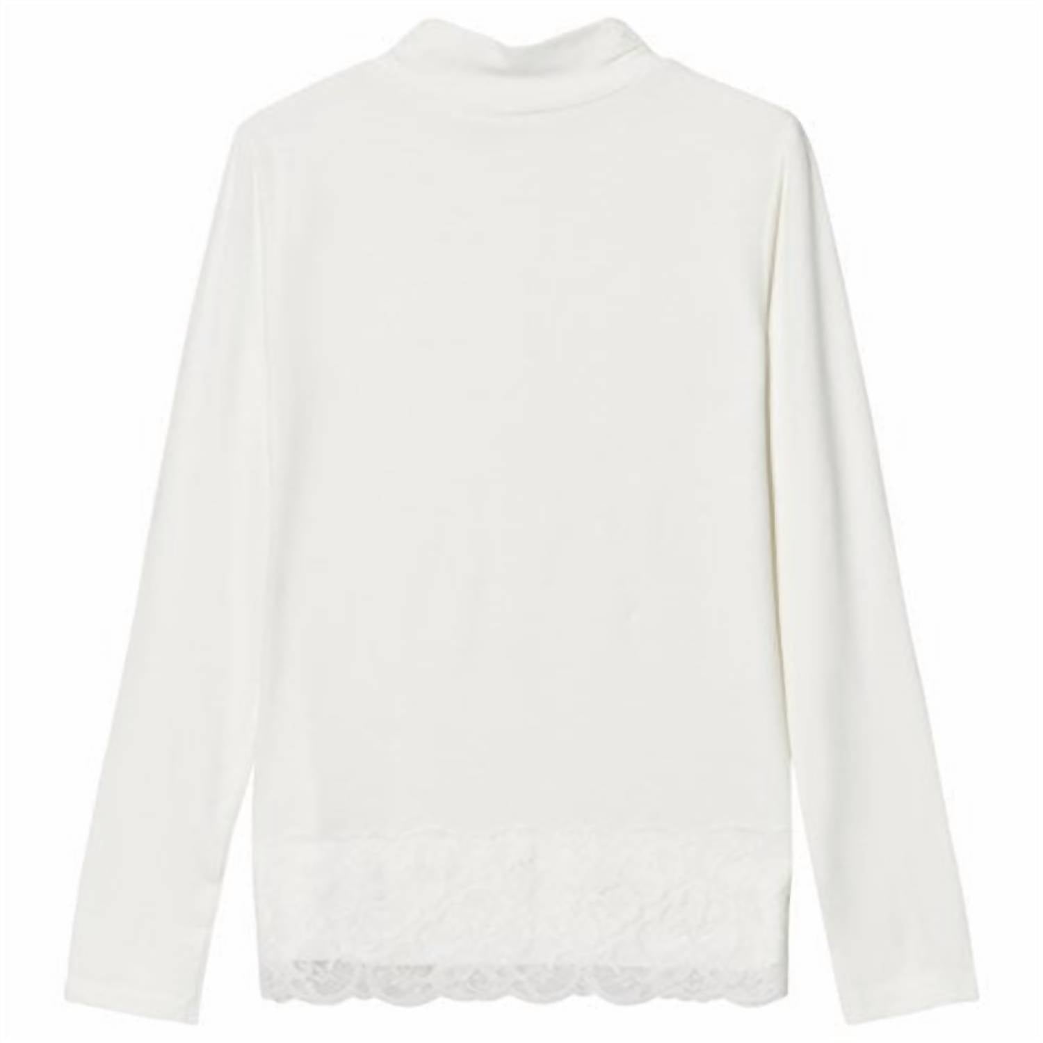 Introducing the Girl's Studded Turtleneck Tee by Mayoral, a chic piece perfect for fall layering with a vintage twist. This long sleeve tee is made from a blend of 95% Viscose and 5% Elastane, offering a soft and stretchy fit in a solid cream hue. Featuring a lace trim on the hem and detailed with gold star and circular-shaped studs beneath the chest, this pull-on design adds a touch of flair to any wardrobe. Care: Machine wash cold, do not bleach, lay flat to dry, cool iron, and avoid dry cleaning.