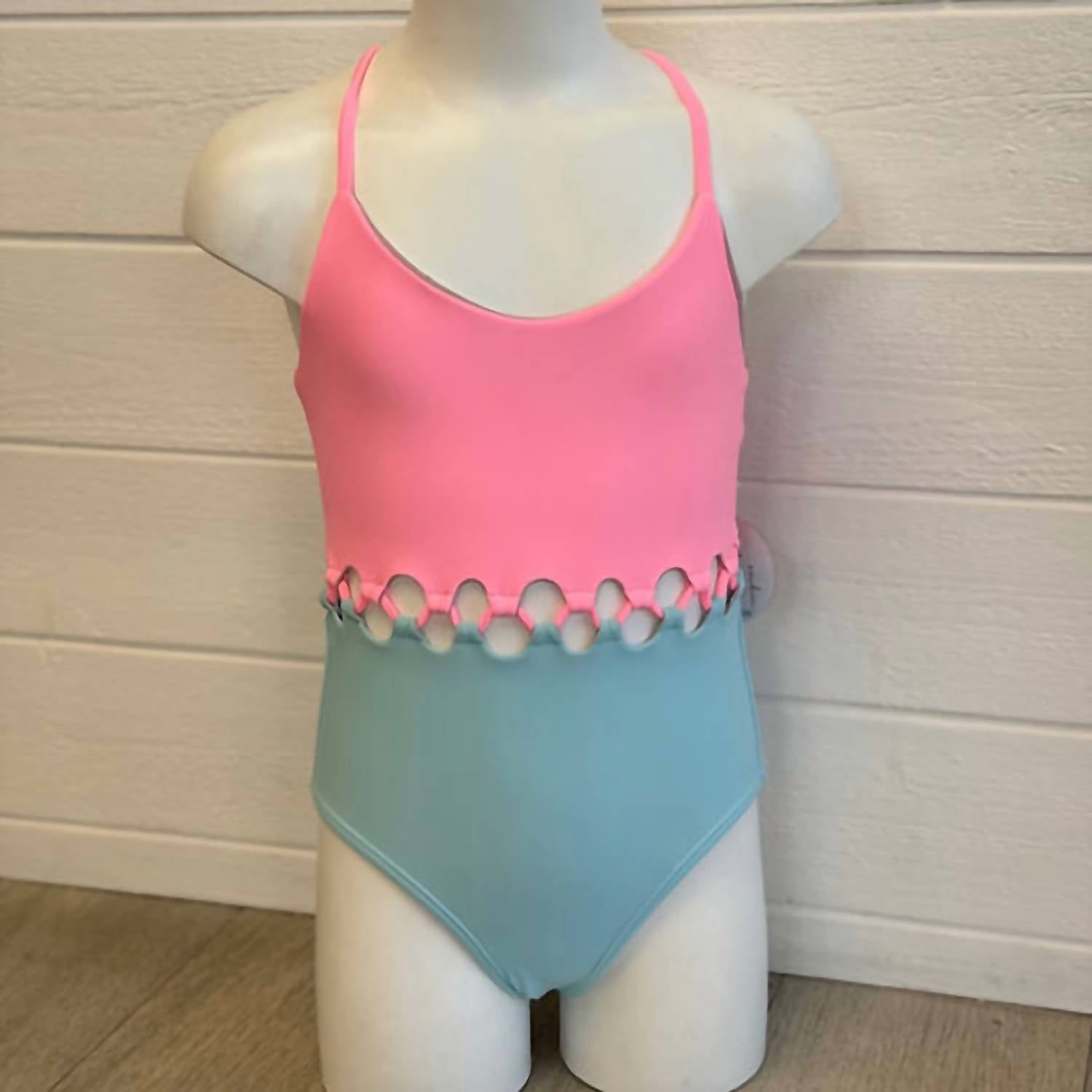 Elevate your little one's swimwear collection with the Girl's Cammy Loop One Piece by PQ Swim. This adorable swimsuit features a charming color contrast with a playful pink top and a serene light blue bottom, complemented by a cute loop design at the center. Made from 78% polyamide and 22% elastane, it offers a comfortable and flexible fit. Care for this delightful piece by hand washing cold and line drying.